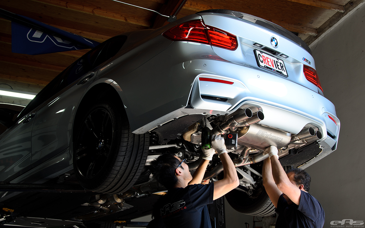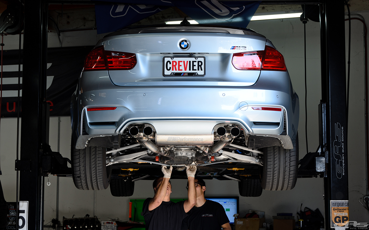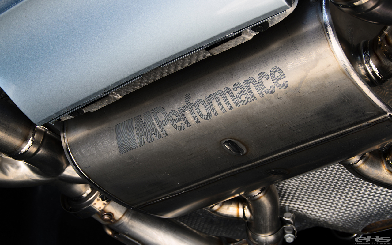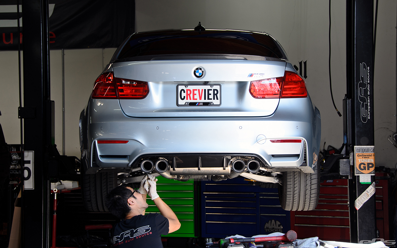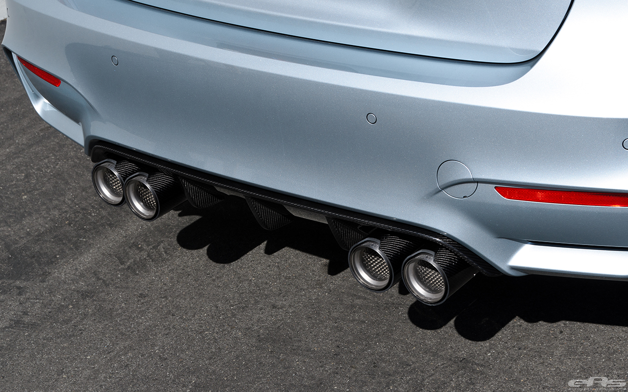 So armed with a series of M Performance Parts, European Auto Source began working on this Silverstone Metallic BMW F82 M4. First, the owner decided that it needs a louder exhaust system and some carbon fiber parts added. The shop installed the lightweight M Performance titanium exhaust system which weighs in at just under 45lbs, providing weight savings and a louder exhaust note as well.