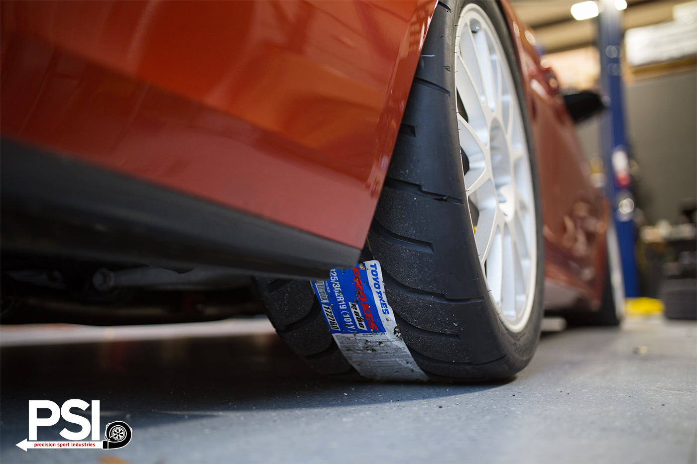 These CCW wheels come in sizes of 19×10 and 19×11 in the front and rear, respectively. They are wrapped in Toyo R888 rubber, providing the performance vehicle with some improved grip and better handling. The wheels pictured are a track only setup made to clear these Brembo BBK brakes and is the widest setup available. The wheels are painted with brushed aluminum that has been shot peened and clear anodized.