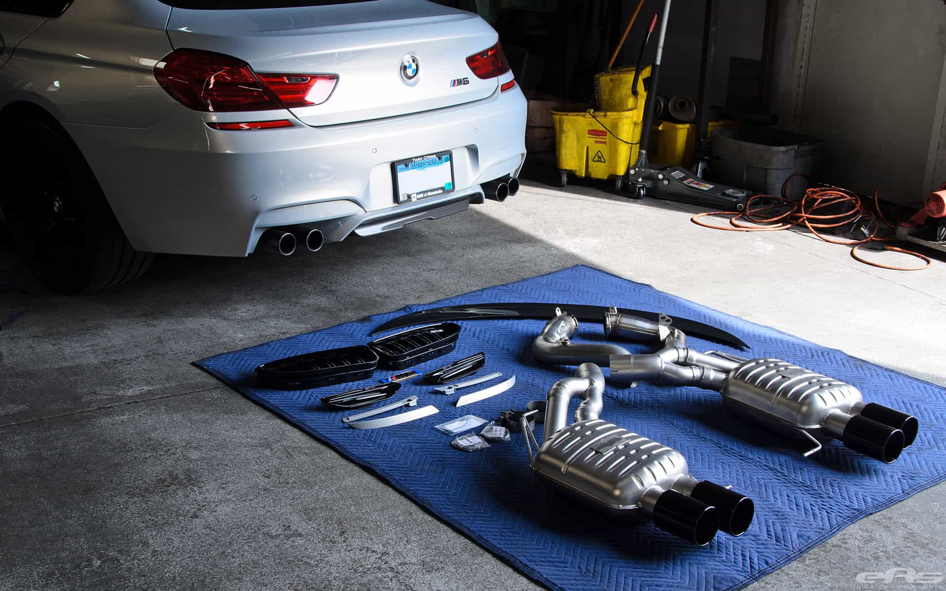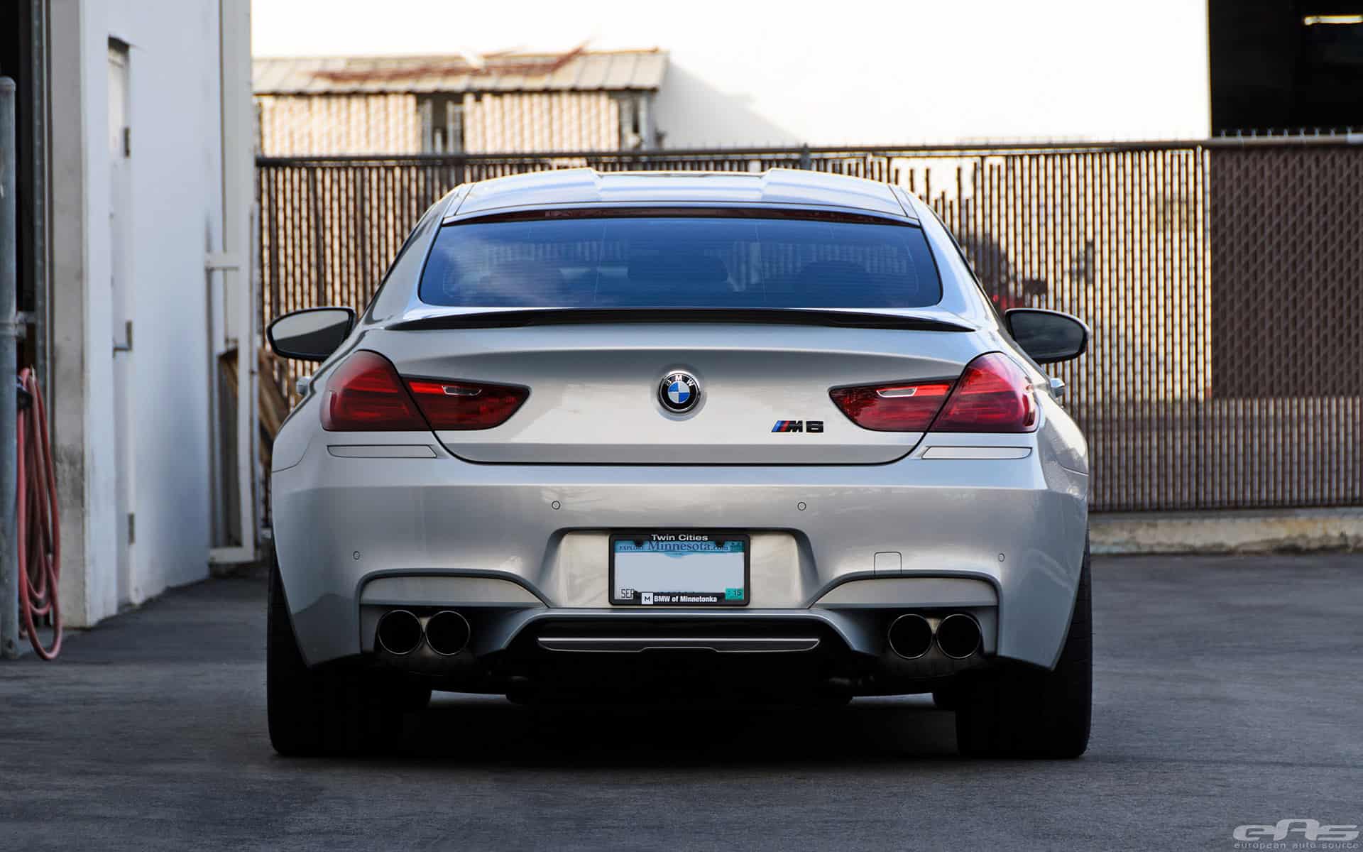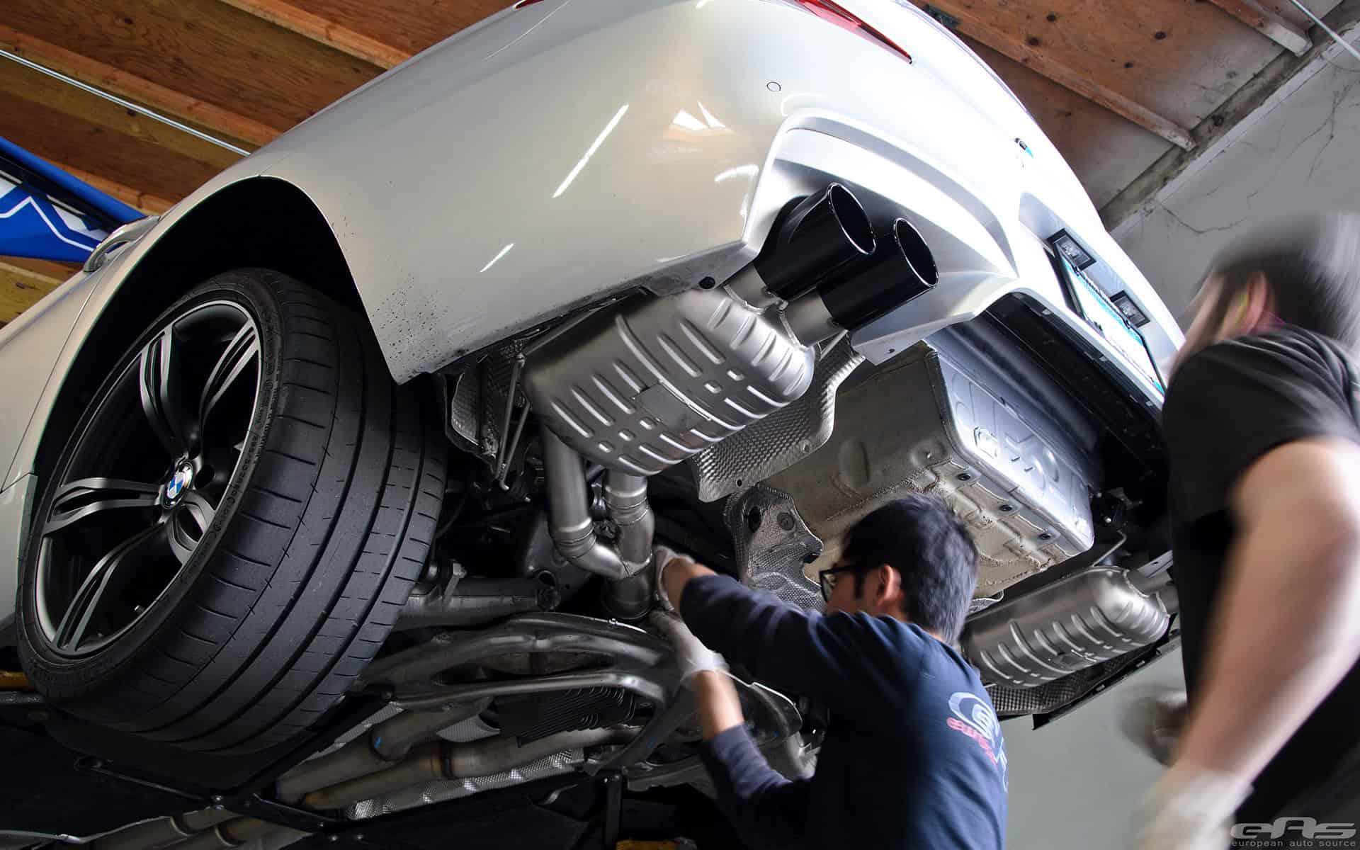 This Moonstone Metallic M6 Gran Coupe was at European Auto Source to receive cosmetic parts and some sound upgrades. A full custom exhaust system is what really gives this car the sound to go with its aggressive looks. In this case, the exhaust system comes from Eisenmann (combined with AMS S63Tu Catless Downpipes) and their race inspired system works fits perfectly the M6 Coupe, Convertible and Gran Coupe.