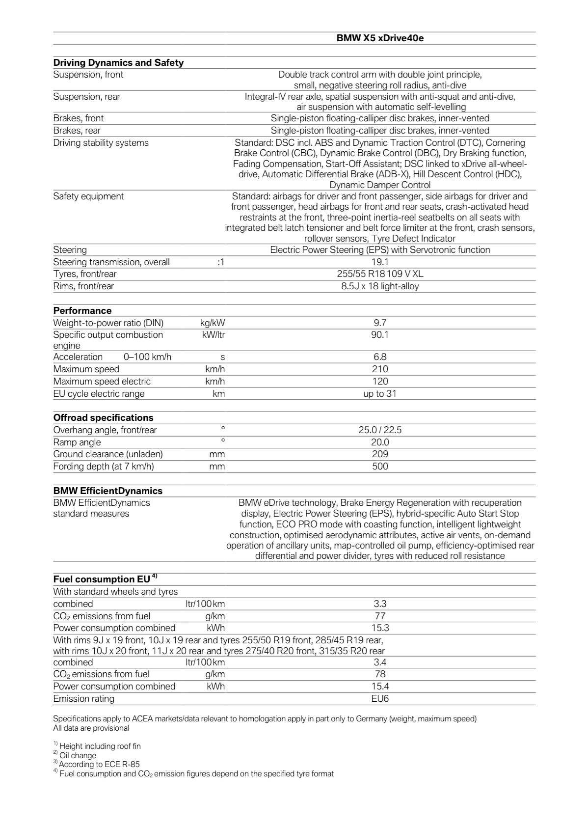 Permanent all-wheel drive and the BMW EfficientDynamics eDrive technology endow the BMW X5 xDrive40e with sensational sportiness and supreme poise on the one hand and outstanding efficiency on the other. The vehicle comes with a total system output of 230 kW/313 hp generated by a four-cylinder petrol engine with BMW TwinPower Turbo technology and a synchronous electric motor.