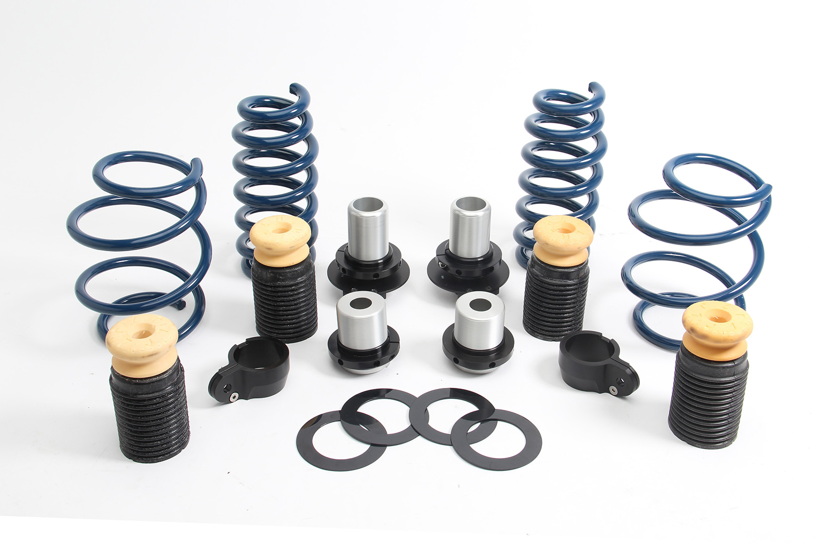 The springs combined with progressive bump stops and other components increase travel that allows the car to be lowered up to 1″ in the front and 1 1/2″ in the rear, with spring rates being increased by 50% in the front and 10% in the rear. Suspension packers are included to fine tune handling and comfort by changing the clearance of the progressive bump-stops, something no respectable performance car is without. Components are machined from 6061-T6 aluminum and black anodized for appearance and corrosion protection. Dinan will guarantee you superior handling, performance, and comfort.