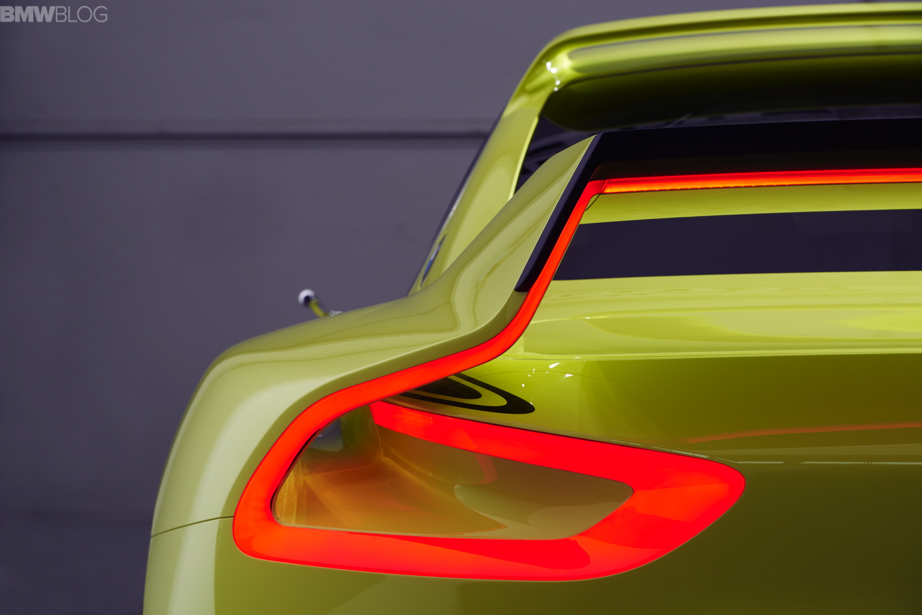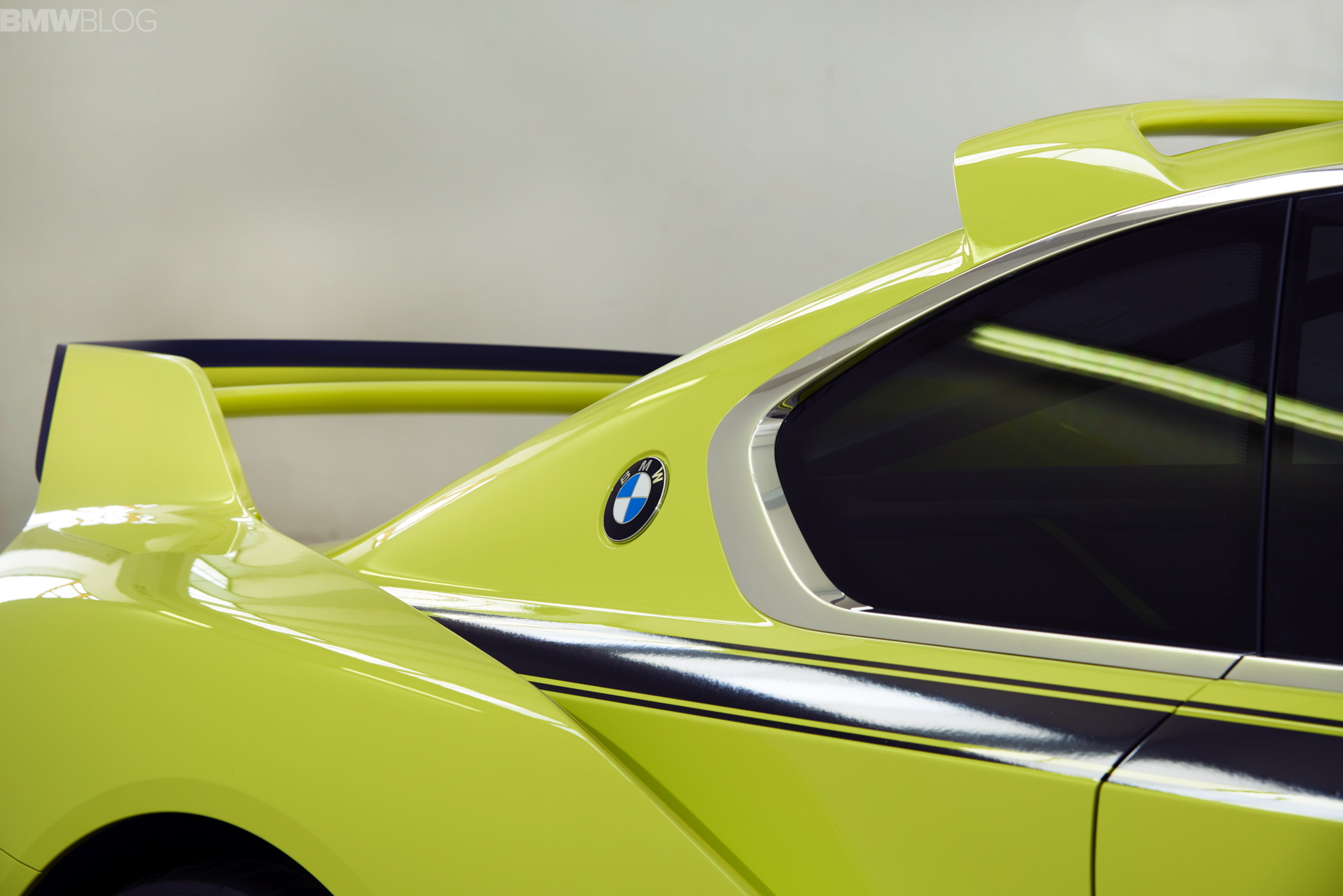 From the front end, a continuous horizontal line runs the sides of the car. In profile, this line is seen across the entire length of the long wheelbase, giving the car a long, low and sleek look. Dark CFRP (Carbon Fiber Reinforced Plastic) sideskirts lend a visual gap between the bright yellow color of the bodywork and the pavement below. While the low hood and roofline, combined with the massive 21” wheels give the CSL Hommage a very low looking stance. You’ll also notice the side-mounted exhaust pipes mounted just in front of the rear wheels. The CSL Hommage even has BMW Roundels mounted at the base of the C Pillars, a throwback to the same design on the original CSL.