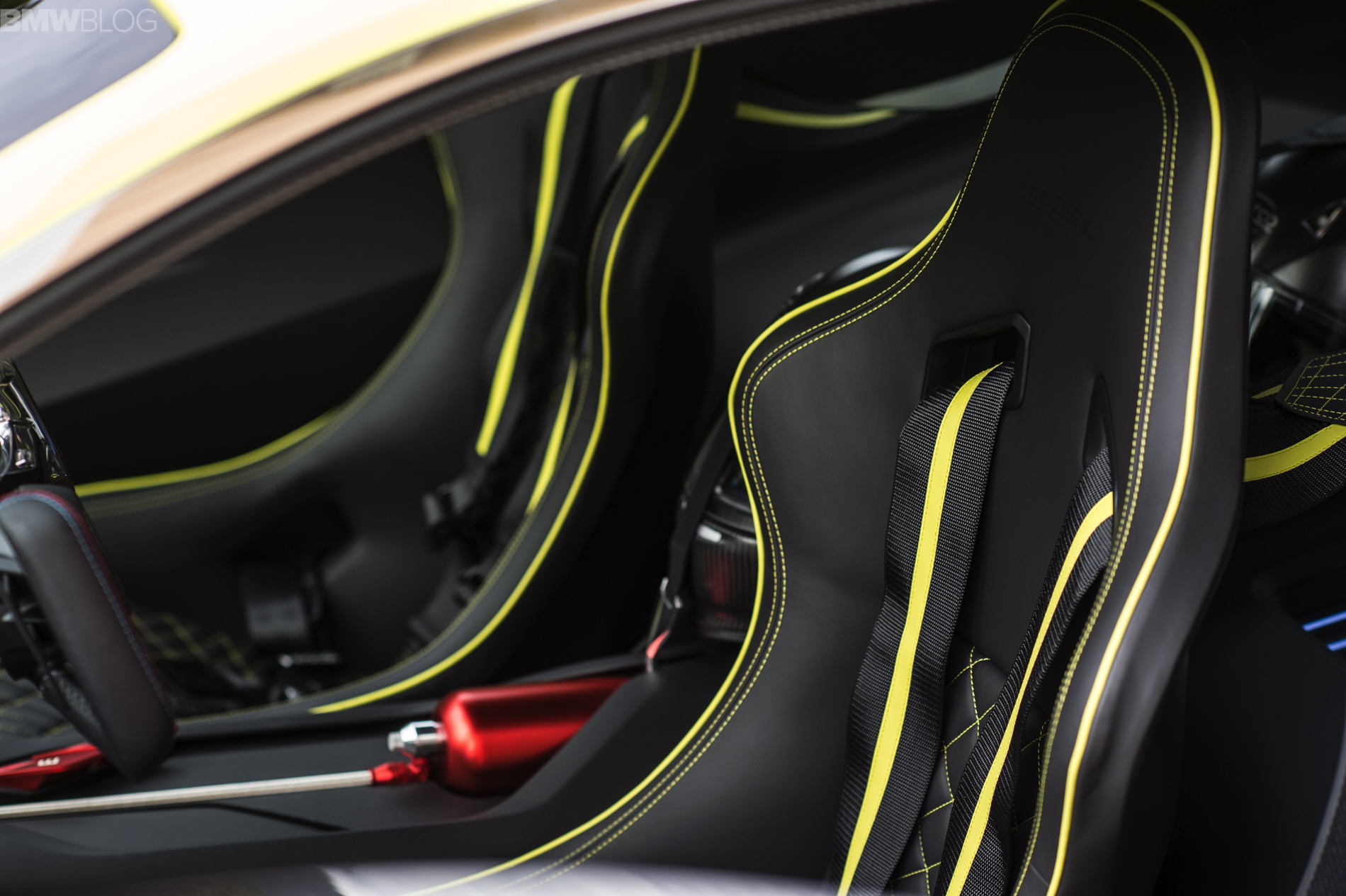 Other racing features include bucket seats with high-quality stitching, a six-point belt and red anodised safety features such as the outlet nozzles for the extinguishing foam, the fire extinguisher itself, and the two switches on the centre console for the emergency shut-off and fire extinguishing mechanism.