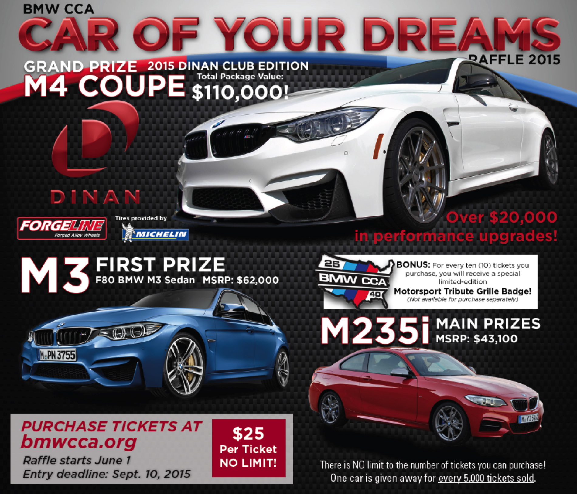 BMW CCA Car Of Your Dreams Raffle ticket sales will begin on June 1. Tickets can be purchased by BMW CCA members at bmwcca.org/raffle for $25 each, which provide a 1-in-5,000 chance of winning a prize. The Grand Prize will be the Dinan Club Edition M4; the First Prize is a new M3 (F80), and the Main Prizes will be the hot new M235i.