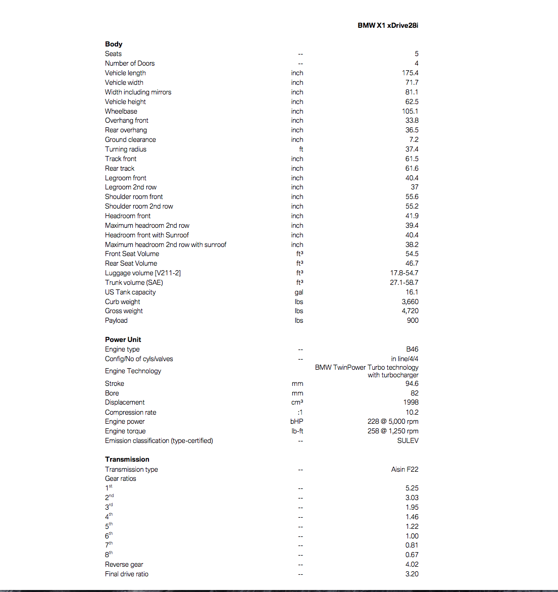 Engine options for the new 2016 BMW X1 will be a bunch of 2.0 liters, two petrol and two diesel. There will be an X1 xDrive20i, xDrive25i, xDrive18d and xDrive25d as well as an sDrive20i which will be front-wheel drive. All engines will displace 2.0 liters and all will feature BMW’s TwinPower turbocharger technology. The xDrive25i and xDrive25d have 231 horsepower, but the petrol engine will have 258 lb-ft of torque and the diesel will have 332 lb-ft. An Aisin eight-speed automatic will be standard on most models, with the xDrive18d being available with a newly designed six-speed manual.