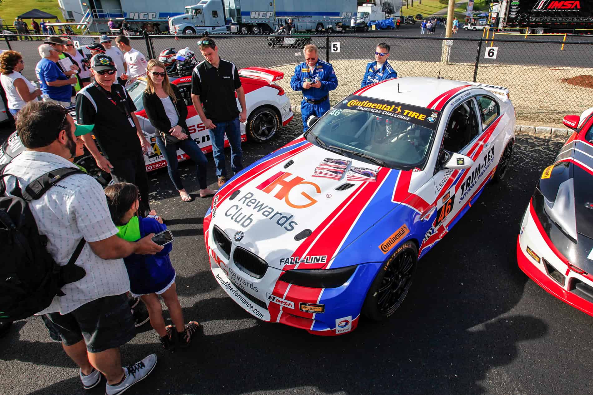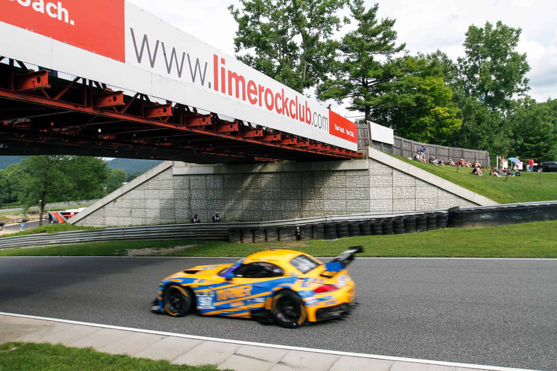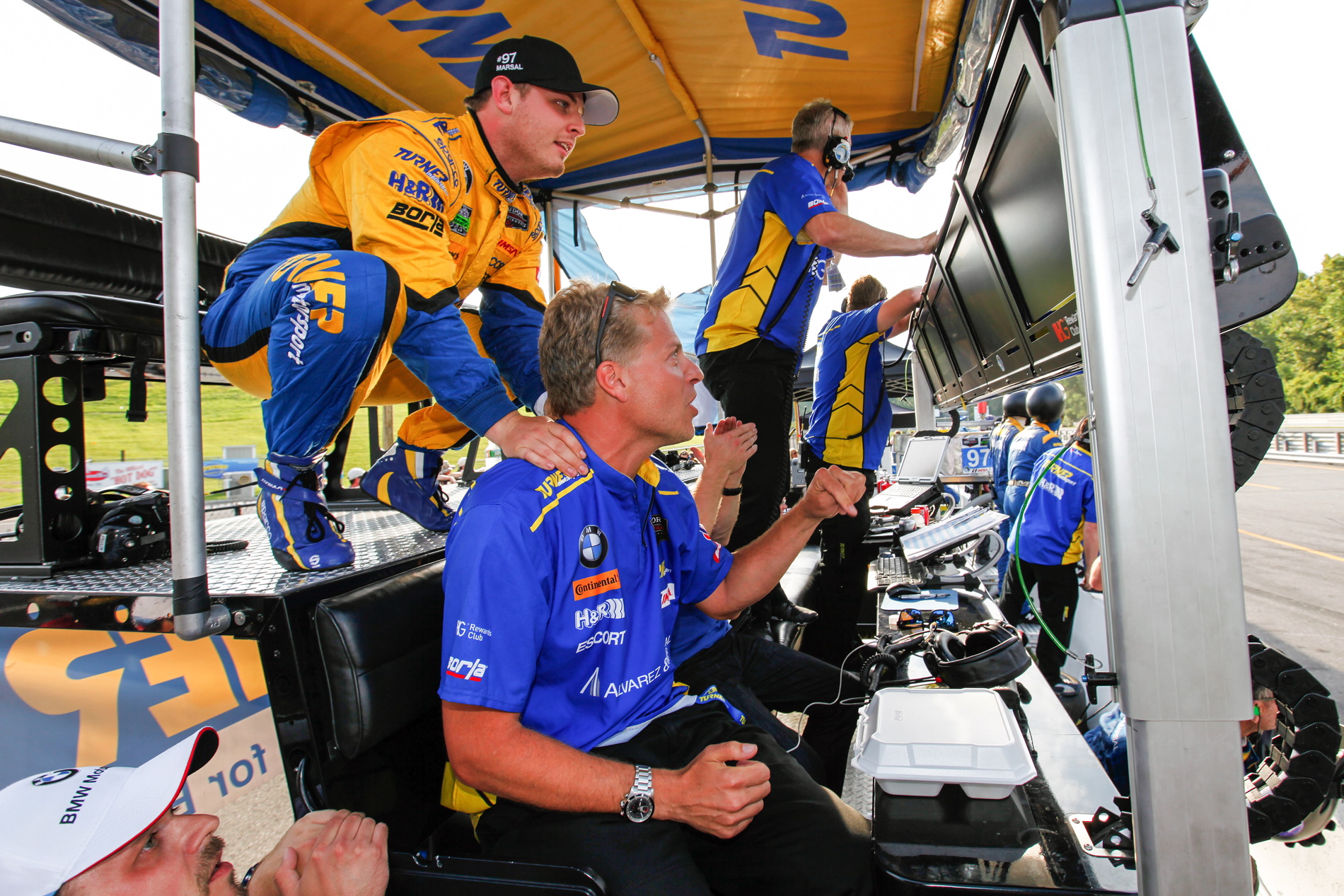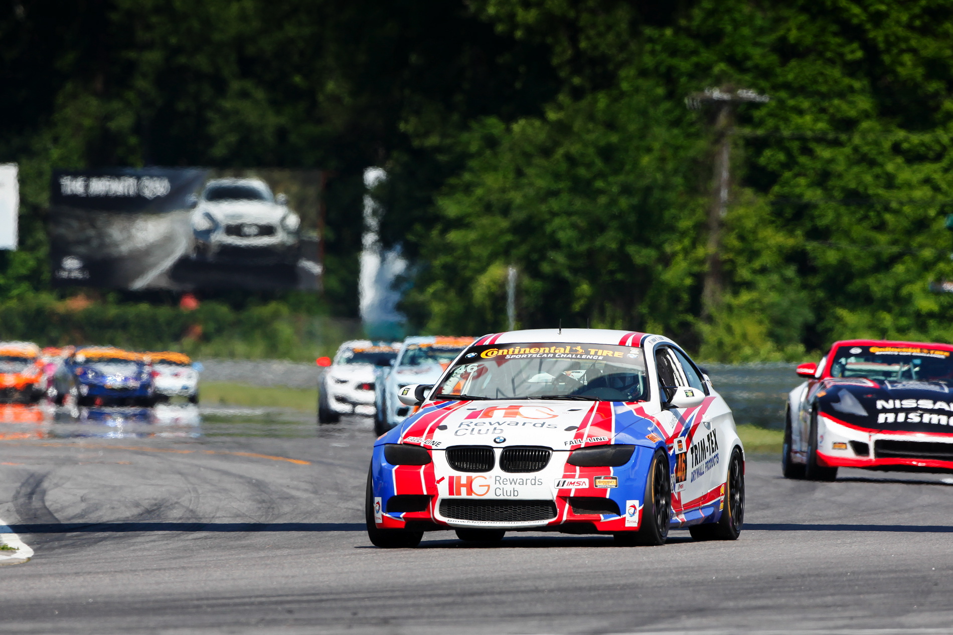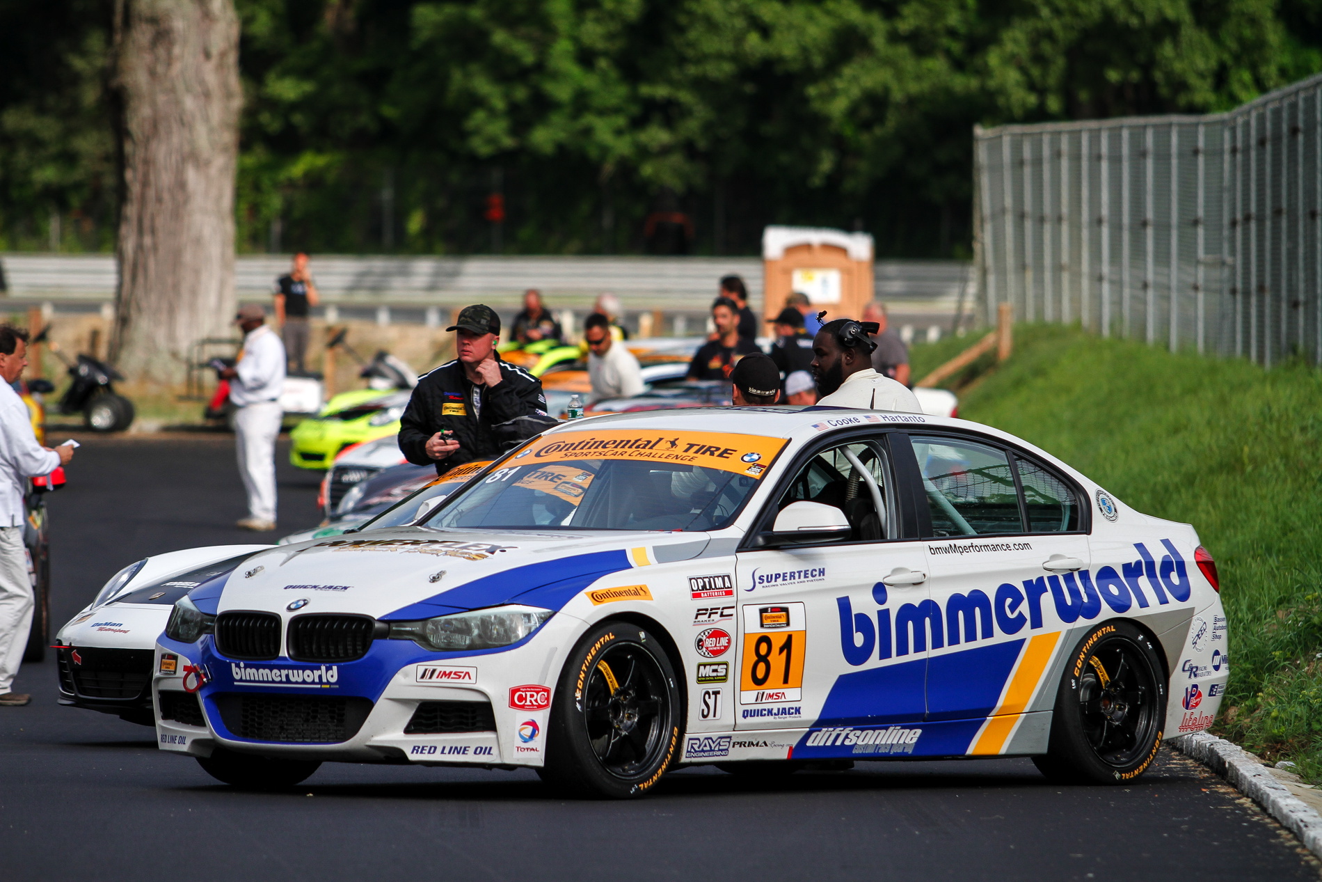 After the green flag waved in Saturday’s two-hour Continental Tire Sports Car Challenge race at Lime Rock Park, in Lakeville, Conn. it took only 59 seconds for the first caution period to occur. Unfortunately, the cause was contact to the rear of Ashley Freiberg’s No. 46 BMW M3 in the middle of Grand Sport class competitor scrum that forced her on the wet grass, then into and almost over the turn four tire wall. For the second consecutive race BMW Motorsport driver Trent Hindman was unable to drive.
