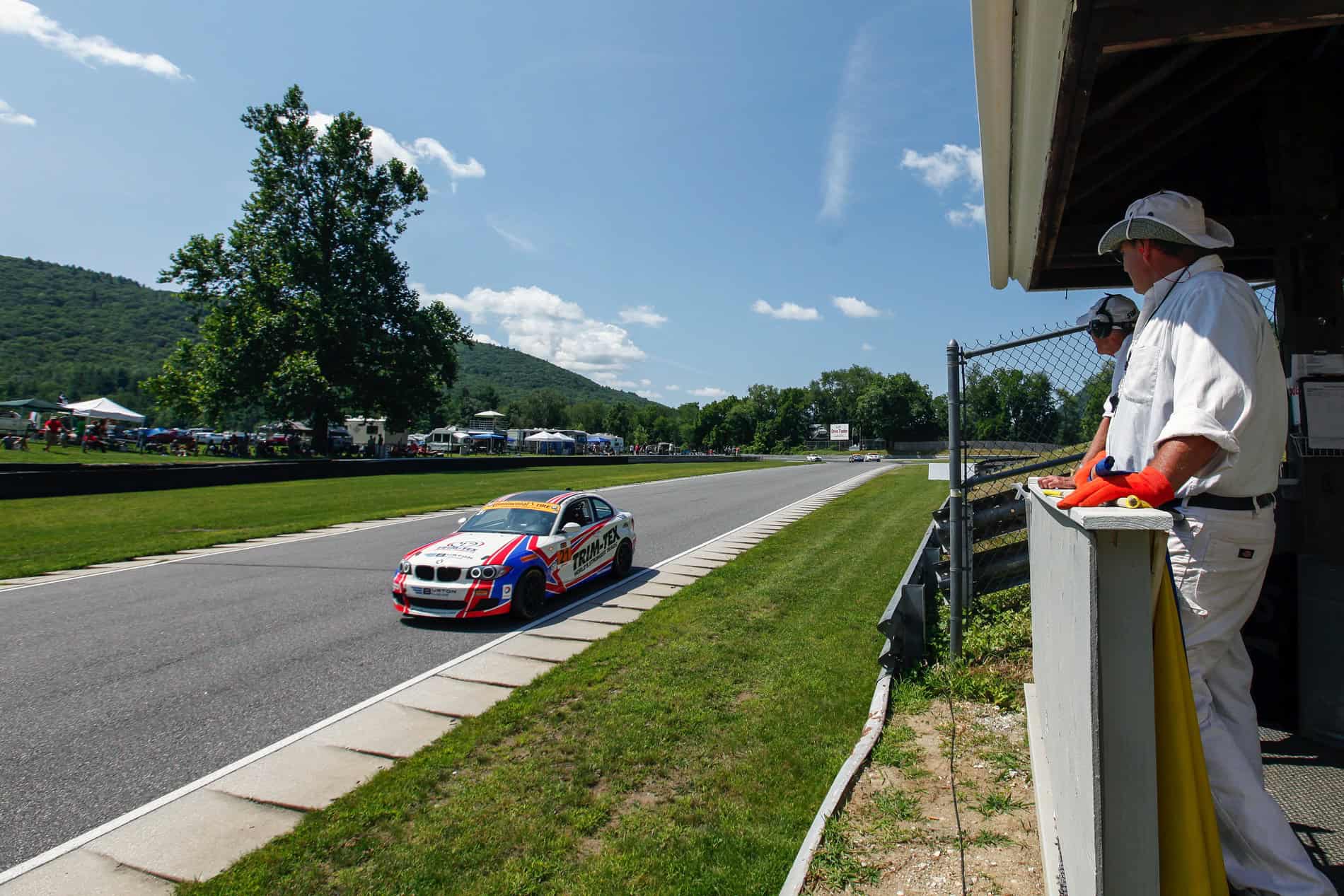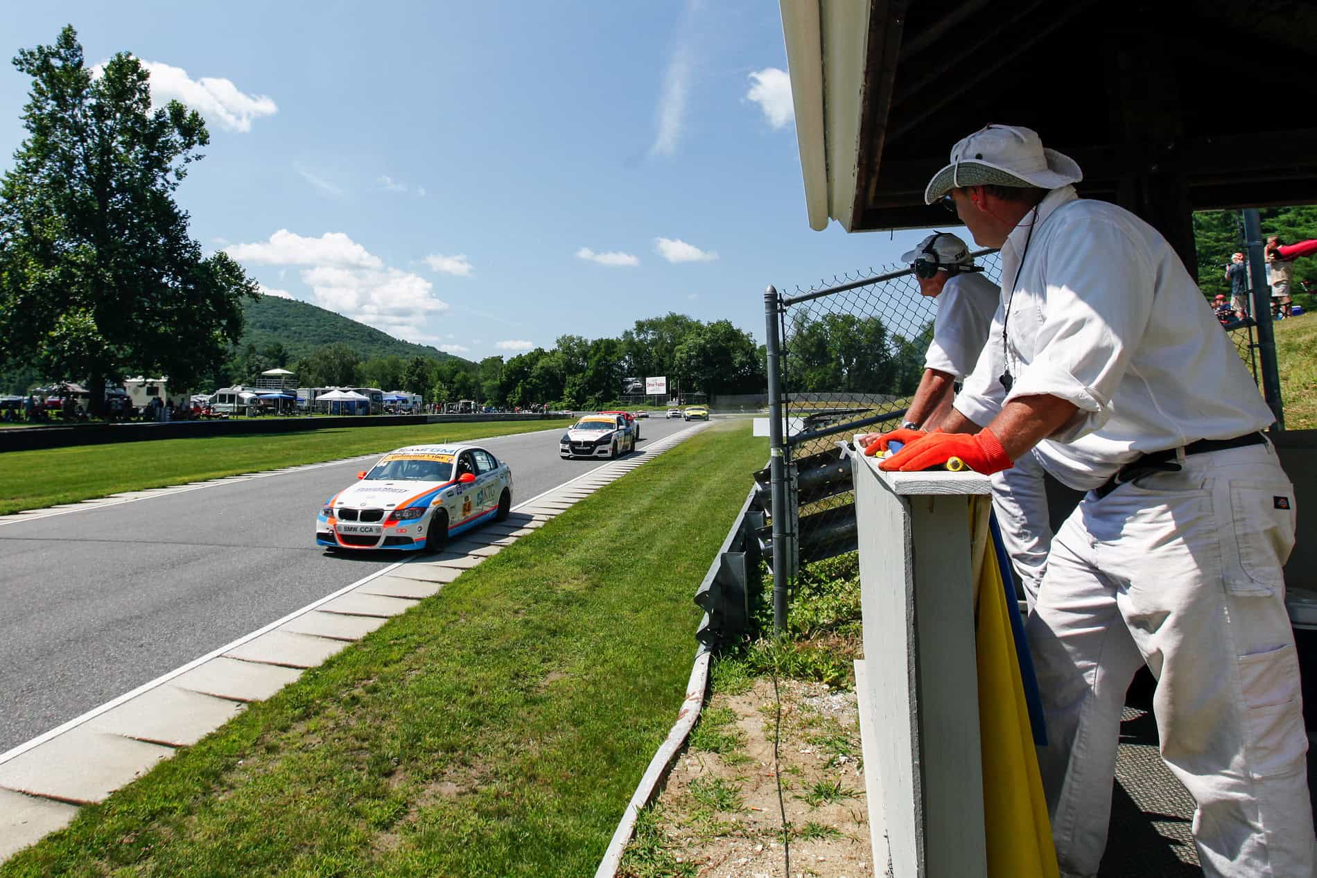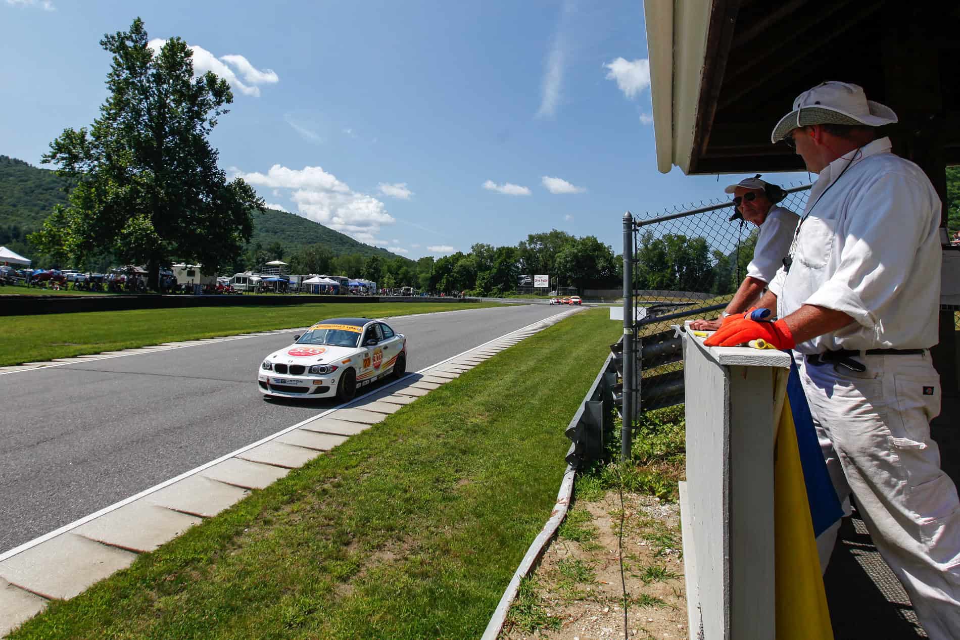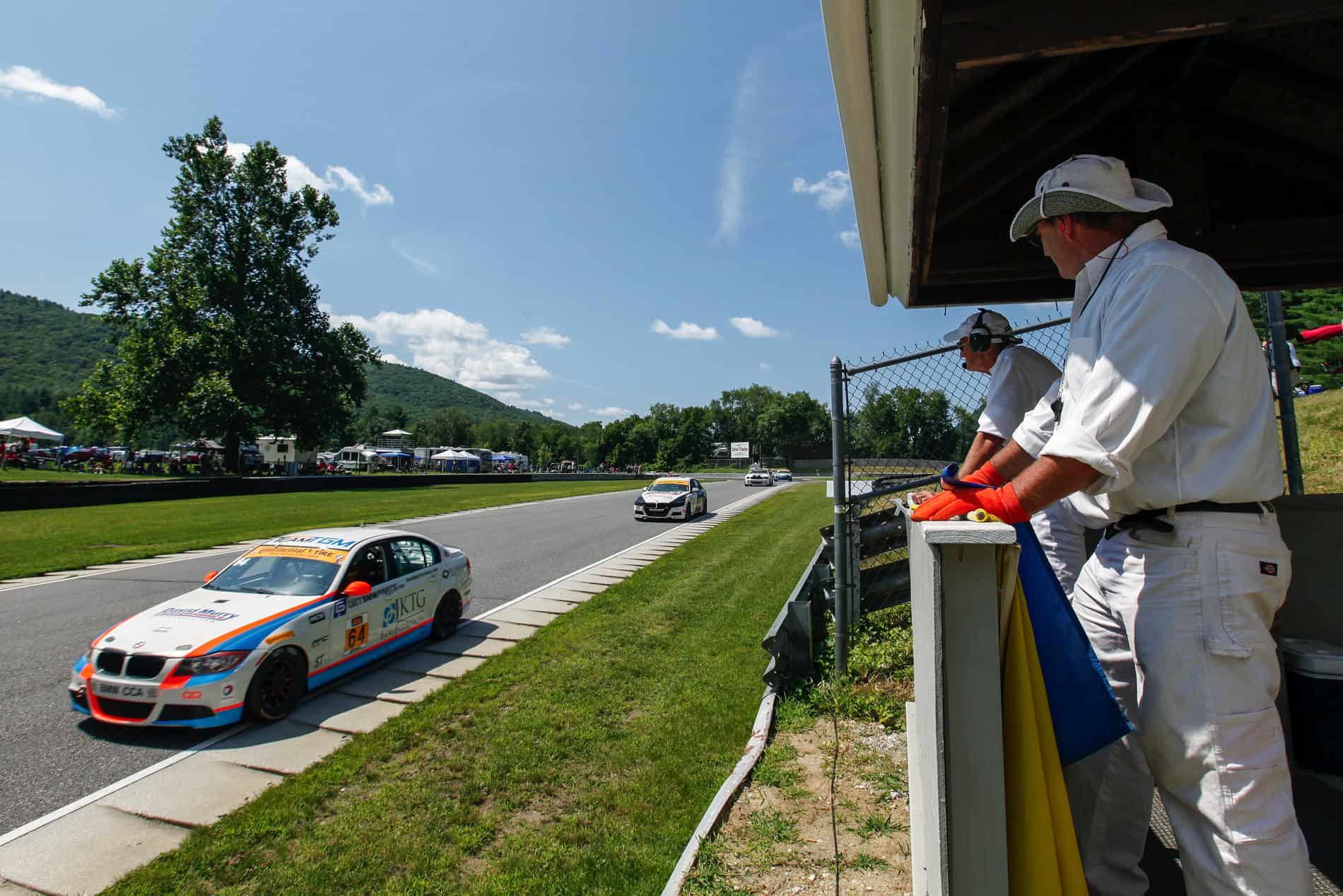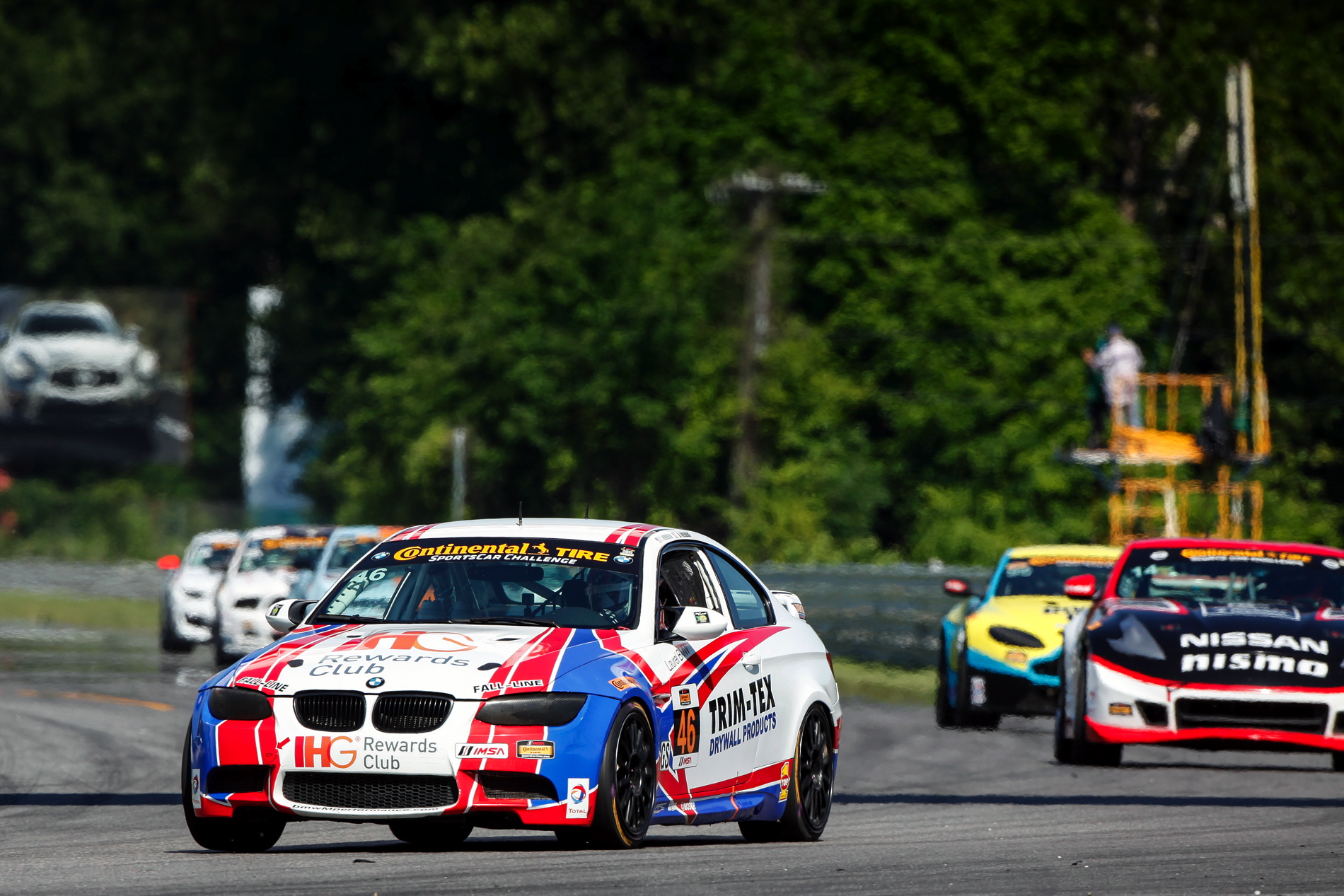 After the green flag waved in Saturday’s two-hour Continental Tire Sports Car Challenge race at Lime Rock Park, in Lakeville, Conn. it took only 59 seconds for the first caution period to occur. Unfortunately, the cause was contact to the rear of Ashley Freiberg’s No. 46 BMW M3 in the middle of Grand Sport class competitor scrum that forced her on the wet grass, then into and almost over the turn four tire wall. For the second consecutive race BMW Motorsport driver Trent Hindman was unable to drive.