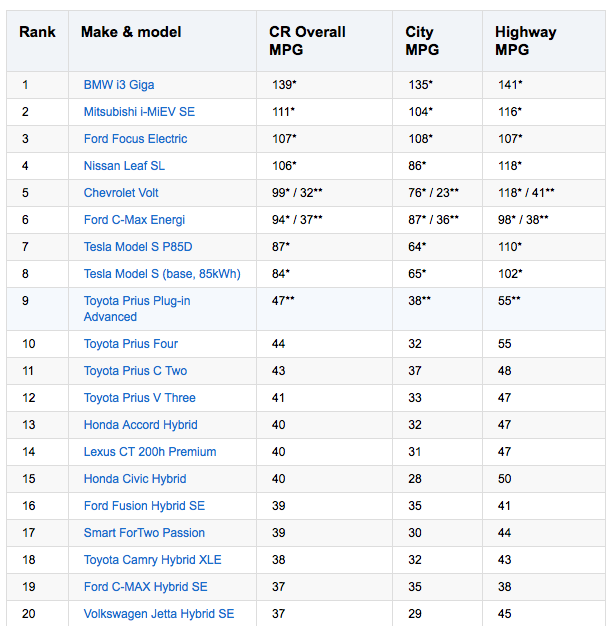 Back in February, Consumer Reports published a list of the most fuel-efficient cars sold in the United States. At the top of the pack was placed the BMW i3 REx with an overall MPG or, eMPG in this case, of 139 miles. The publication has updated the list and the i3 is being placed first once again. The Mitsubishi i-MiEV SE with 111 MPG and the Ford Focus Electric with 107 MPG follow i3’s lead.
