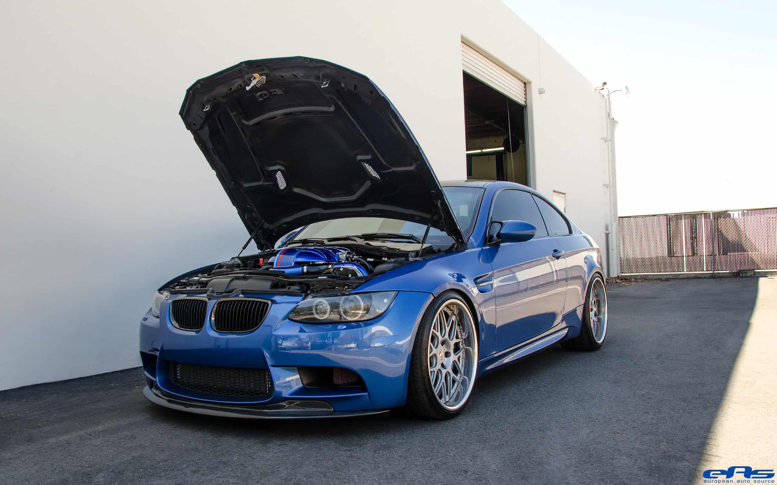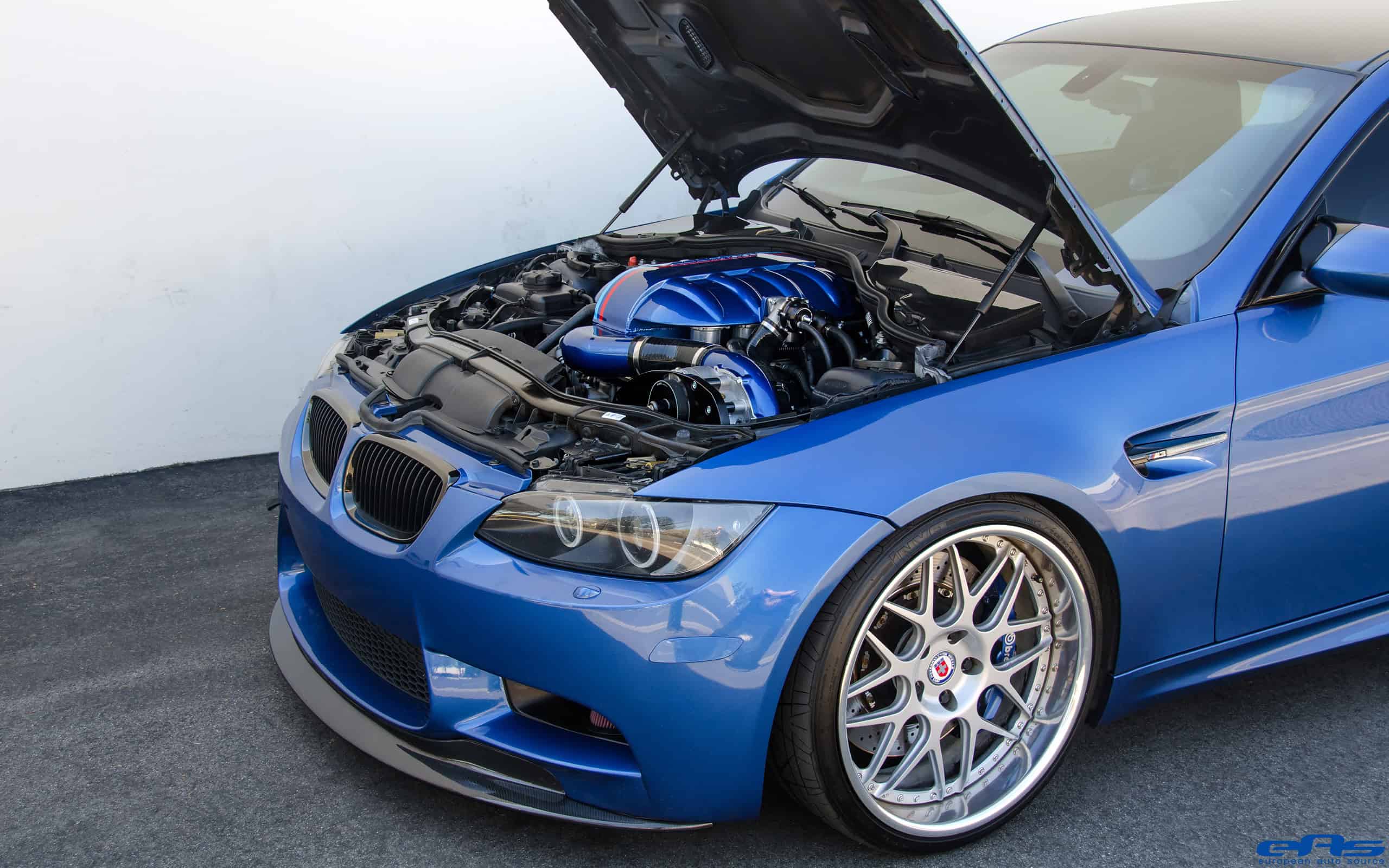 After you lift the aluminum hood, you’ll be greeted with a beautifully painted ESS VT2-625 supercharger system. This gives the BMW E92 M3 for an increase in horsepower and torque, yielding not so much faster acceleration but overall driving dynamics, cornering speed and overall performance of the vehicle.