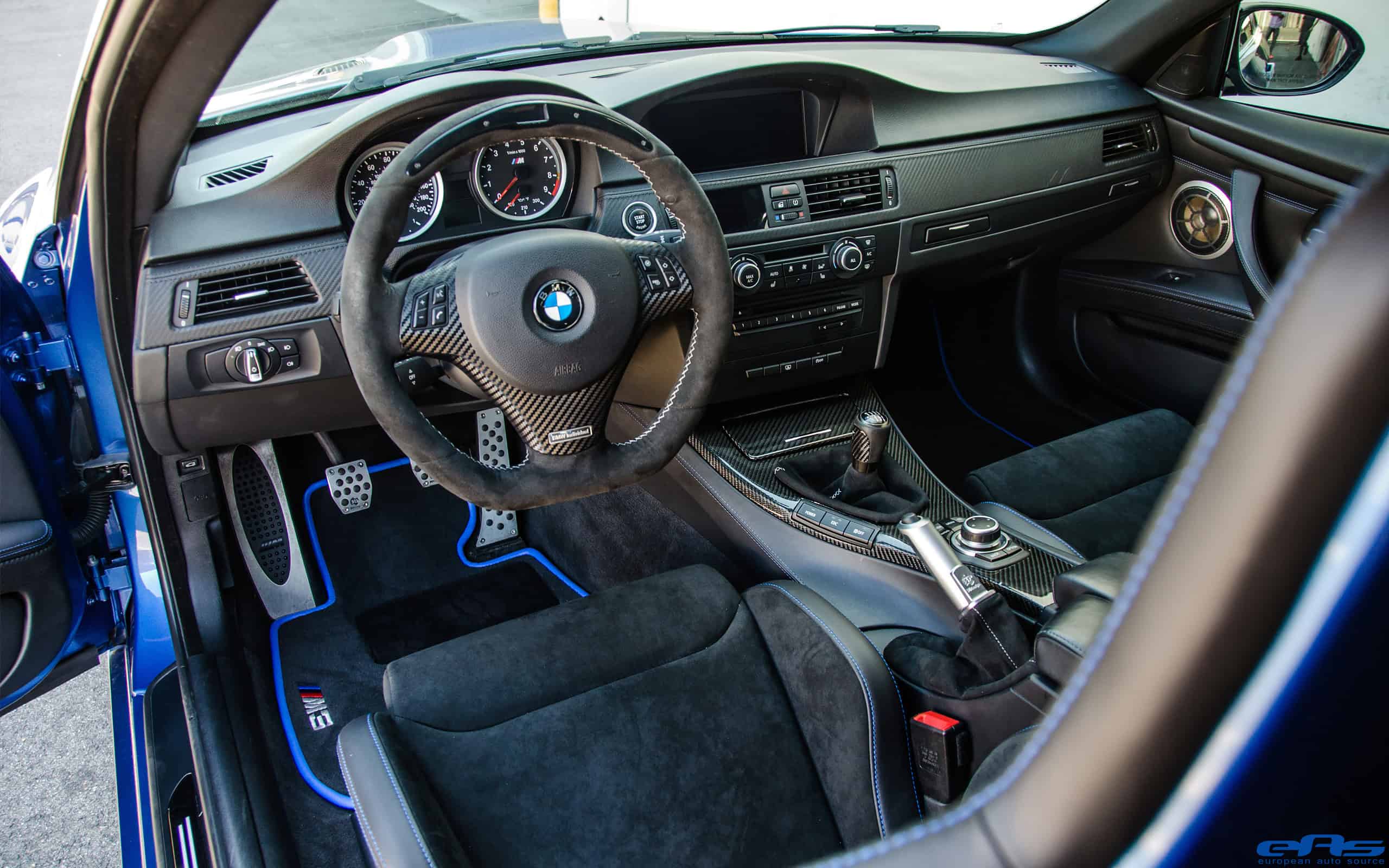 Lift the aluminum hood and you’ll be greeted by a beautifully painted ESS VT2-625 supercharger system. Combined with the Akrapovic Evolution full titanium exhaust system, this high-reviving supercharged V8 wont feel even the slightest bit threatened around its younger, twin-turbo I6 siblings. With the introduction of boost, a boost gauge was required; the Awron gauge provided the cleanest and most functional solution for this particular car. Additional information is displayed on the M Performance steering wheel’s screen, while the rest of the cockpit has been upgraded in a proper way. Custom painted Performance seats, custom stitched floor mats, carbon fiber, billet aluminum and Alcantara bits give this M3 the oxymoronic feel of a luxury race car.