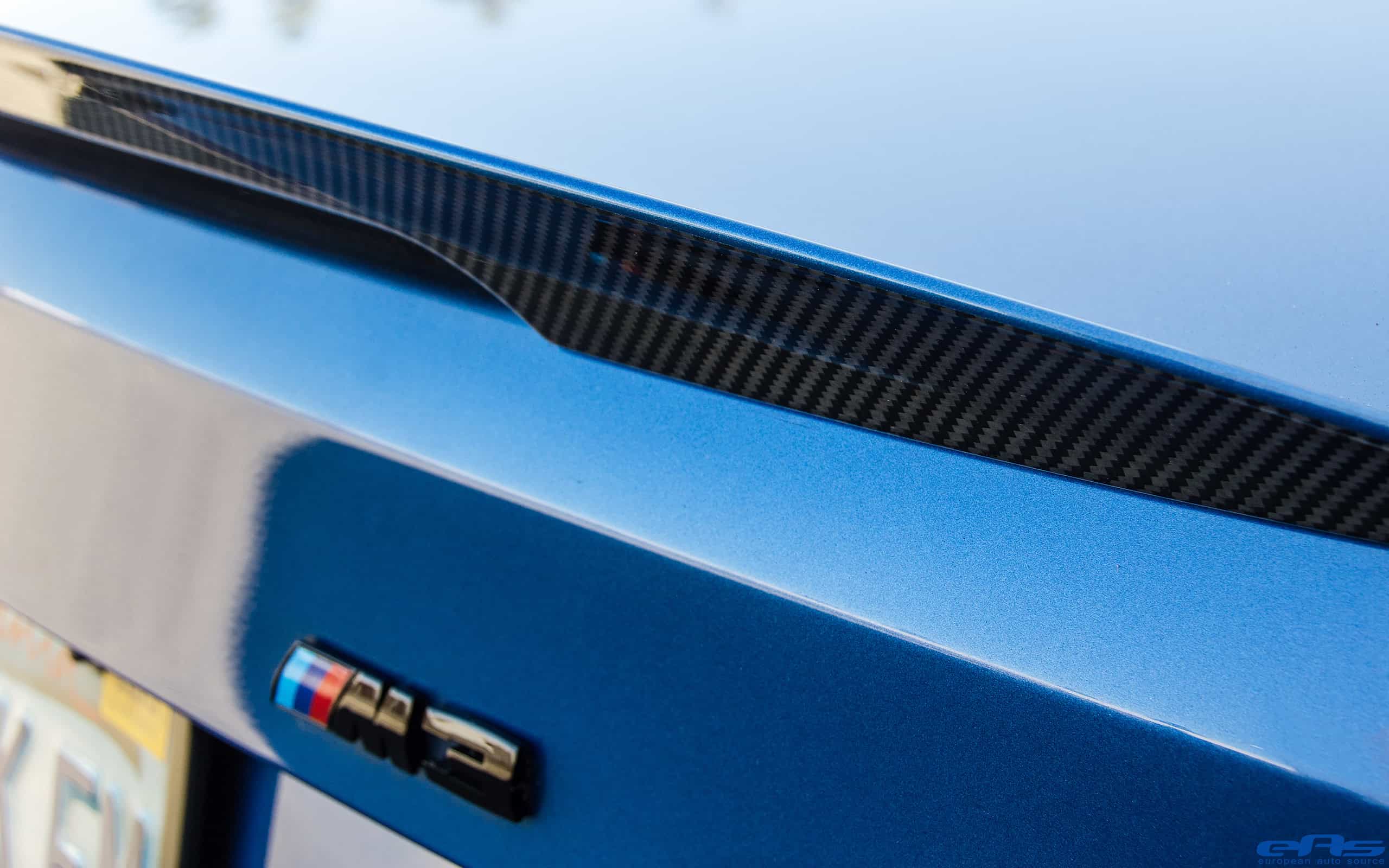 The exterior has been subtly updated with a Mode Carbon front lip and an M Performance trunk spoiler, which features a color-matched pin-stripe, to finish the detailed oriented build.