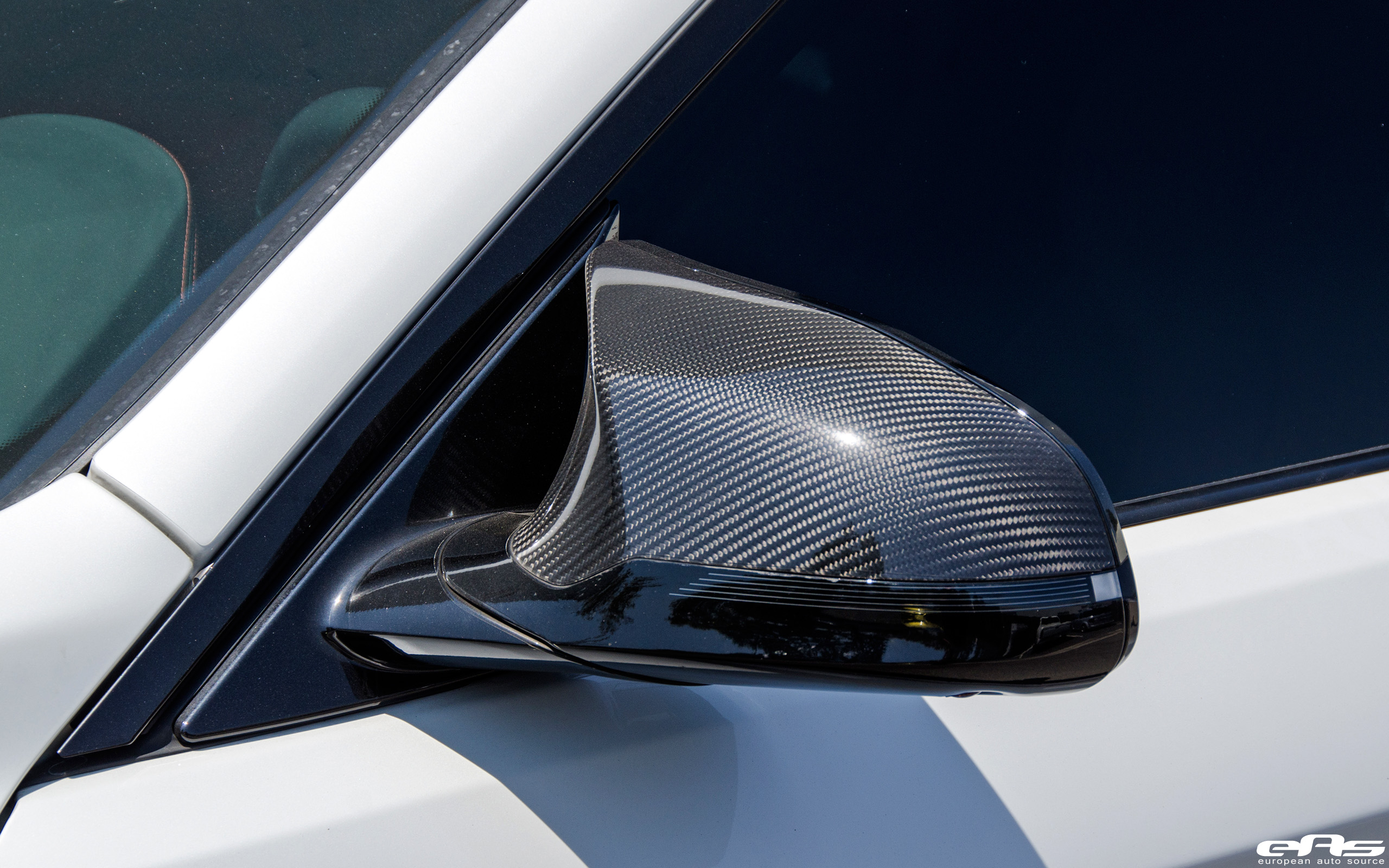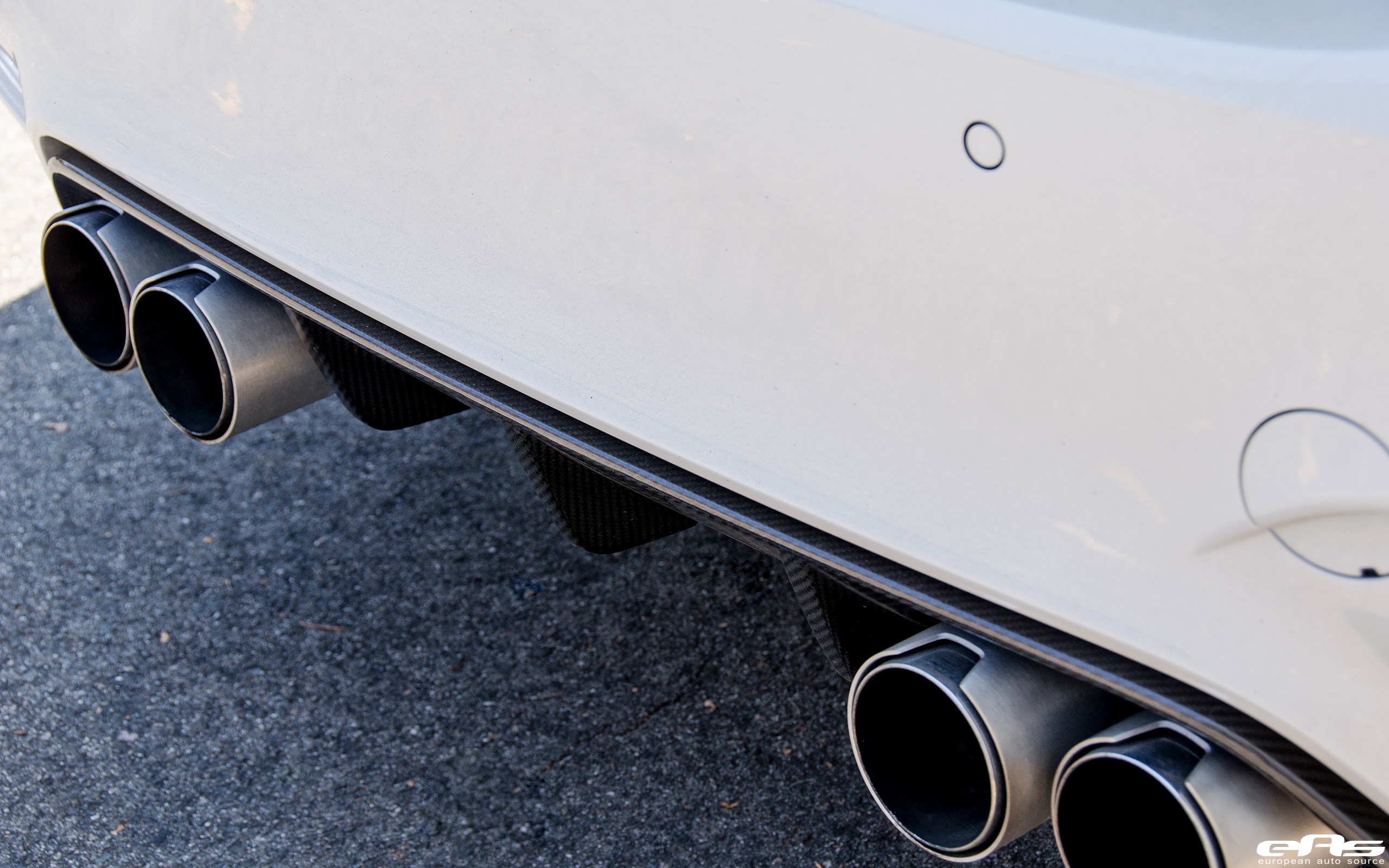 The aftermarket parts installed on this Mineral White are the following: front splitter, carbon fiber air curtains, side skirts, mirror caps, rear diffuser and trunk spoiler. The additional OEM carbon fiber and matte black pieces create a beautiful contrast on this 6MT coupe.