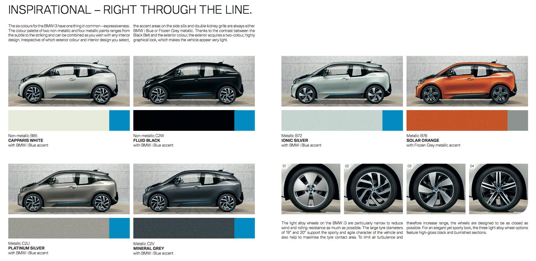 The original Capparis White, Ionic Silver and Solar Orange remain available. Arravani Grey, Laurel Grey and Andesite Silver have been dropped and Fluid Black, Platinum Silver and Mineral Grey have been added. You can download the 2016 i3 PDF brochure which has the color chart from this link.