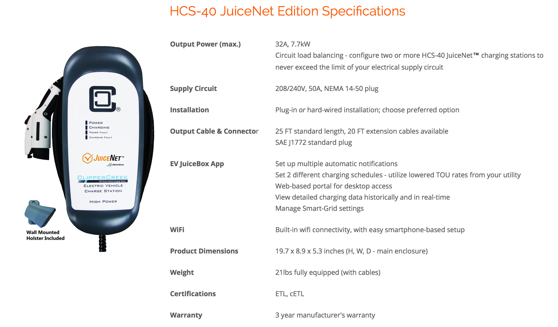 ClipperCreek pairs with eMotorWerks to fit the HCS-40 and HCS-40P with the JuiceNet controls which allows anytime-anyplace control via a mobile app, fast charging, and reductions in both greenhouse gas emissions and electricity costs based on user-defined charging preferences. Wi-Fi functionality is also added.