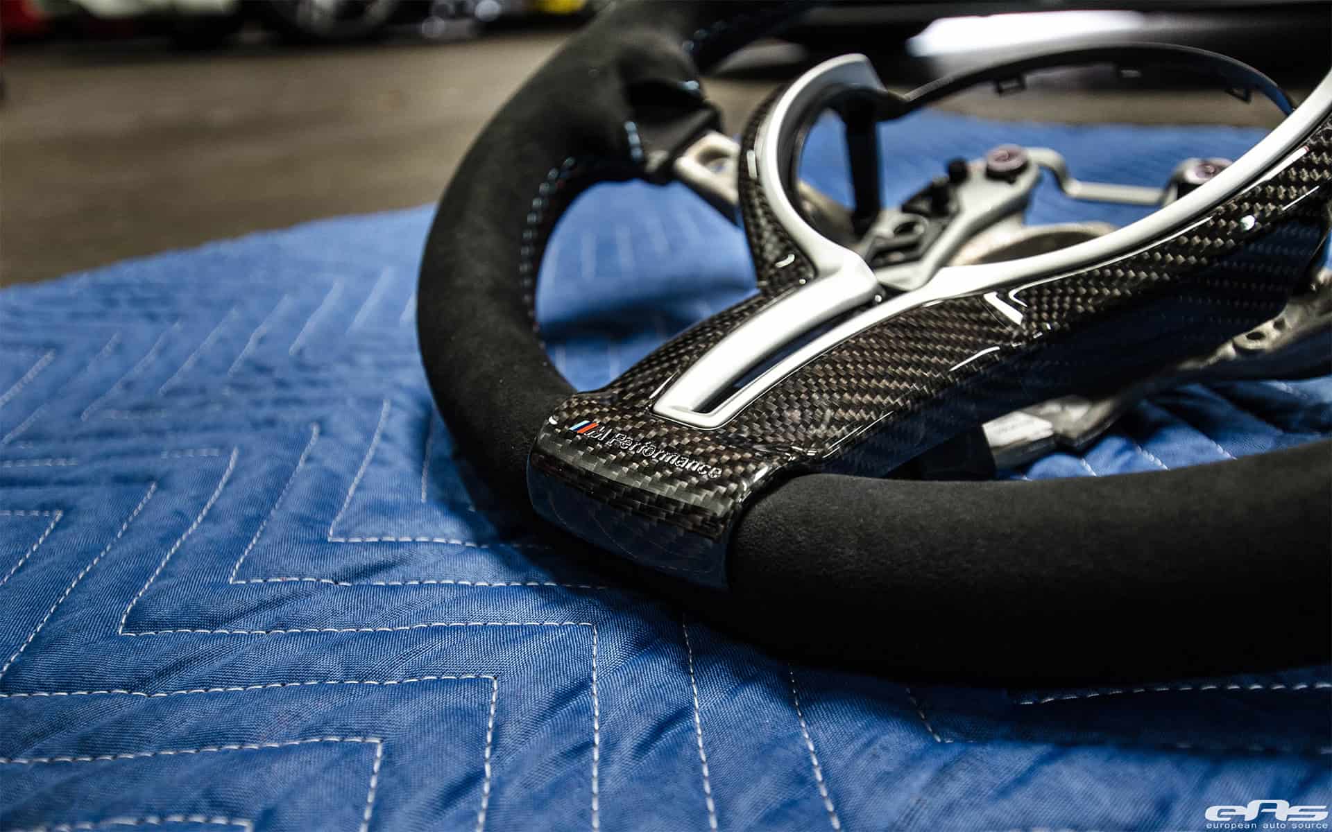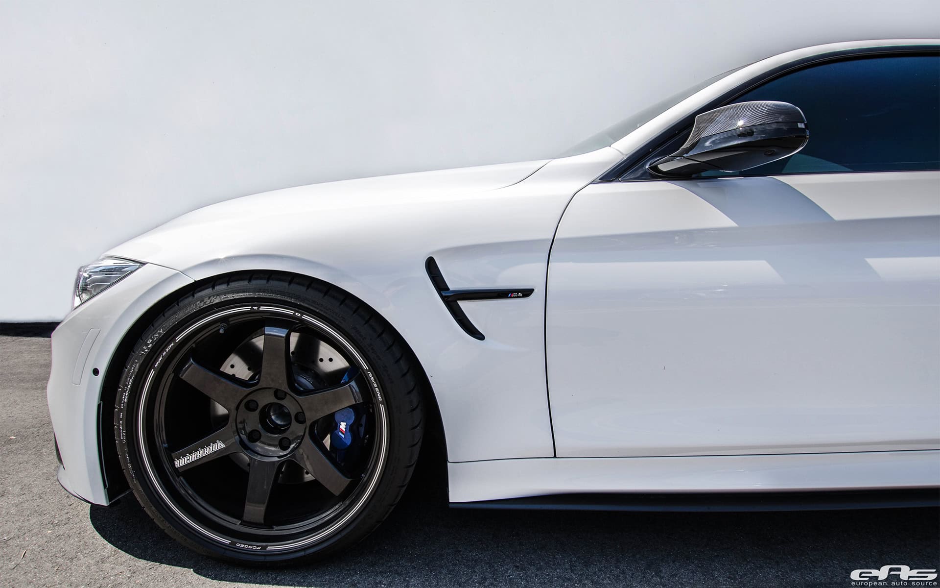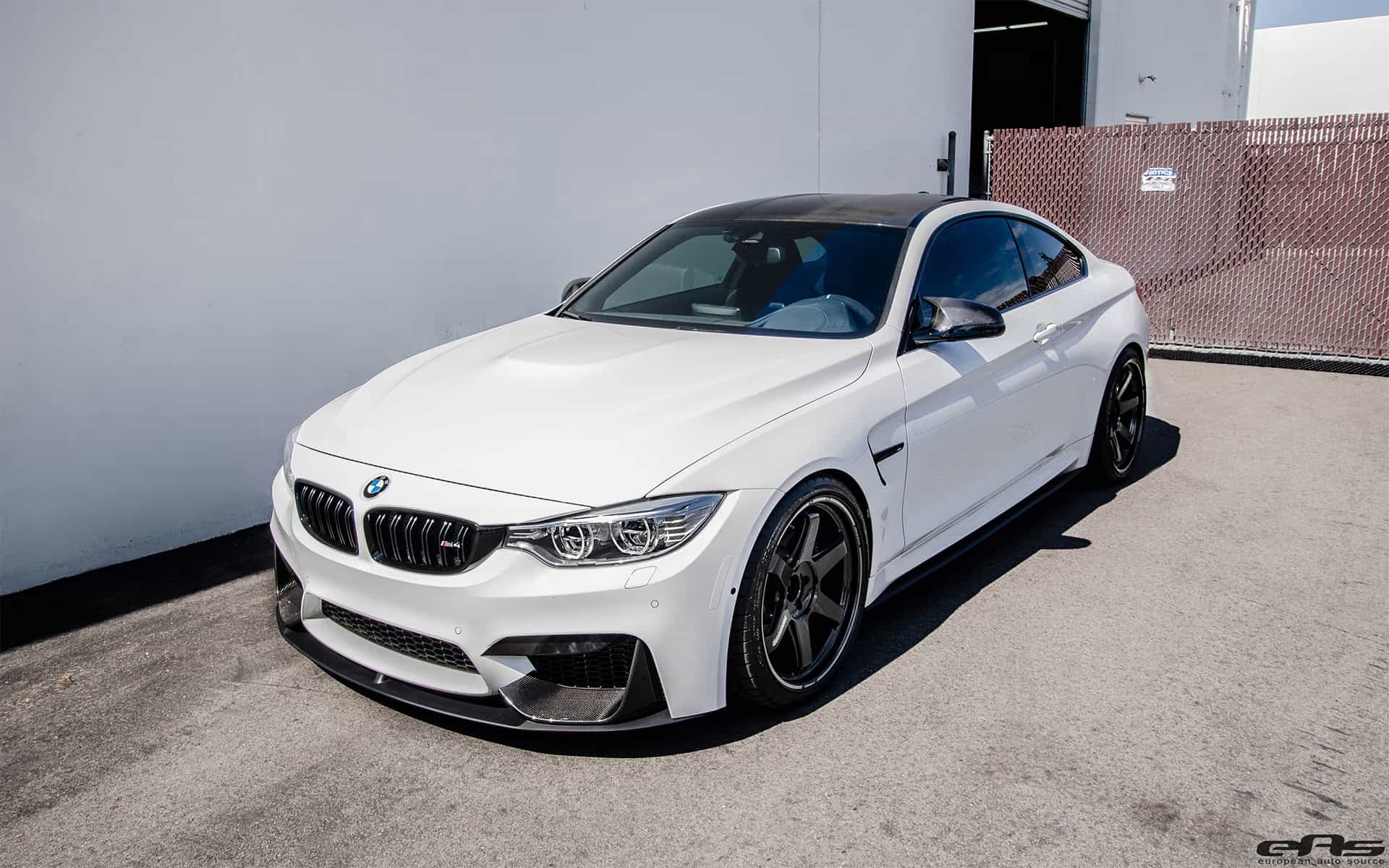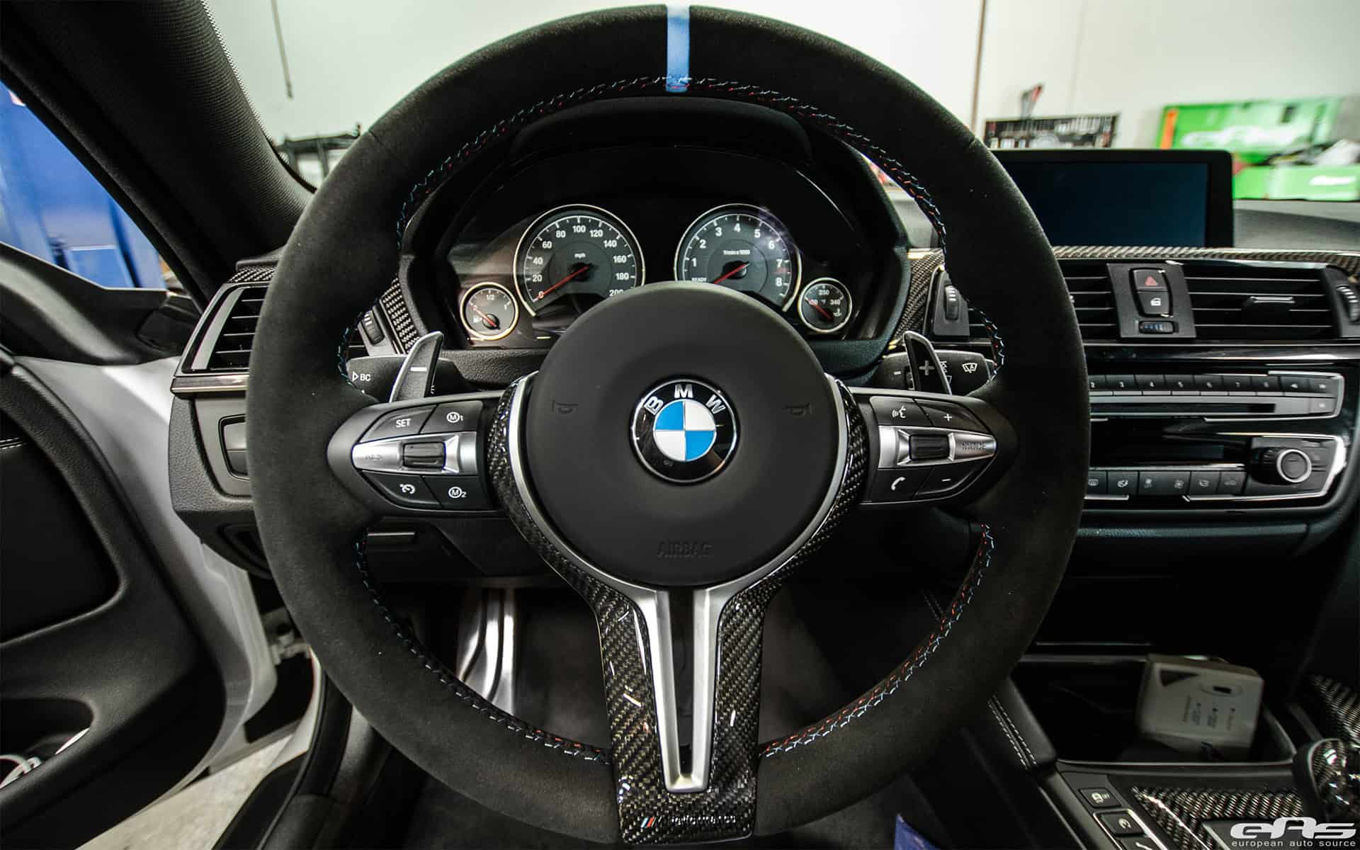 This following BMW M4 build by European Auto Source kicks off with the addition of BMW’s beautiful M Sports Steering Wheel. The sporty and sleek looking steering wheel provides great grip, easy maneuvering and great looks. The integrated carbon fiber trim perfectly matches the rest of the interior trim.