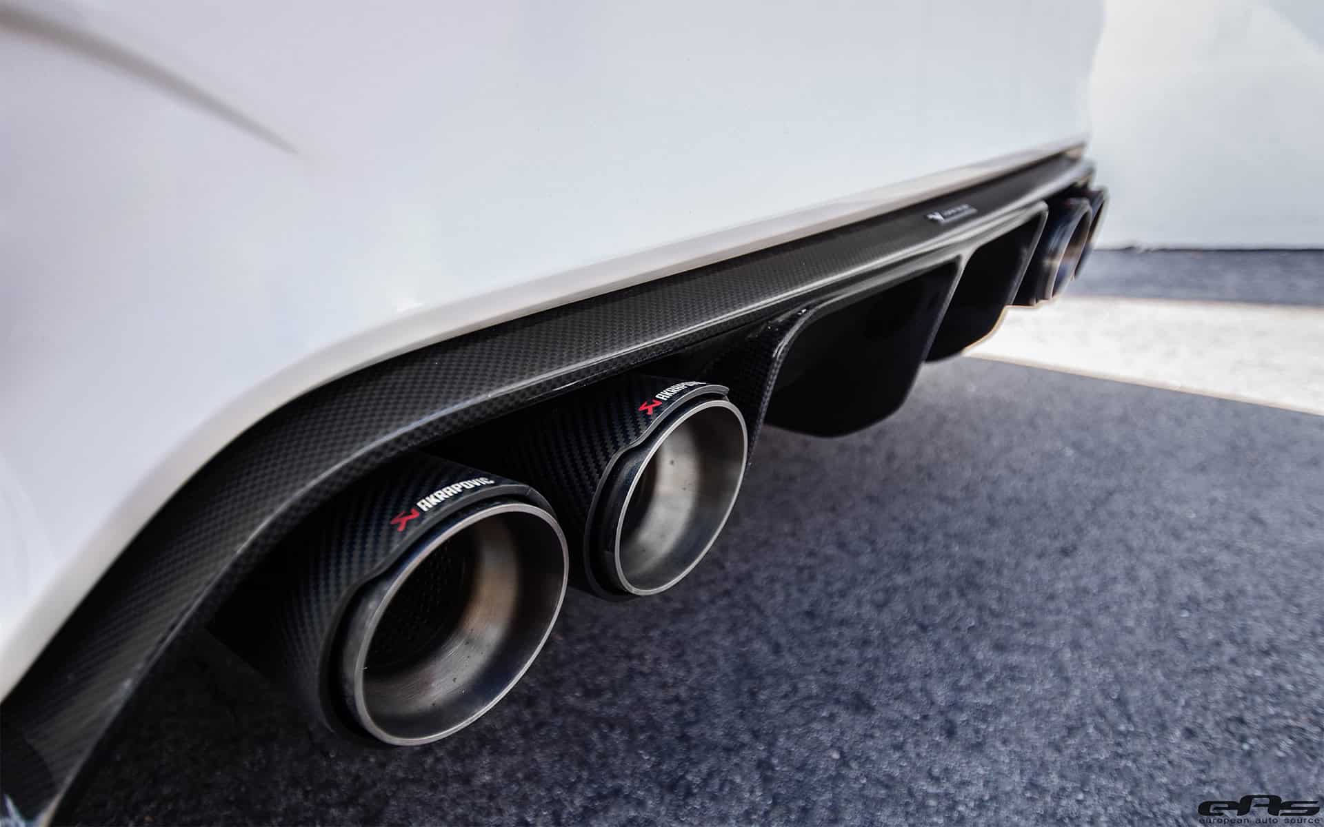 The performance aspect got a bit of attention too. A full Akrapovic Evolution Titanium exhaust system with carbon fiber tips was installed easing the exhaust gas airflow, while allowing the vehicle not to only sound better, but also have a better throttle response. It gives the somewhat tame BMW TwinPower Turbo 3.0 liter engine more breathing room and a deeper exhaust note.