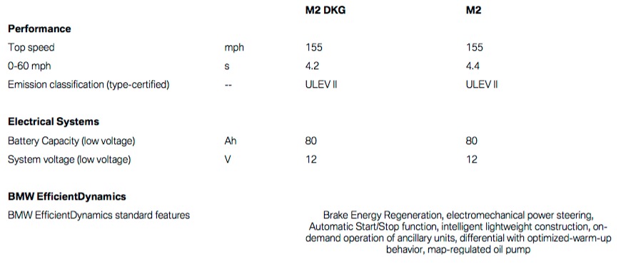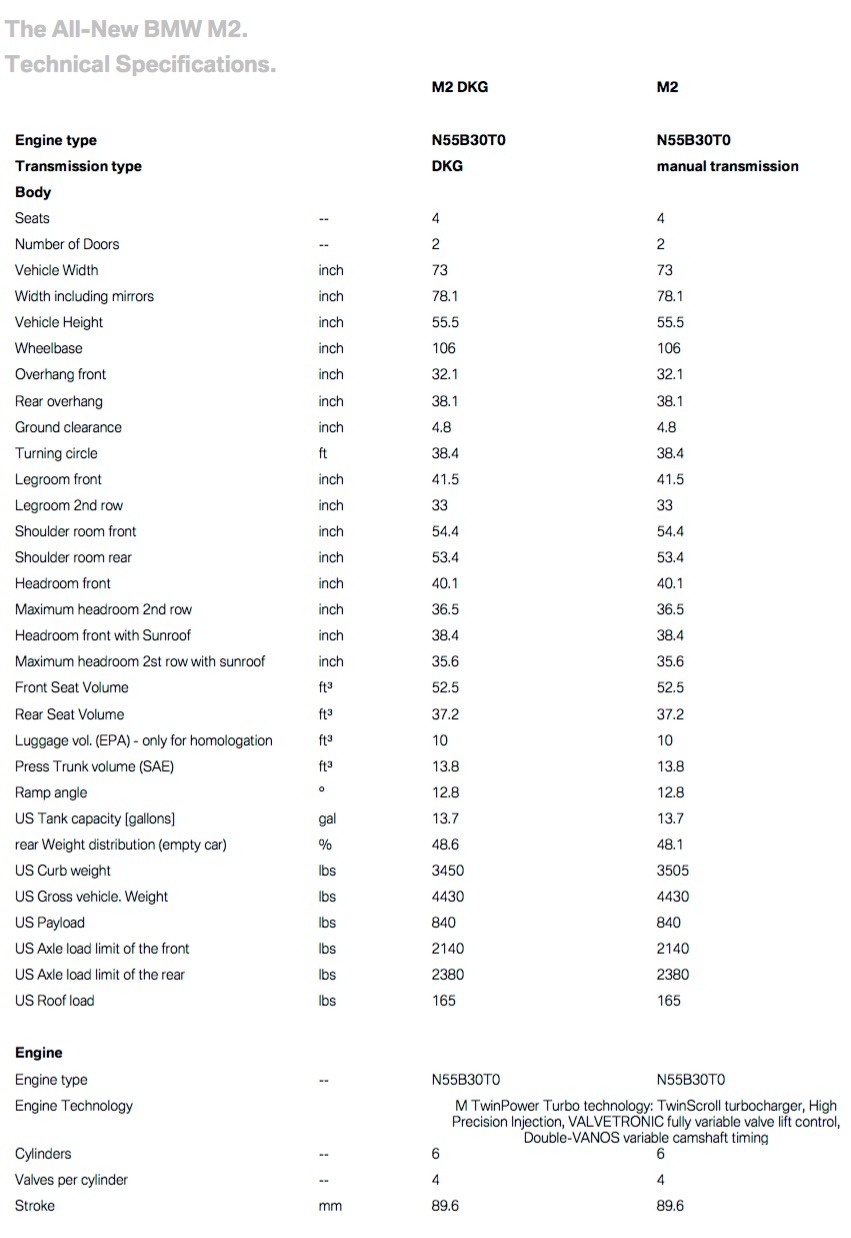 Compared to the M235i Coupe, the M2 is between 40 t0 50 kilograms lighter (approx. 100 lbs) – depending on the configuration. The weight, unladen to DIN/EU is 1495 kg/1570 kg (3296 lbs / 3461 lbs) for the manual transmission and 1520 kg /1595 kg (3351 lbs / 3515 lbs) for the 7-speed DCT. The US Curb Weight for the M2 is listed at 3,450 lbs for the manual model and 3,505 lbs for the DCT.