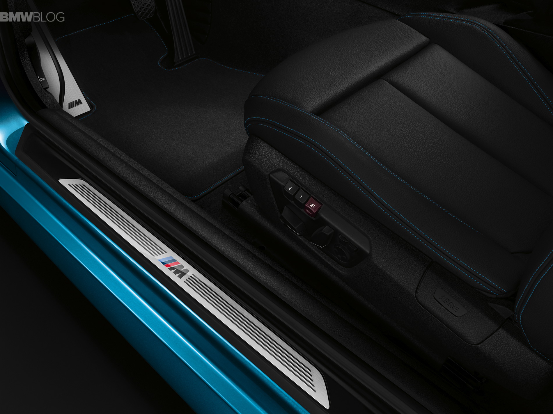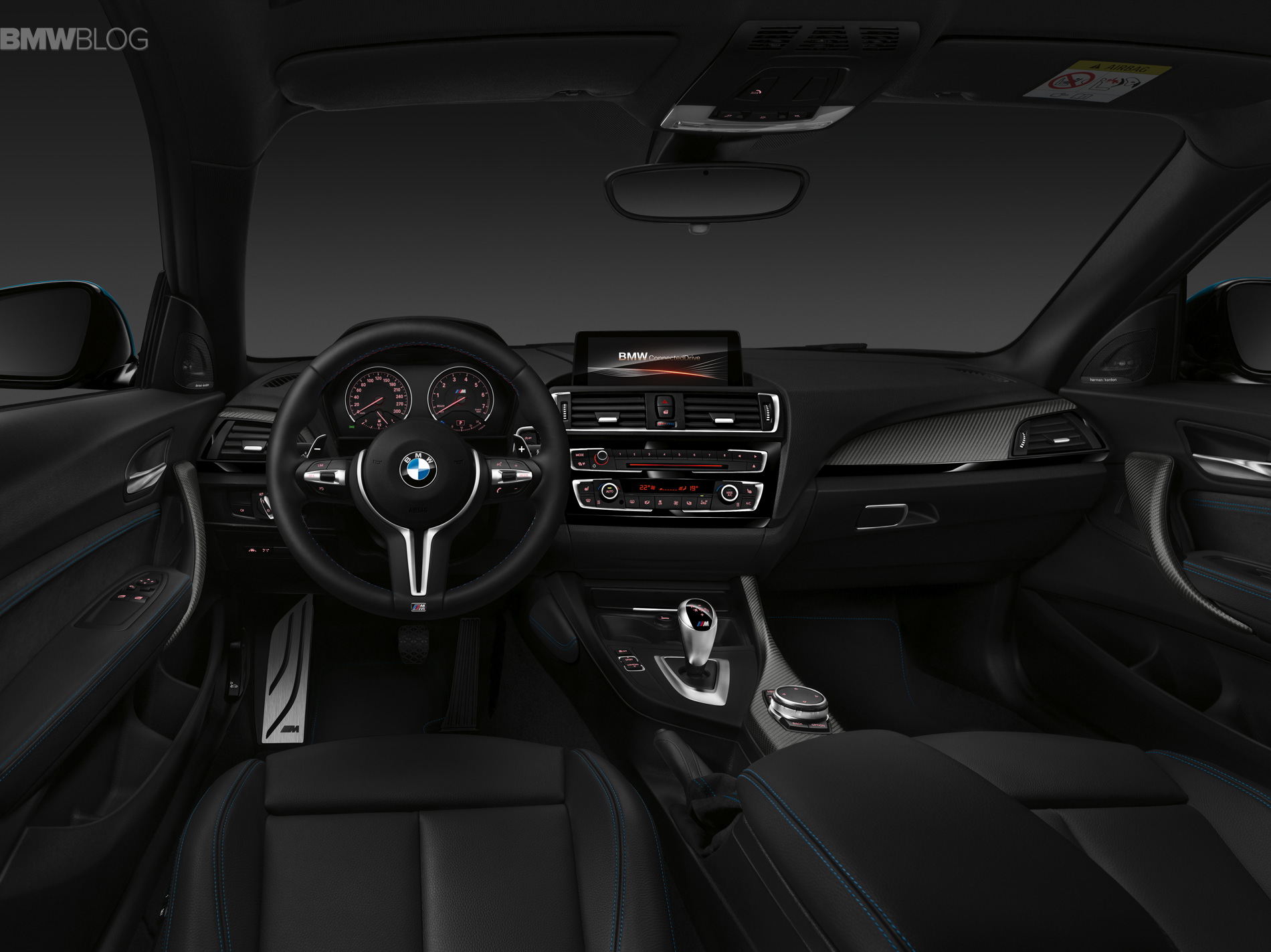 The cabin is fitted with a host of BMW M-specific equipment details – Sports seats, in black Dakota leather with blue contrast stitching and an M logo in the backrests, an M footrest and knee pad on the center console and instruments with BMW M2-specific dials and needles. Familiar M equipment items in the new BMW M2 Coupe also include M logos on the rev counter, gearshift lever, door sill plates and M leather steering wheel with shift paddles. Other highlights of the interior are the new BMW M2 trim strip with surfacing in porous carbon fiber and Alcantara for the door cards and parking brake lever gaiter.