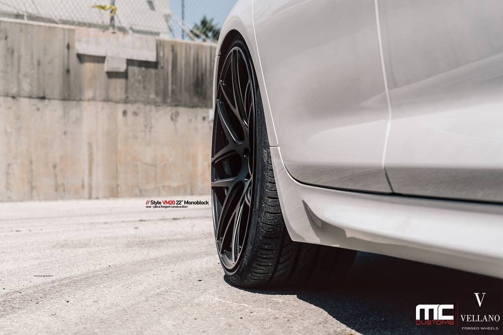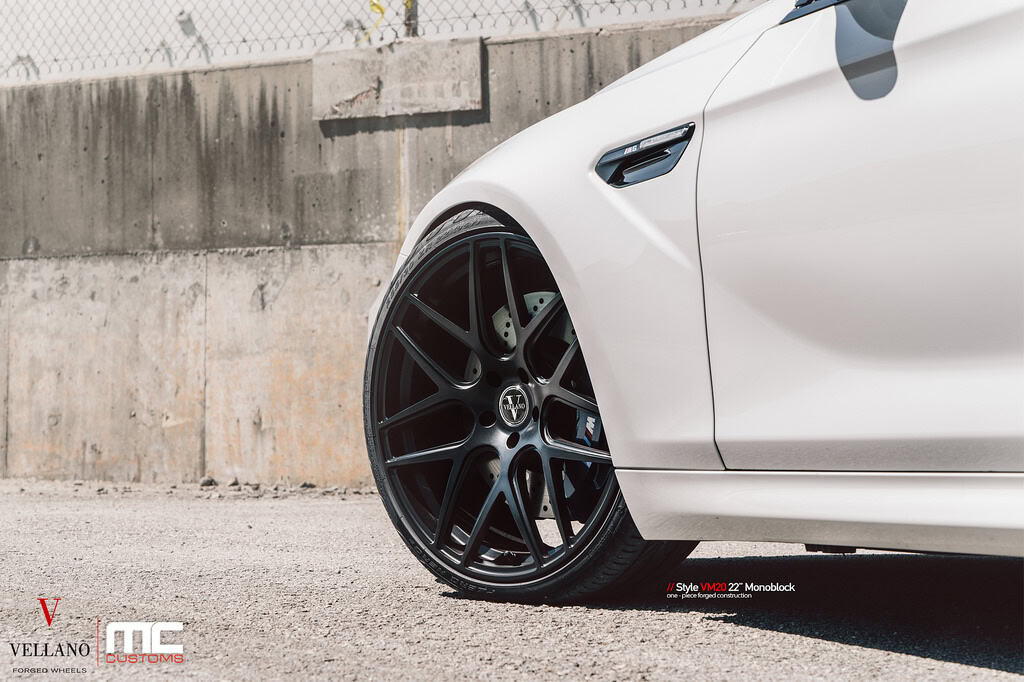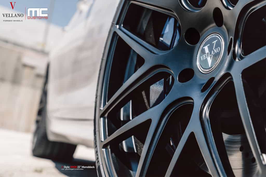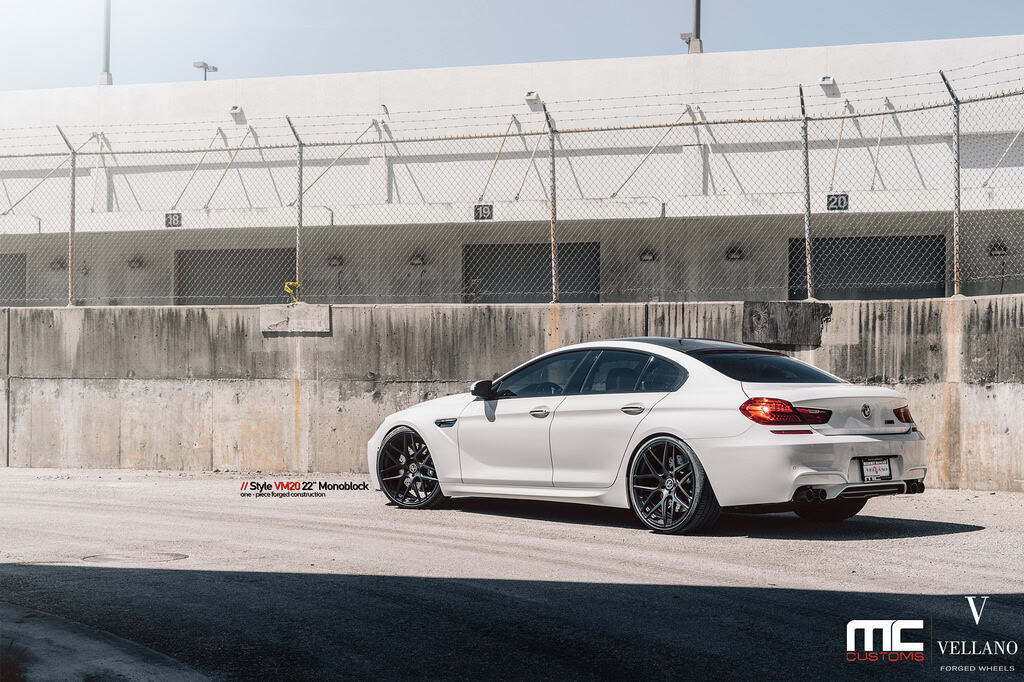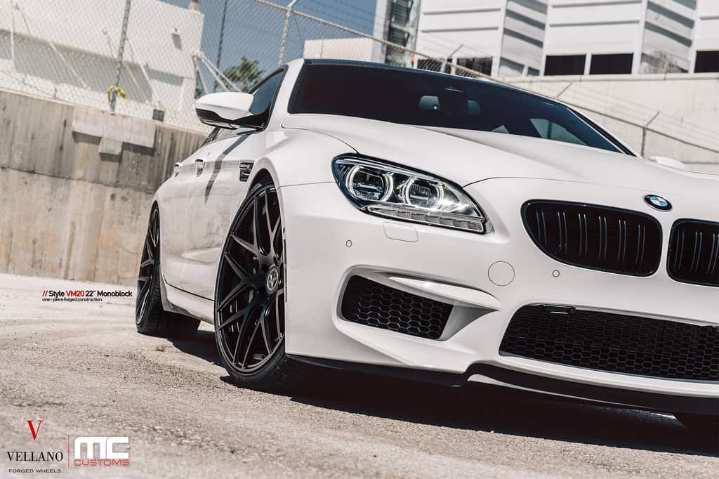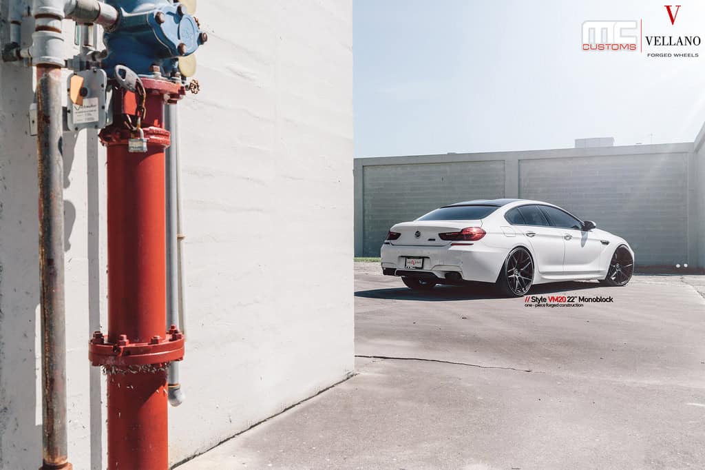 This photoshoot shows an Alpine White BMW M6 Gran Coupe with a set of Vellano wheels. These come in sizes of 22 inches front and rear, thus filling the wheel wells quite perfectly. The aggressive look of the classical mesh designed wheel fits nicely on this super sports model from the Bavarian car maker. The build is a clean one – with a subtle carbon fiber trim, a carbon fiber front splitter and blacked out kidney grilles which match perfectly the pristine white exterior.