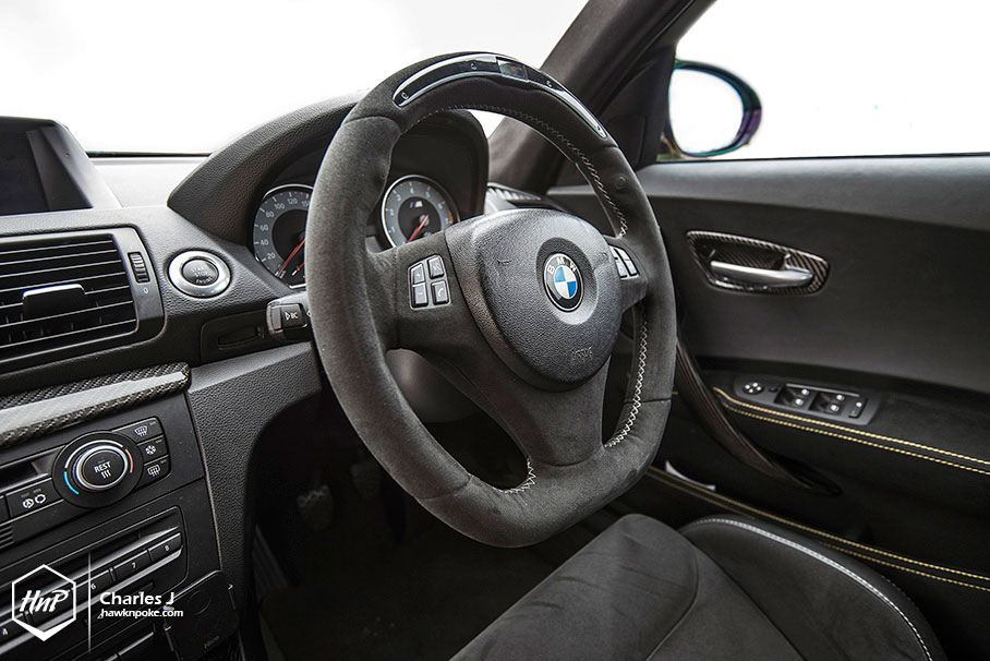The cabin was adorned with carbon fiber parts and the BMW M Performance Steering wheel. Finished with a pair of BMW performance seats, the interior is as mouth-watering as the exterior 1M conversion. Posma also retrofitted CIC and iDrive unit into the system!
