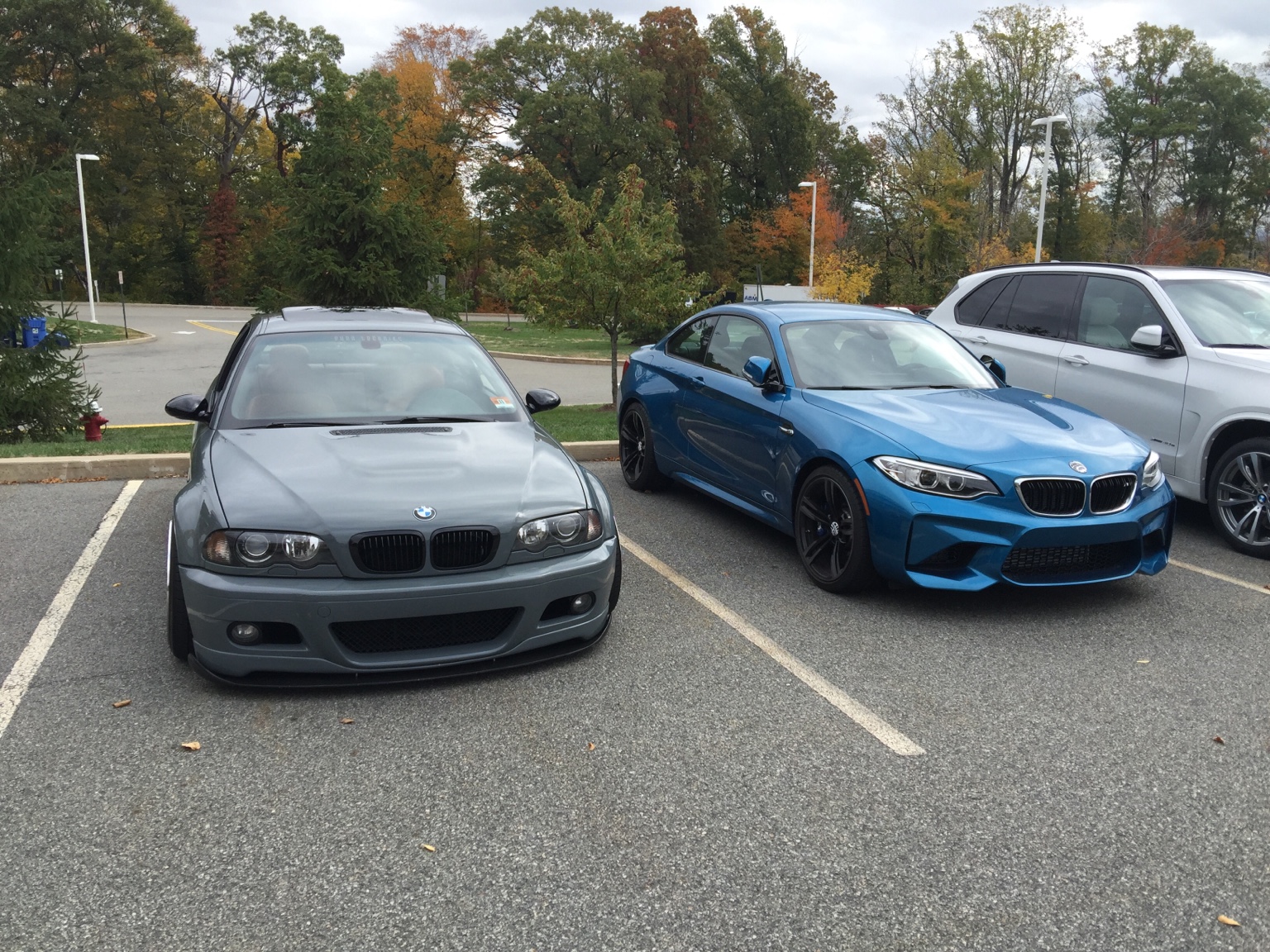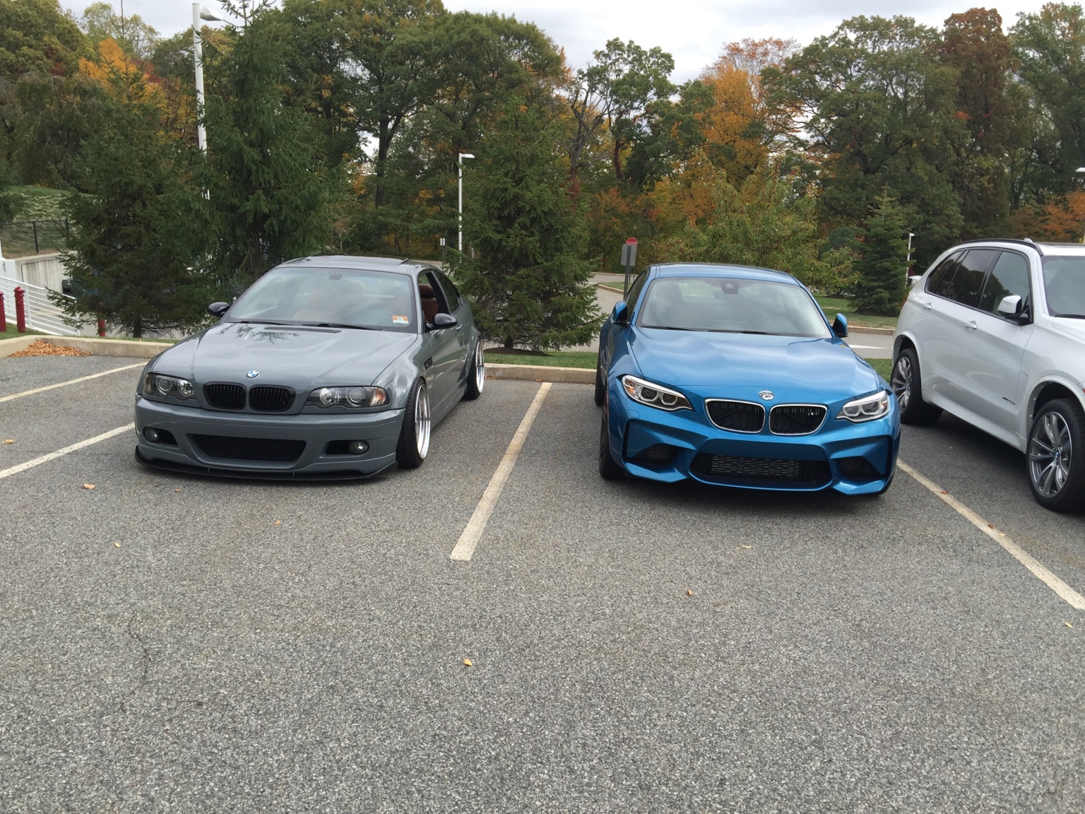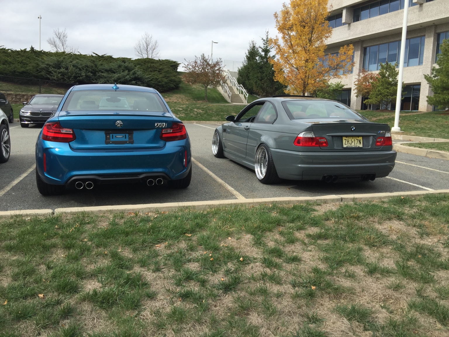 The upcoming BMW M2 was spotted at the BMW Headquarters in Woodcliff Lake, New Jersey. The M2 prototype features the Long Beach Blue color and it’s likely driven by one of the U.S. M product managers. Left out in the open, the M2 found a partner quickly – a beautiful E46 M3.
