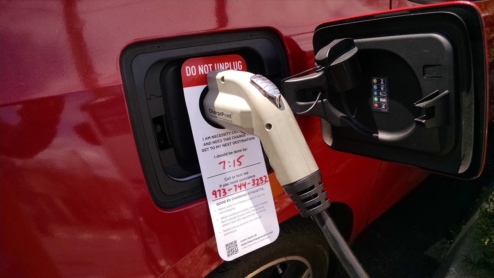 Fast forward to today. There are hundreds of thousands of plug in vehicles on the roads here in the US, and not nearly enough public charging stations, especially in EV hotbeds like California. So charger sharing has continued in many different forms, especially for workplace charging. Often, the number of plug in cars in a workplace parking lot greatly exceeds the number of charging stations they have. So by playing nice, and sharing the chargers, everyone gets their fair time on the plug. However, if the connector is locked to your car, even when the car is finished charging, then the charging station cannot be utilized by the next person. One electric vehicle owner, realizing the need for them, created hang tags specifically to assist in public charger sharing and now sells them on his website.