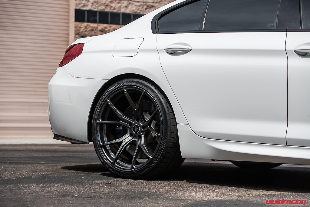 This BMW M6 Gran Coupe was at Vivid Racing for a customization project. The four-door sporty coupe received a set of Vorsteiner carbon fiber aero additions and Vorsteiner V-FF 103 Flow Forged wheels. The wheels come in sizes of 20×9.5 in the front and 21×11 in the rear, respectively, with a Carbon Graphite finish which matches the Alpine White exterior of the vehicle.