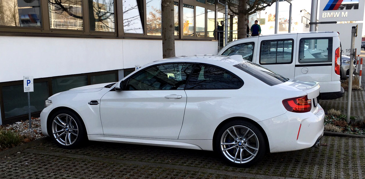 If you’re ever looking for a yet-to-be released M car, then Garching is the place to be. The M facility just outside Munich is home of the “Most Powerful Letter In The World” and a place where M engineers are testing upcoming models. Take for example this BMW M2 prototype which has been sitting in front of the main entrance for weeks now, likely driven by one of the M employees. What makes it so special compared to others M2 prototypes spotted in the past is its Alpine White color. The beautiful white is only one of the four colors offered for compact coupe and one that it’s likely to be predominant.