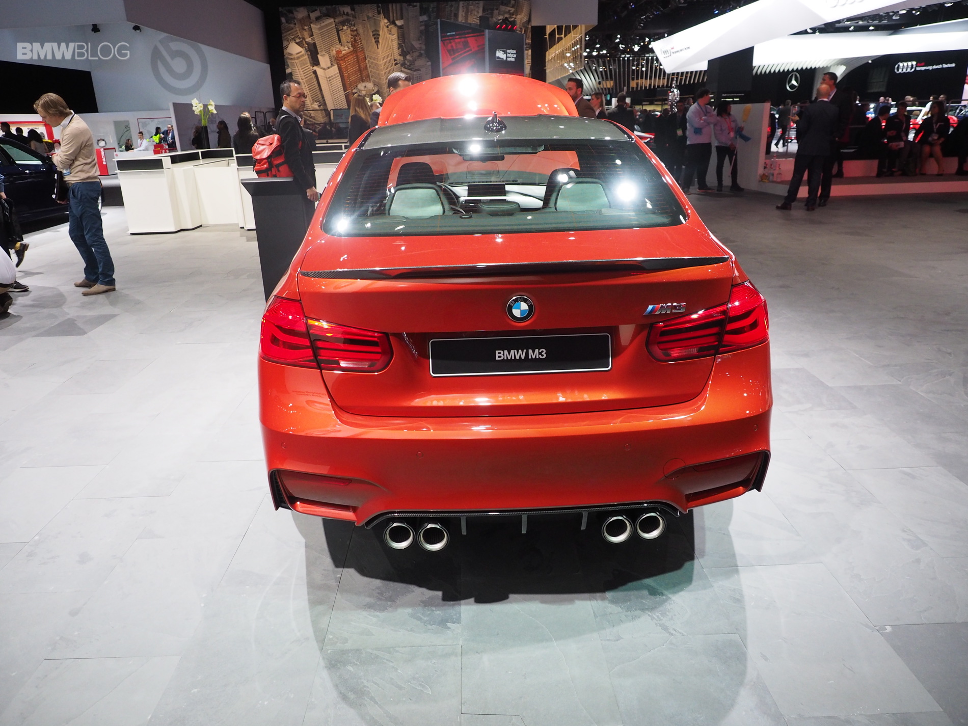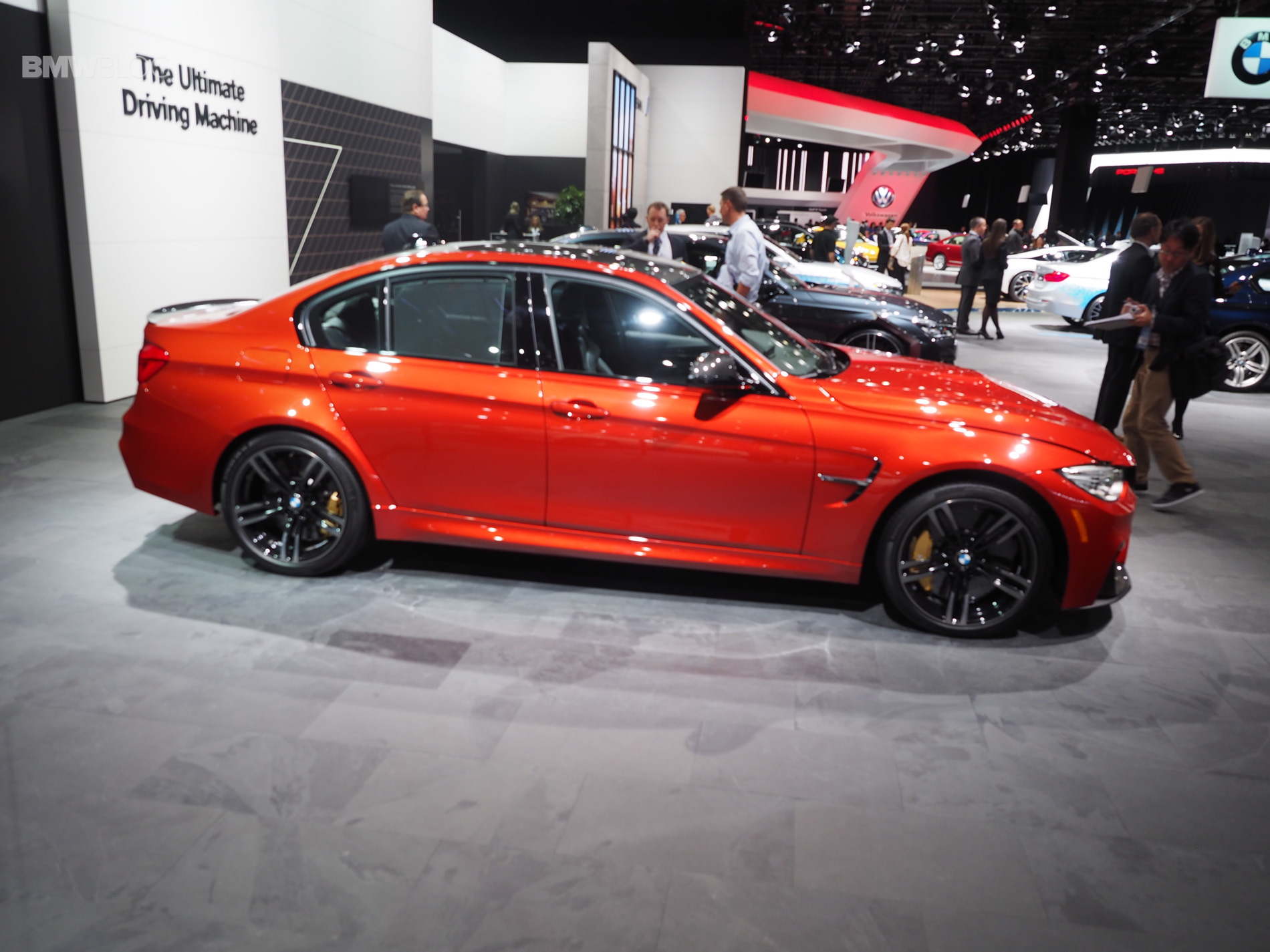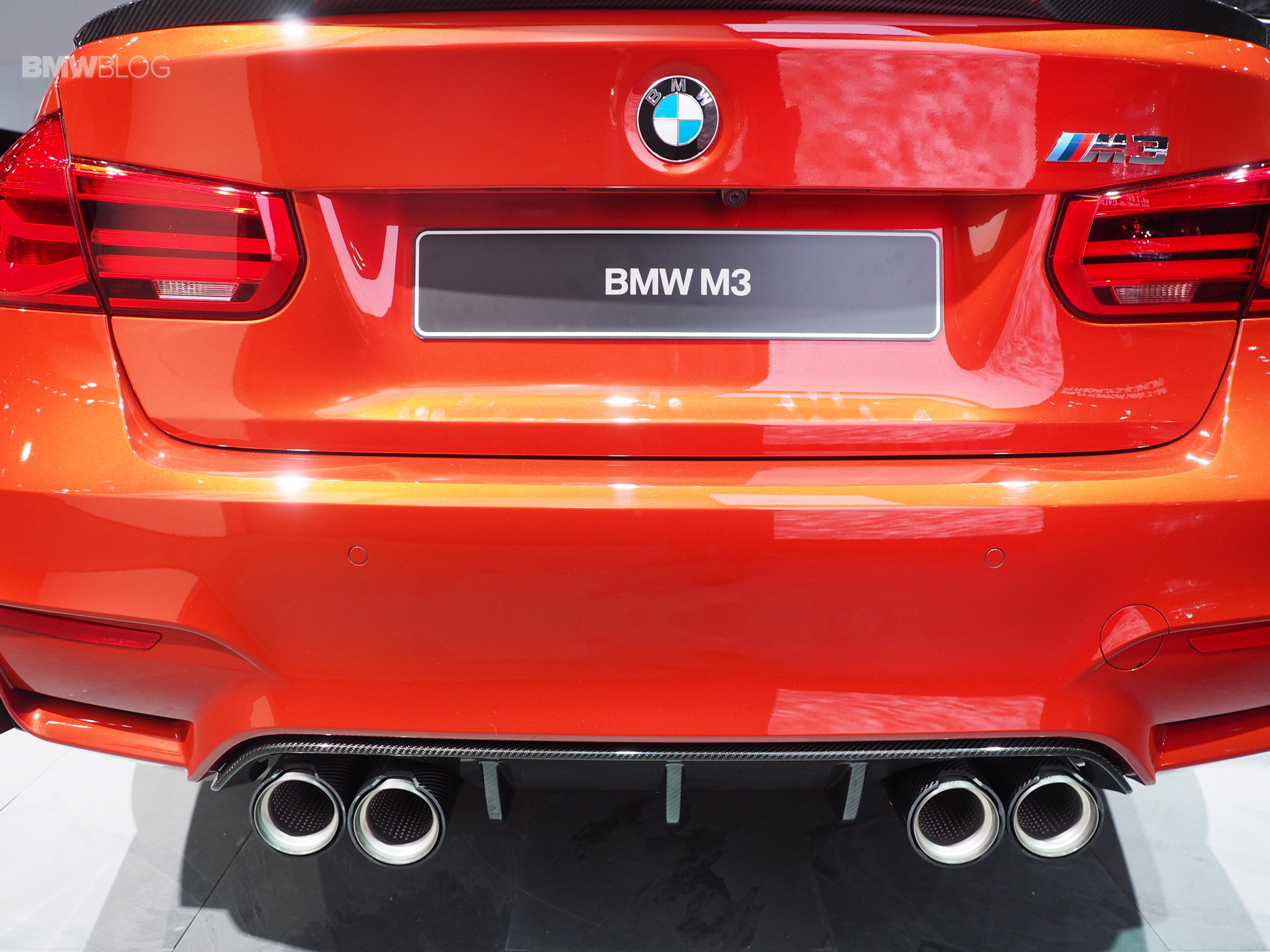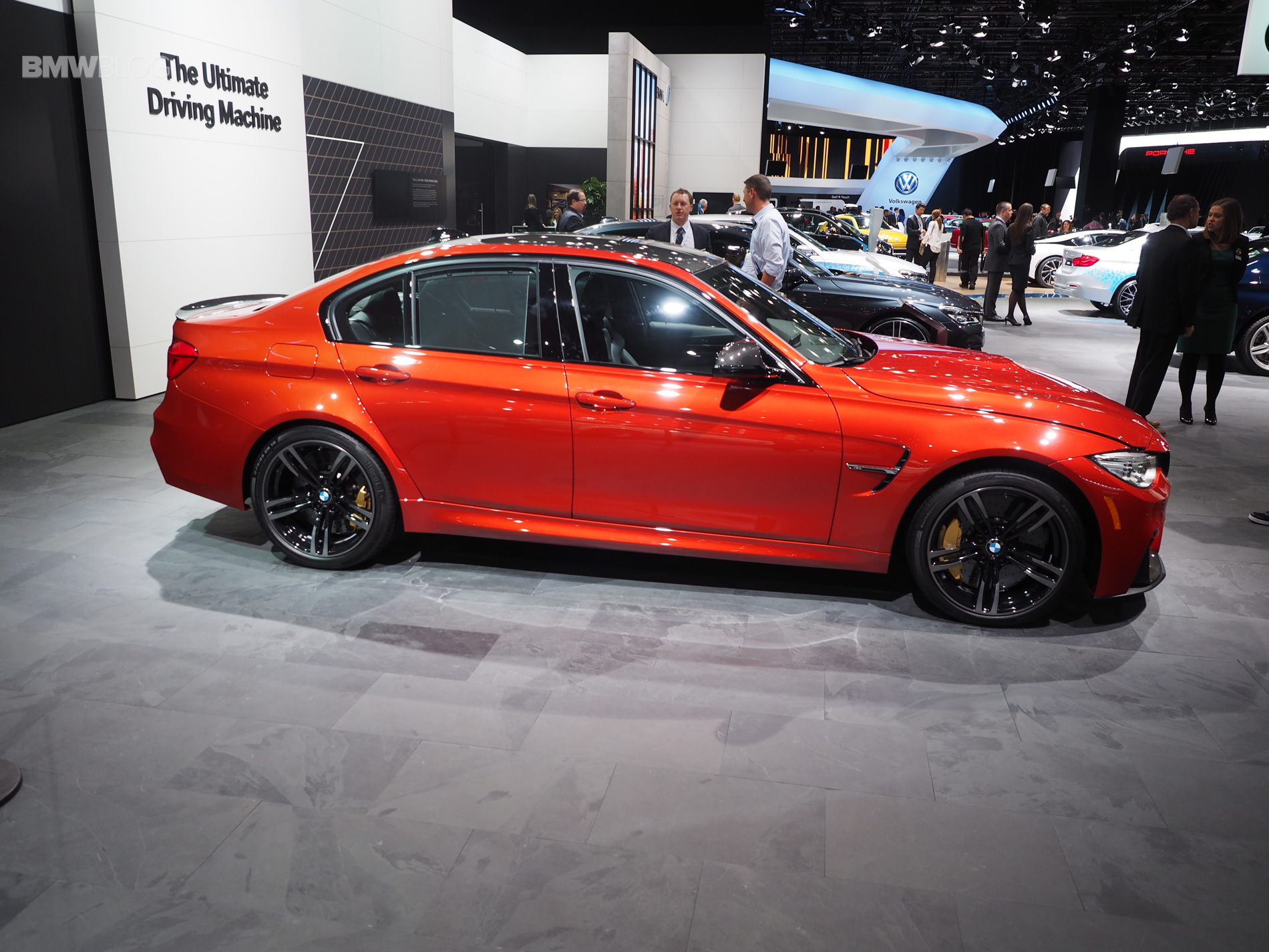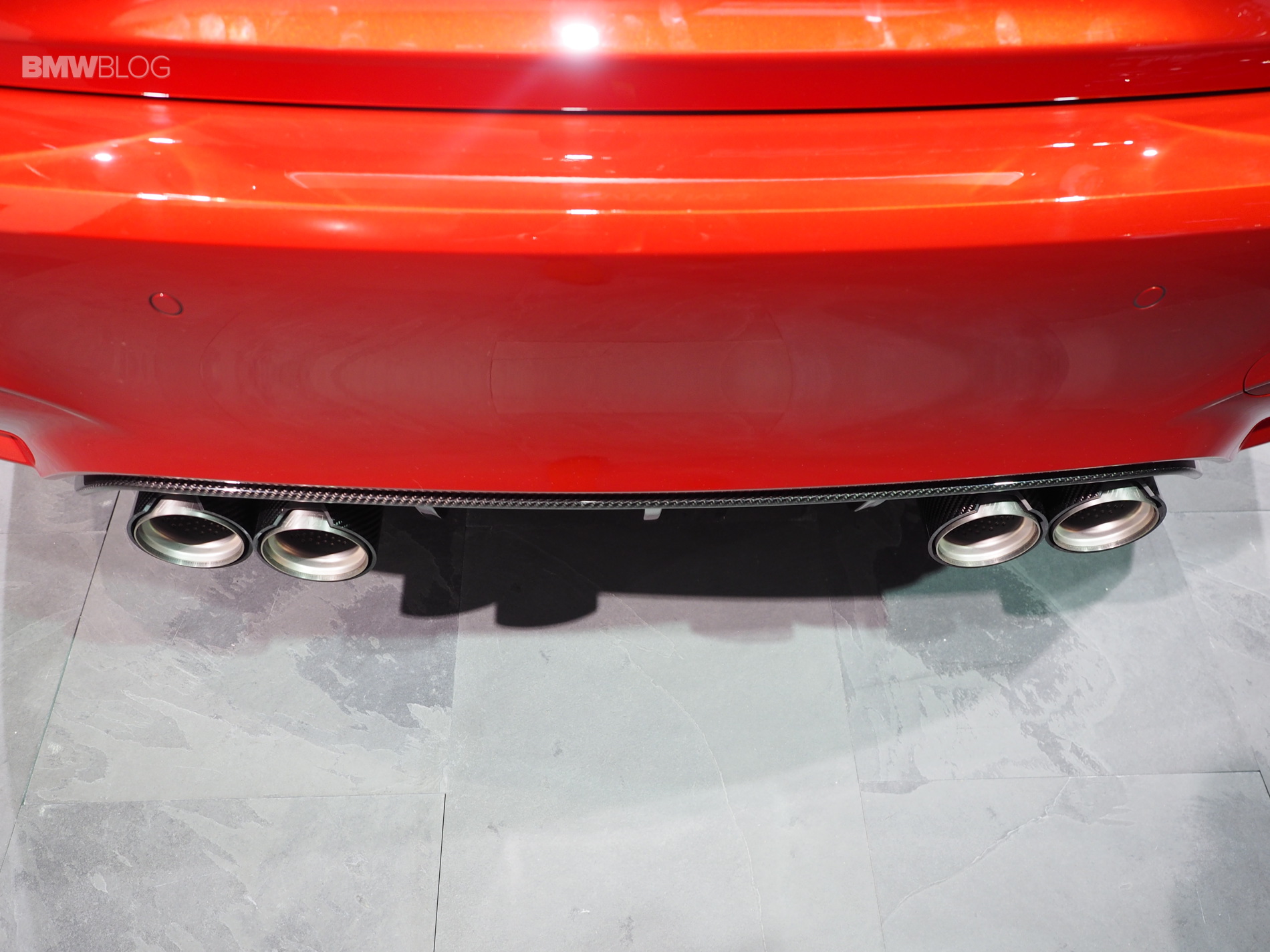 While the M2 takes the center stage at the BMW booth in Detroit, a BMW M3 in Sakhir Orange attracts a crowd as well. The flashy paint job and the BMW M Performance Parts give this M3 an unique look. The sporty sedan comes decked out with a carbon fiber front splitter, carbon fiber air curtains, carbon fiber rear spoiler, mirror caps and a rear diffuser.