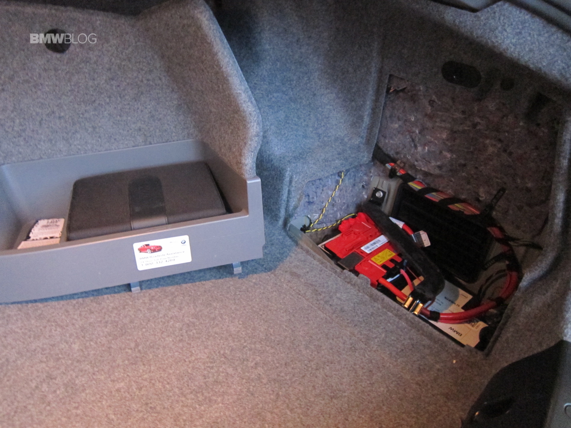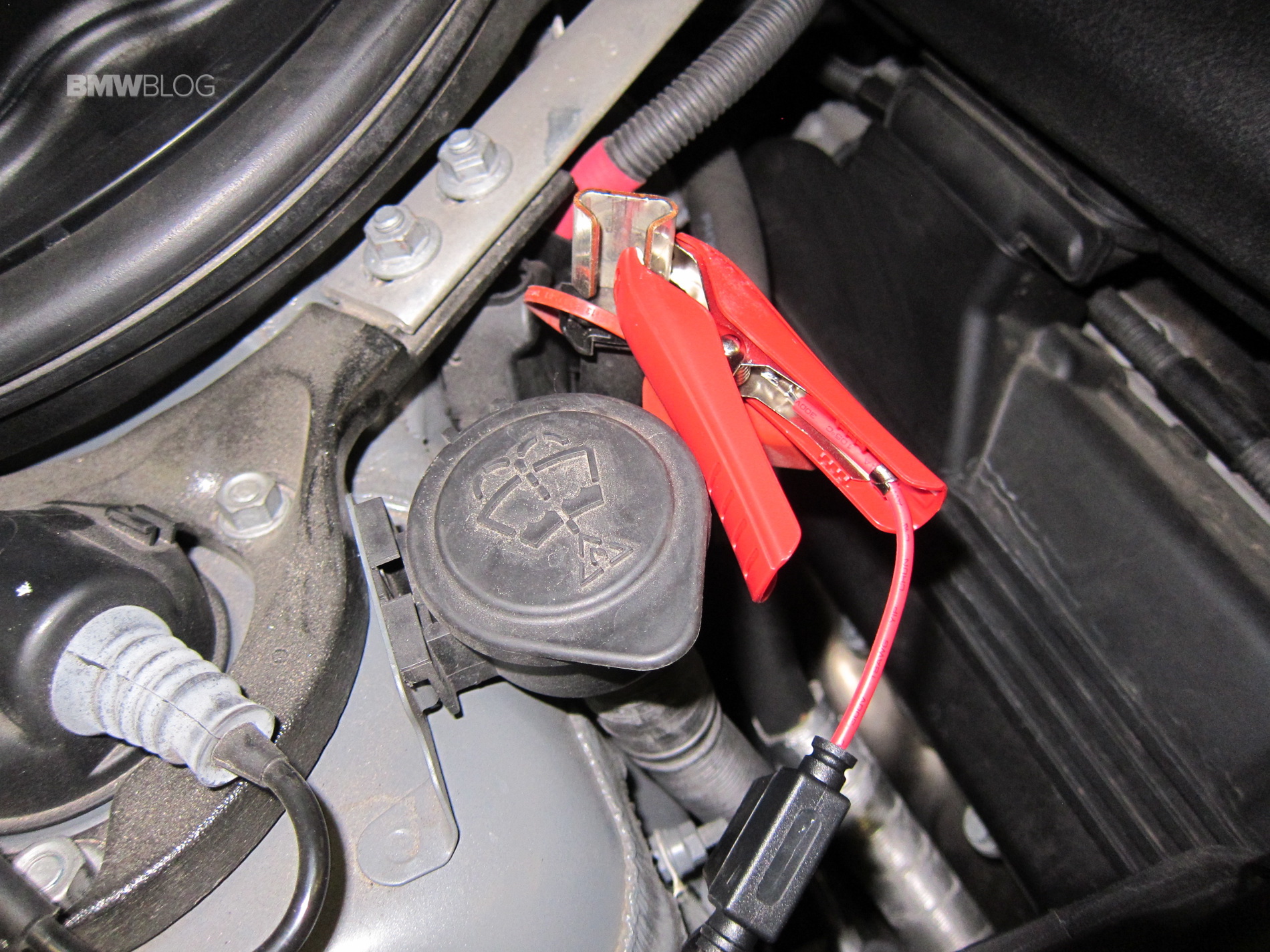One can either connect the battery charger by directly accessing the BMW’s battery through the trunk or via the engine compartment on the red power terminal and the ground. I’ve done both, but find using the engine compartment easier to get to as opposed to removing parts of the trunk lining to get to the battery. You can even route the charging cables up through the bottom of the windshield and close the engine bay lid and lock the car if needed.