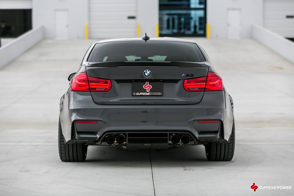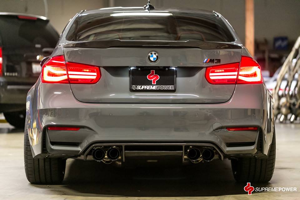 In terms of performance, Supreme Power gave the BMW M3 an AWE Tuning non-resonated exhaust system with 90mm Diamond Black tips which allow the engine to breath more freely, a set of KW height-adjustable springs with 1.2″ Front/0.75″ Rear lowering, and Macht Schnell wheel spacers (15mm front and 12mm rear) for a much sportier stance.
