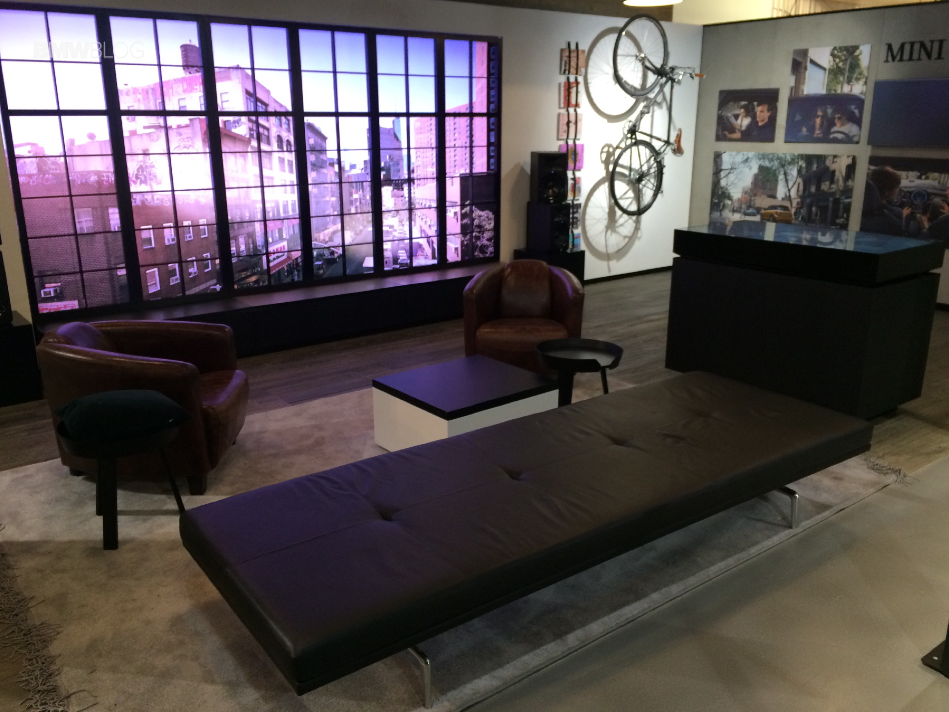 A special section to enjoy the MINI flair is created on the back side of the Clubman. A big video wall and living room furniture create the illusion of entering the apartment of designer. It invites visitors to sit down and take a look at a classic MINI Cooper.