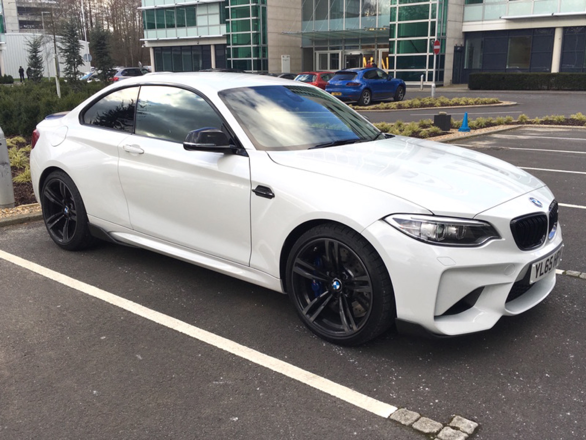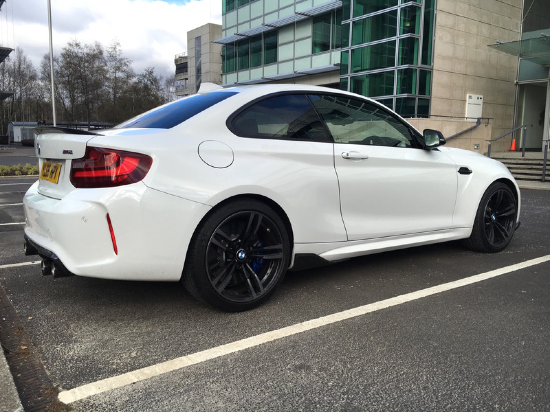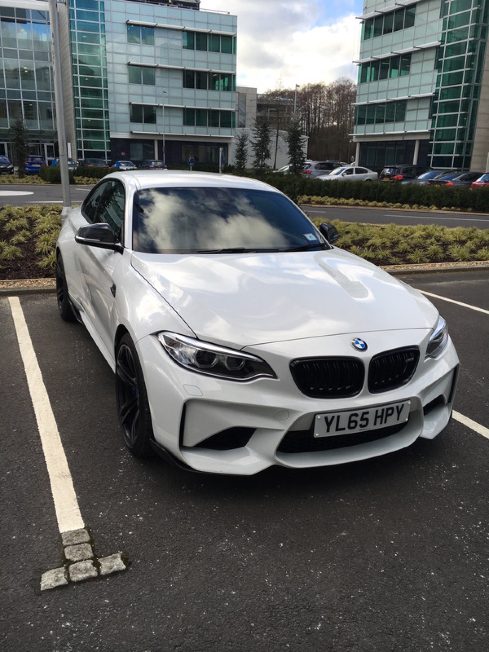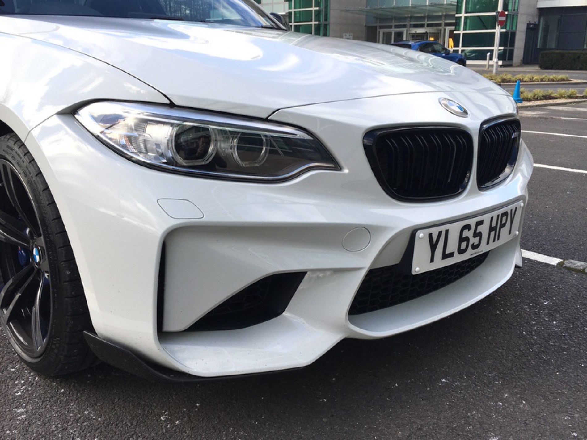 From the UK comes the first BMW M2 in Alpine White and with the M Performance Parts. The car spotted features the front and side sill attachments that have been aerodynamically optimized. The M Performance Parts kidney grille and mirror caps – in all-black – are also installed on this demo car.