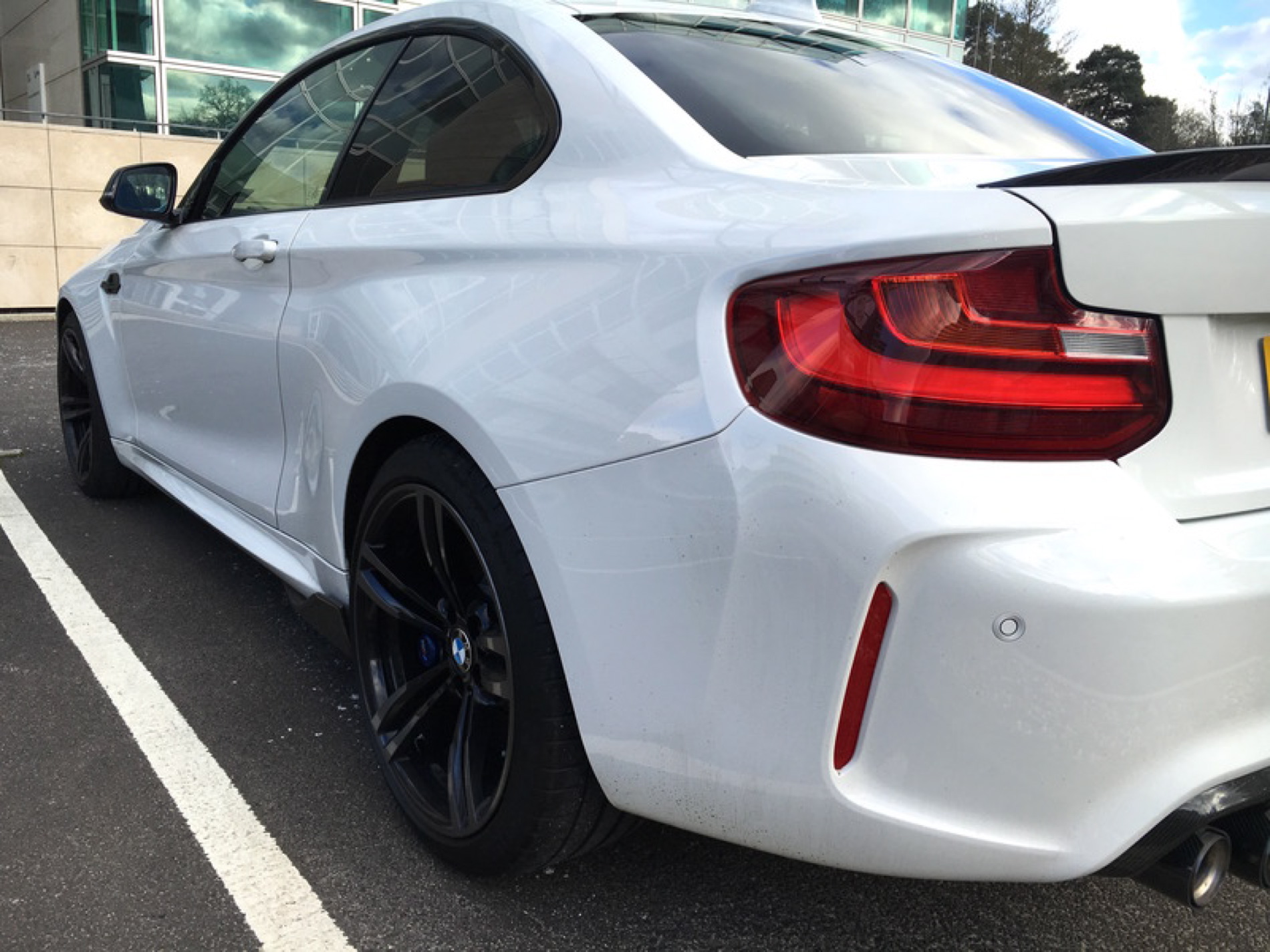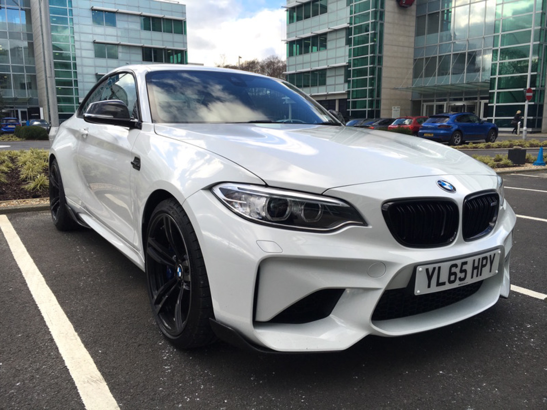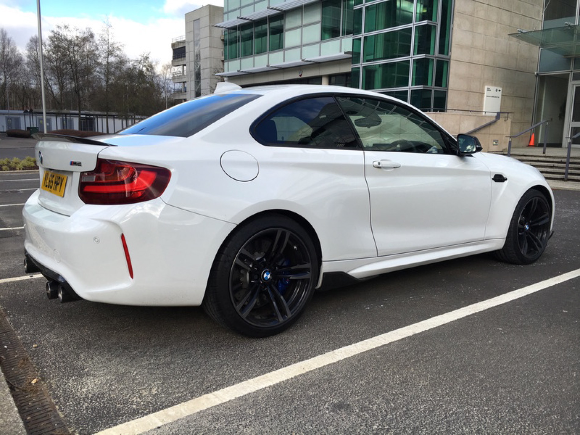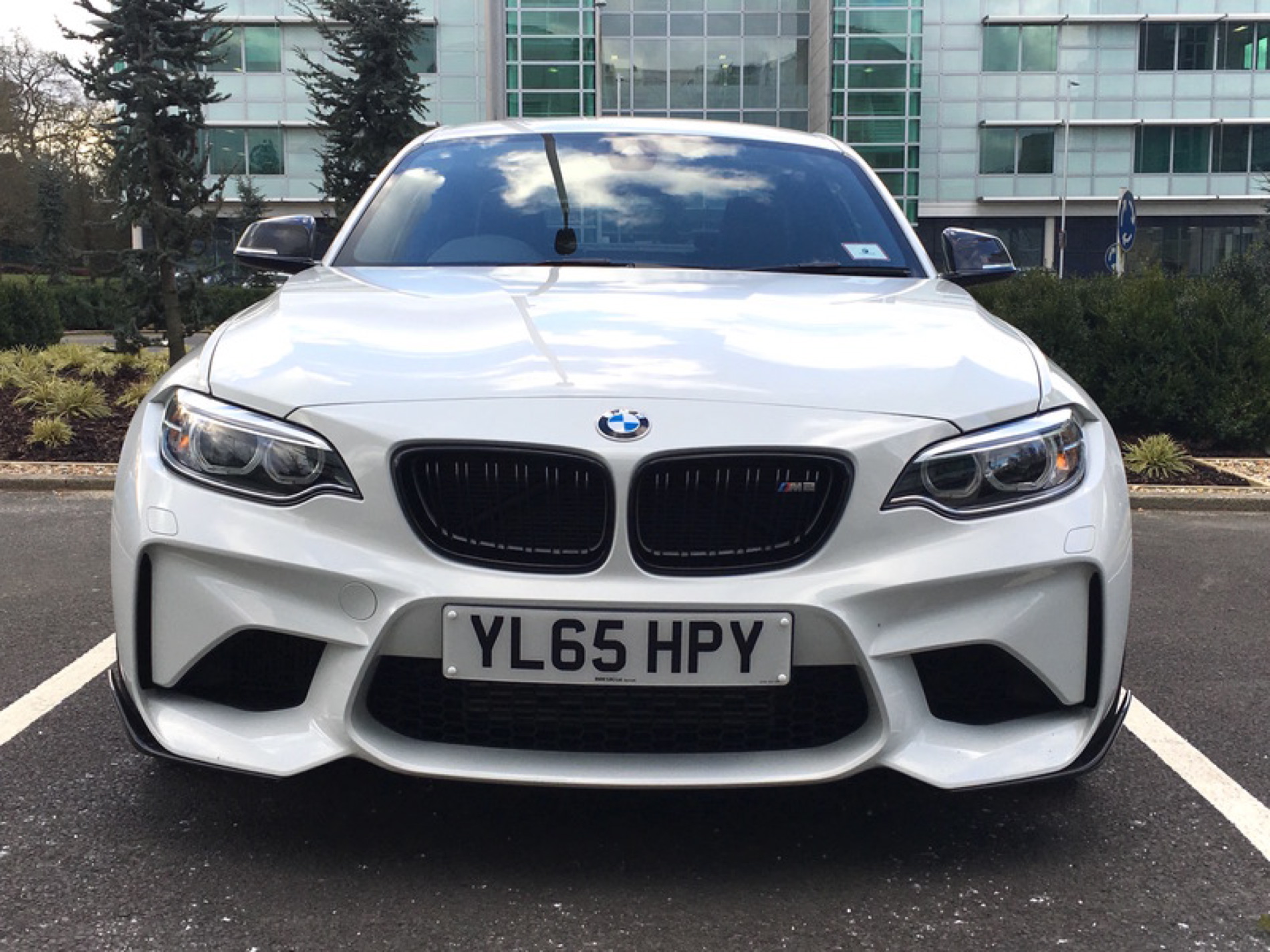 From the UK comes the first BMW M2 in Alpine White and with the M Performance Parts. The car spotted features the front and side sill attachments that have been aerodynamically optimized. The M Performance Parts kidney grille and mirror caps – in all-black – are also installed on this demo car.