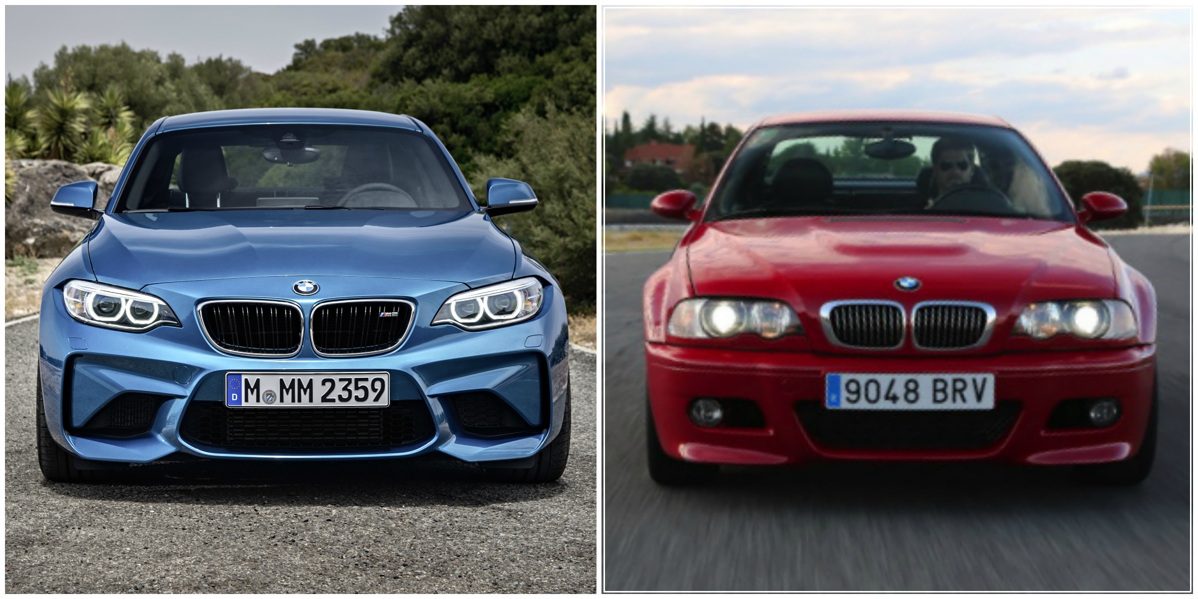 The BMW M2 uses a 3.0 liter turbocharged I6 engine, that develops 365 hp and 369 lb-ft of torque, while the E46 used a 3.2 liter naturally-aspirated I6 engine, that made 333 hp and 262 lb-ft of torque. Both cars actually weight about the same, 3,400 lbs give or take some options, which gives the M2 a better power-to-weight advantage. But both cars are at around the same level of power and performance for their respective times.