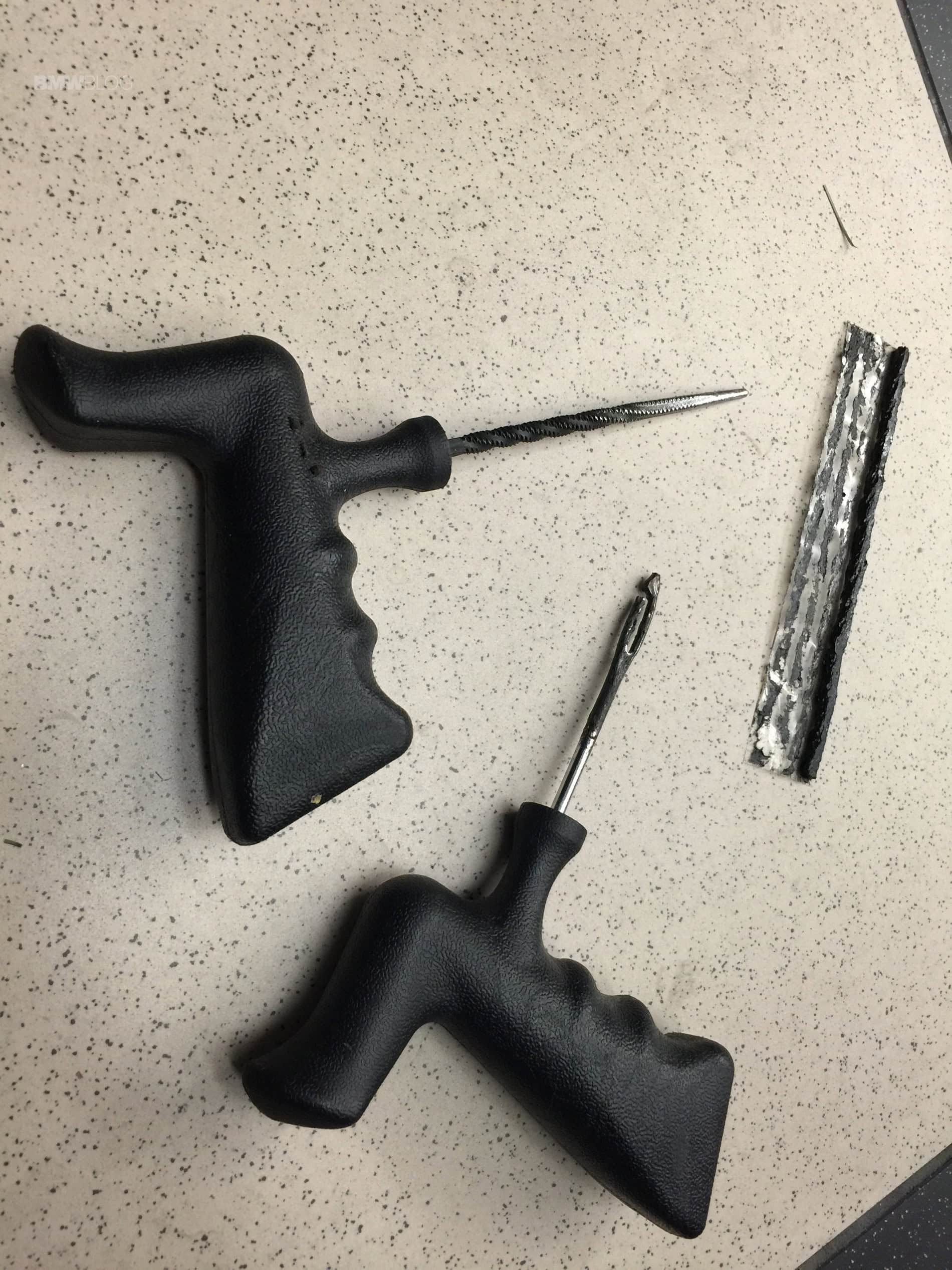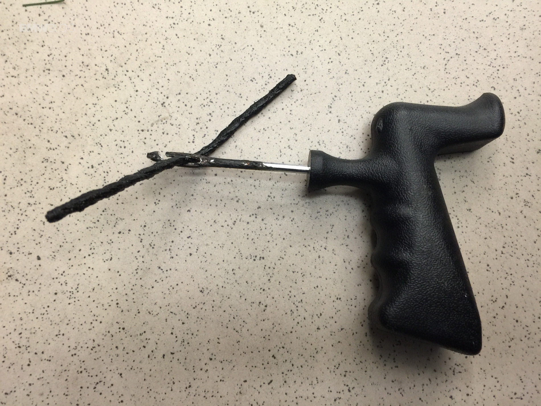 Sure enough, air immediately starts hissing out the hole. Next I grabbed the burr tool which sets a standard diameter for the plug through the tire tread. This tapered rasp does require some force to ream it in and out of the tire. Next, I grabbed a sticky string like plug, put it in the needle like tool and shoved it in. Somehow, it disengages when you are pulling the needle back out of the tire. Trim the extra off the plug that hangs out and fill the tire back up with air.