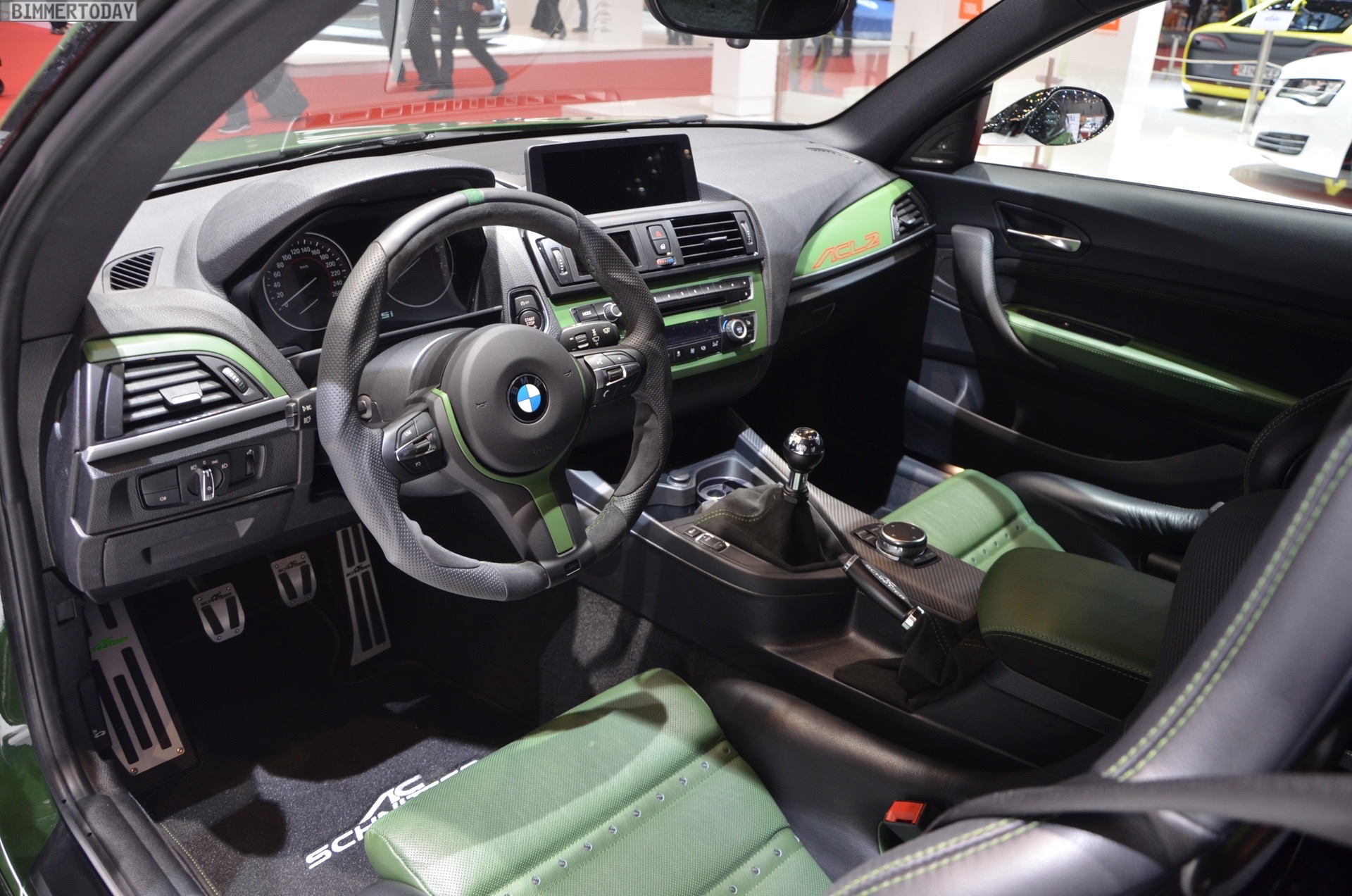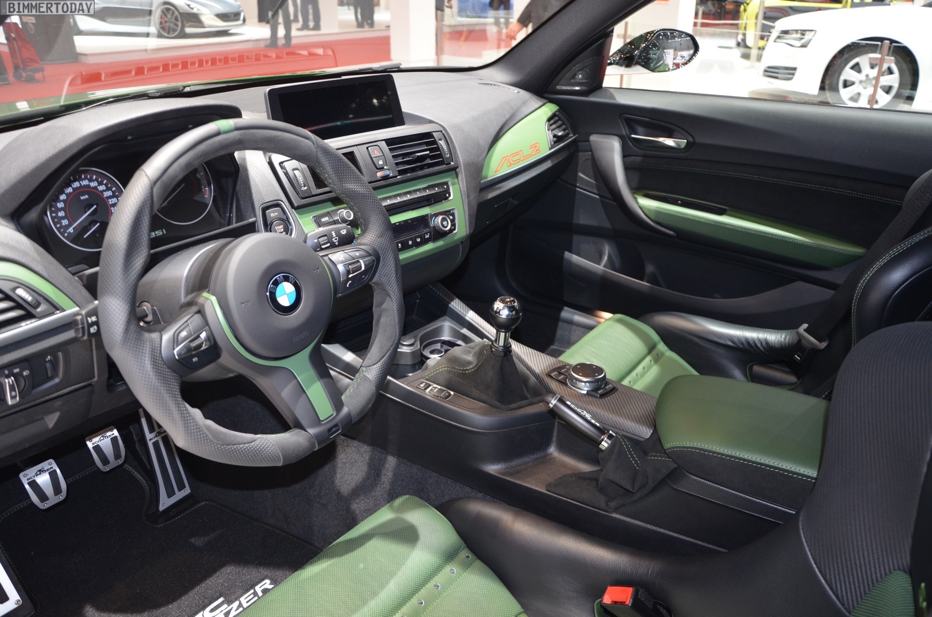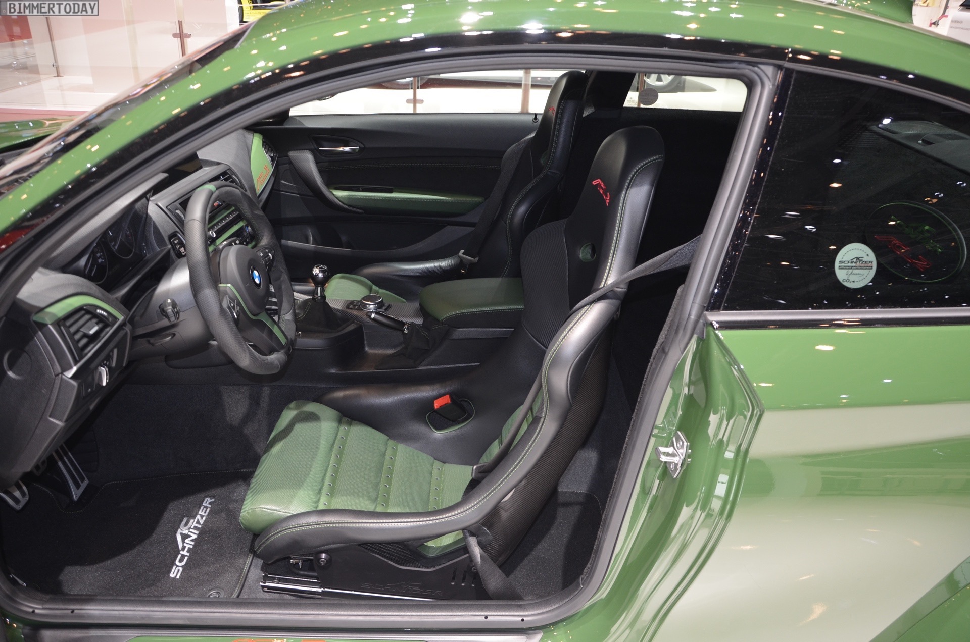 Inside we can find the typical AC Schnitzer badging, and also a set of new pedals, sports seats, gear knob, handbrake grip, and carbon fiber trim. The steering wheel is just as impressive as the rest of the car. Green has invaded the cabin, with green leather, green stitching over black suede and carbon bucket seats with green inserts.