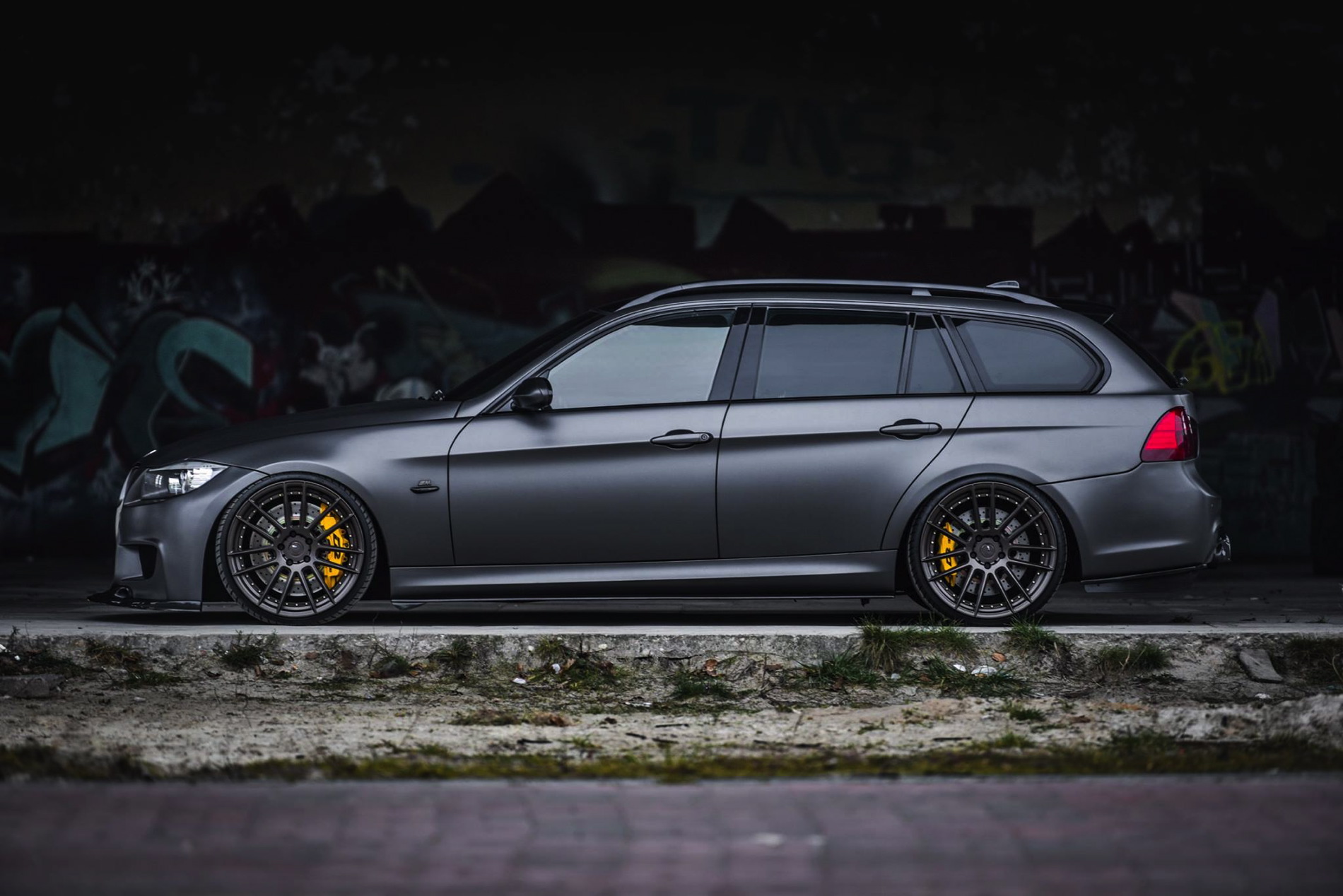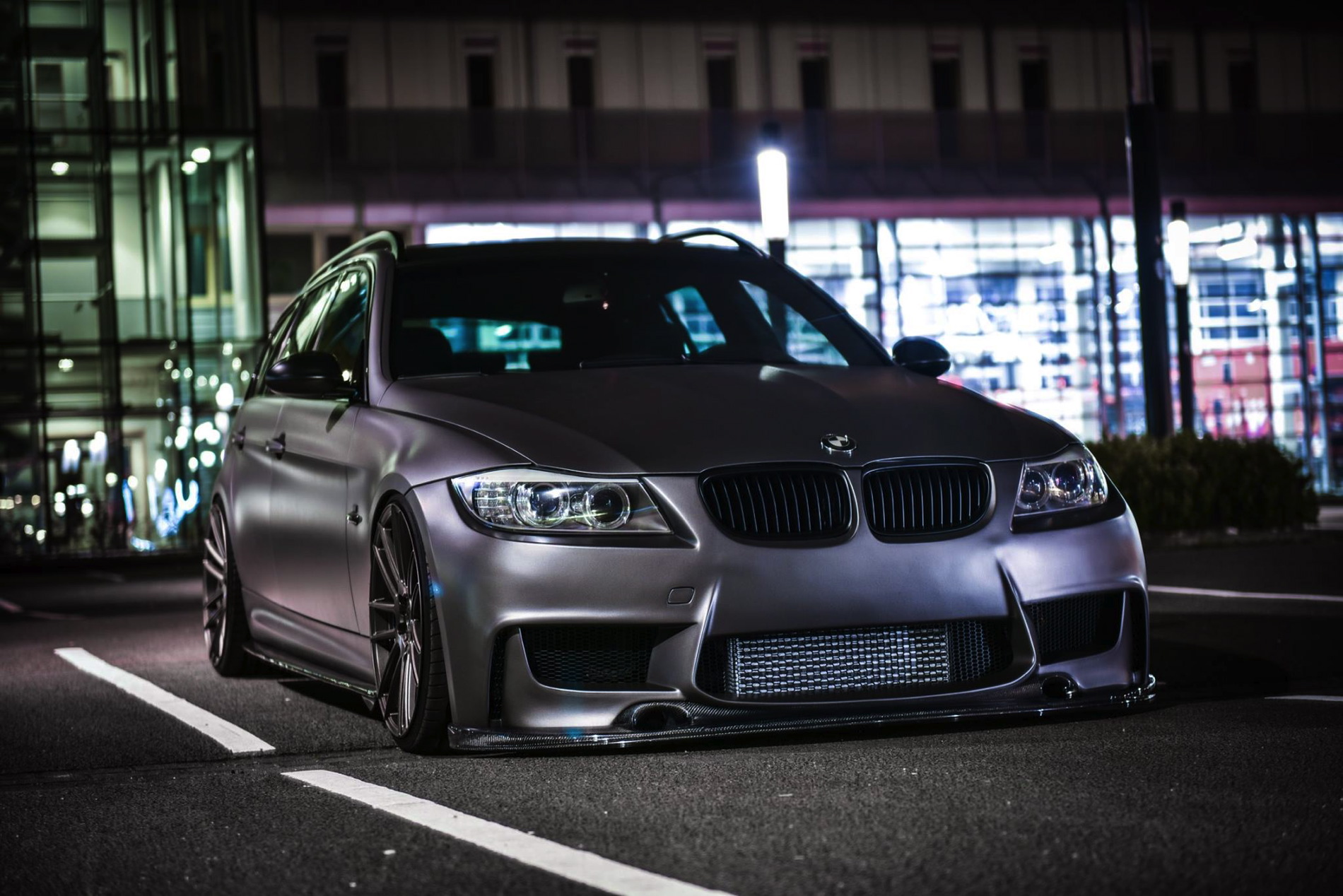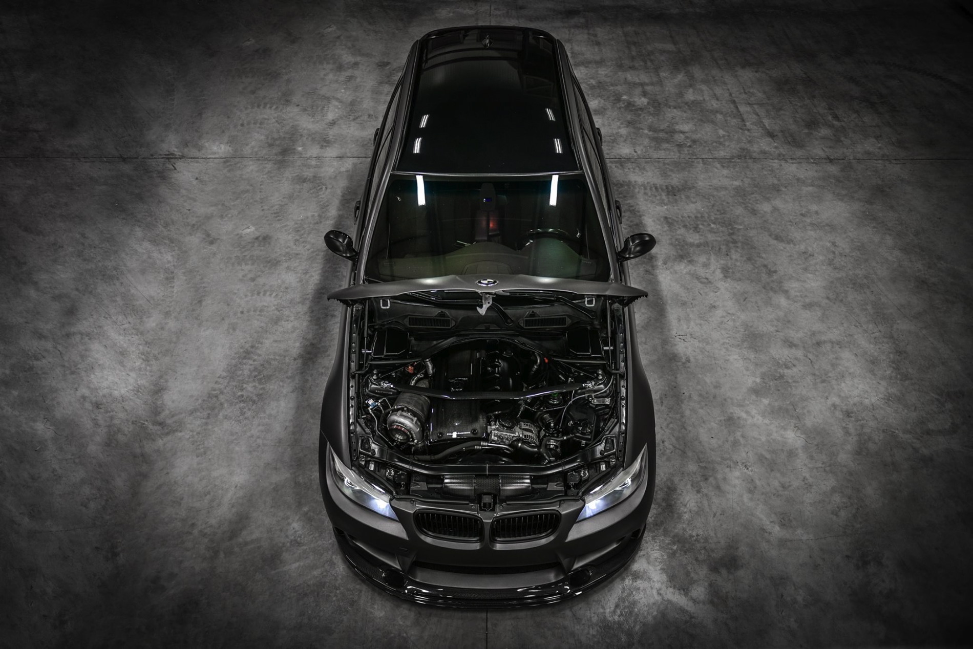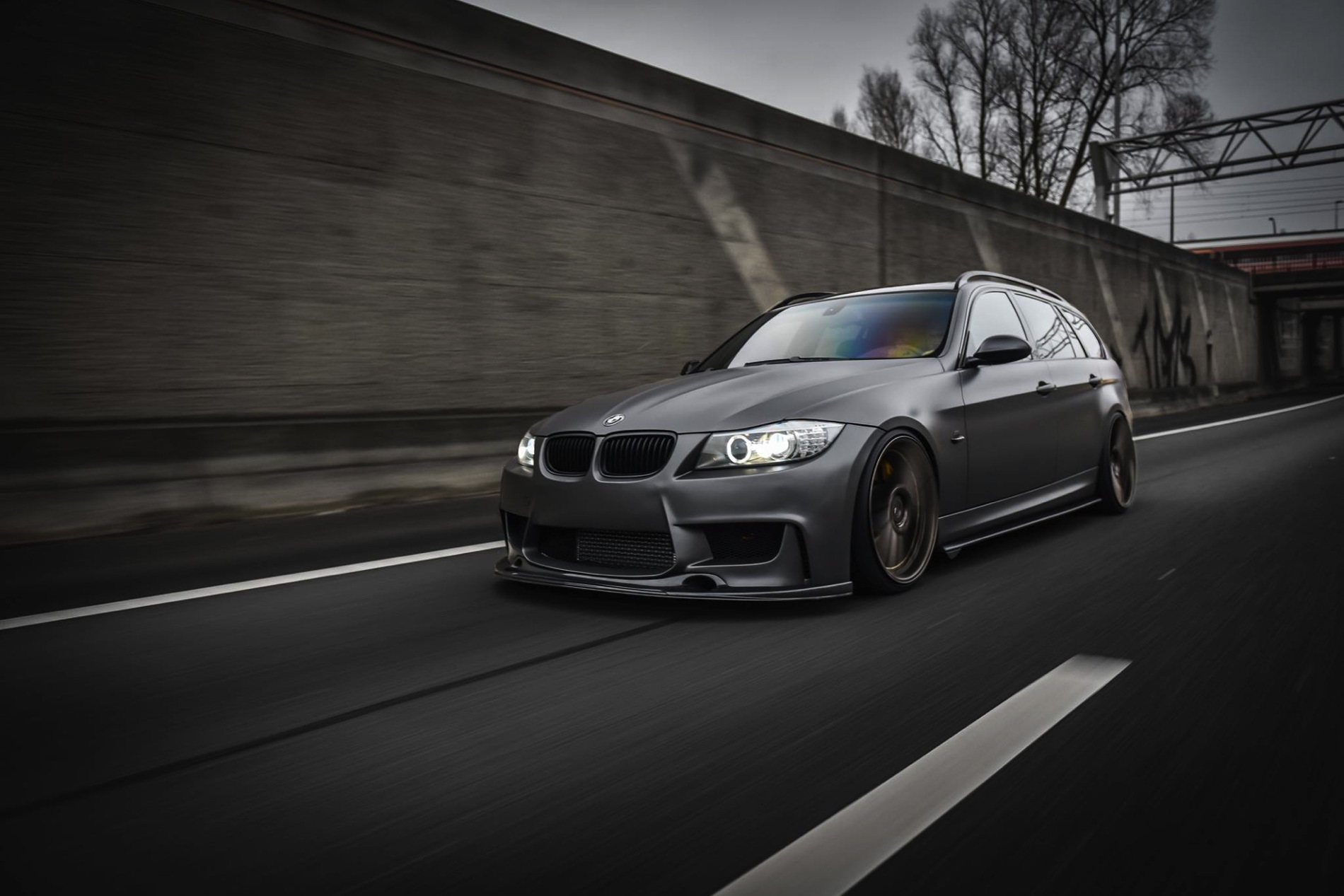 The exterior was wrapped with a matte gray vinyl which perfectly matches the colored bronze alloy wheels in 20 inches made ADV1. Wheels. The front-end gets a 1M bodykit with massive air curtains, while the carbon fiber splitter adds to the sportiness of the car. Carbon fiber side skirts and a rear diffuser are just some of the carbon fiber additions to the car.