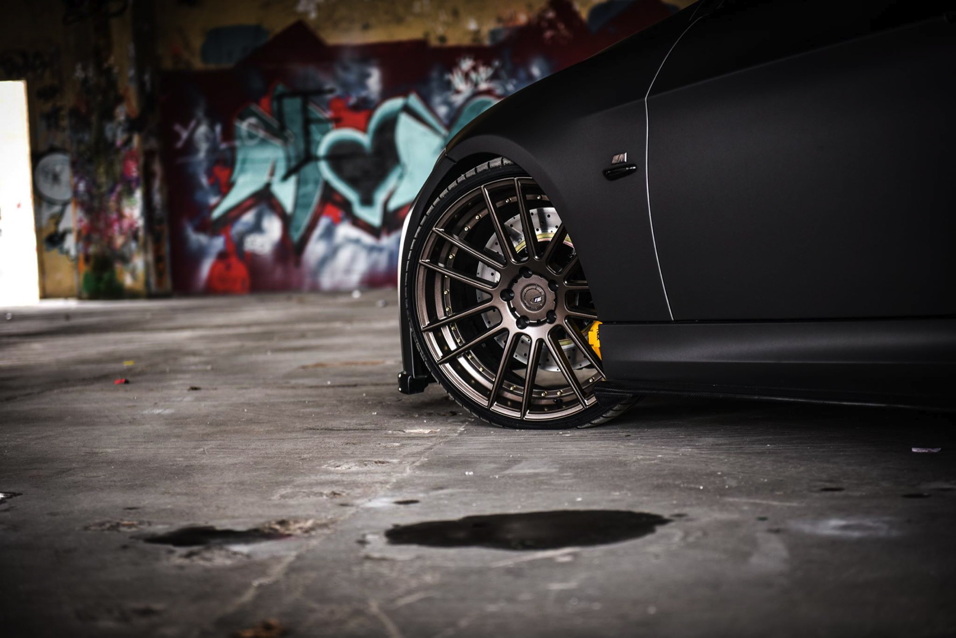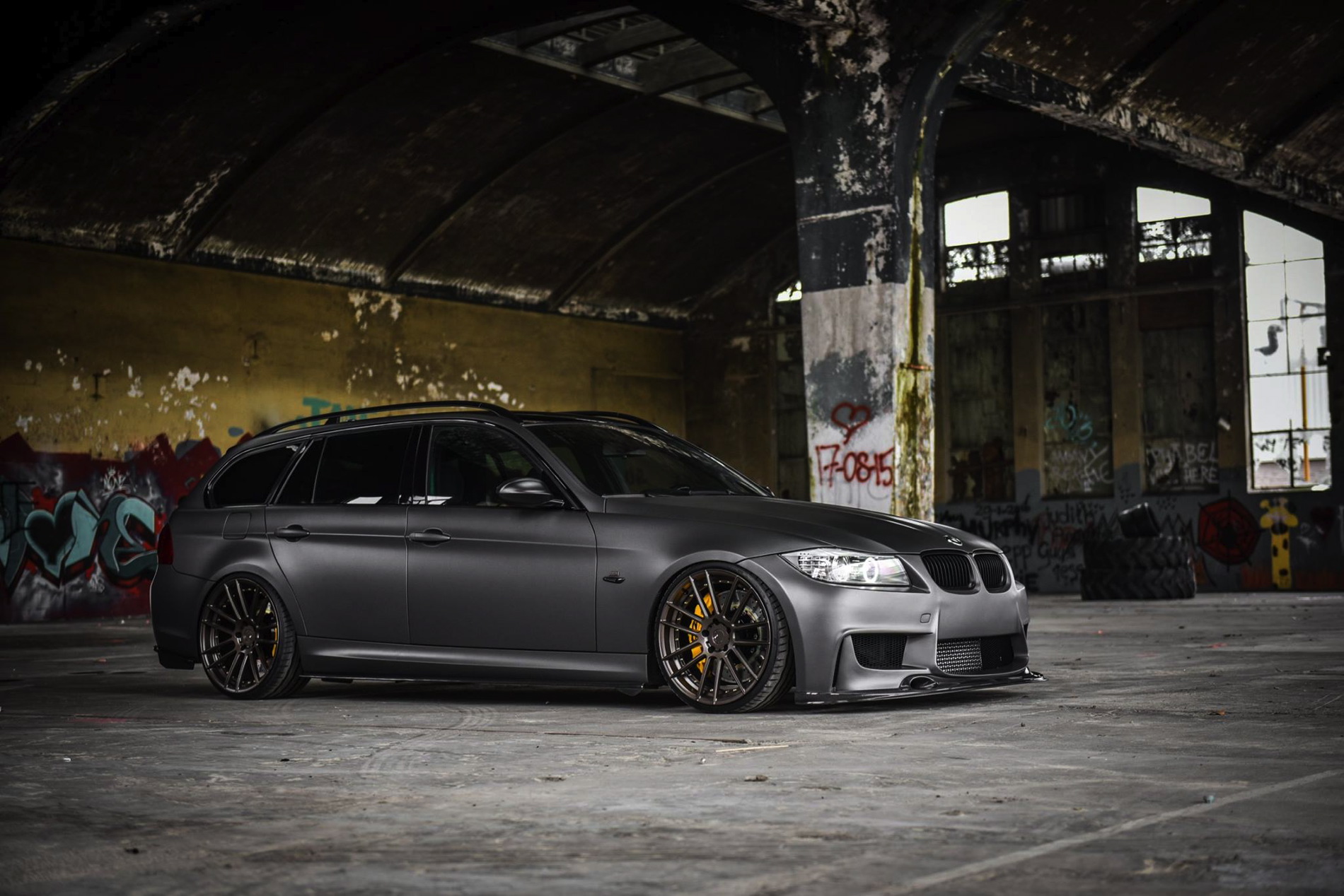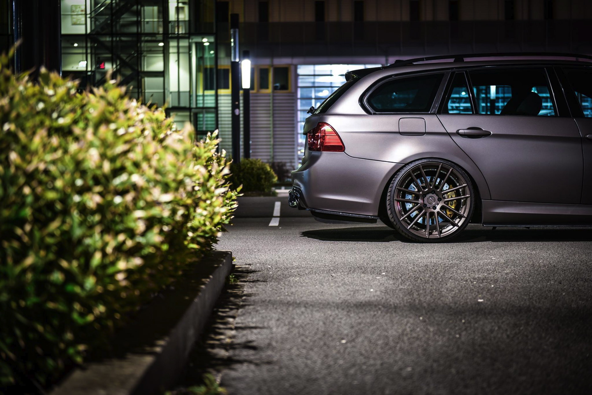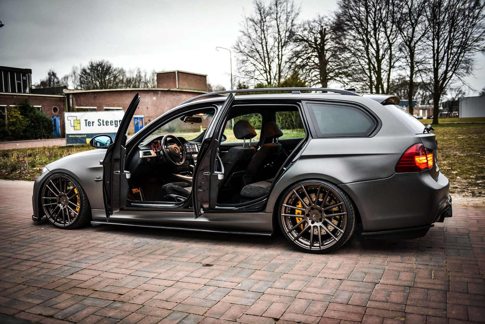 The exterior was wrapped with a matte gray vinyl which perfectly matches the colored bronze alloy wheels in 20 inches made ADV1. Wheels. The front-end gets a 1M bodykit with massive air curtains, while the carbon fiber splitter adds to the sportiness of the car. Carbon fiber side skirts and a rear diffuser are just some of the carbon fiber additions to the car.