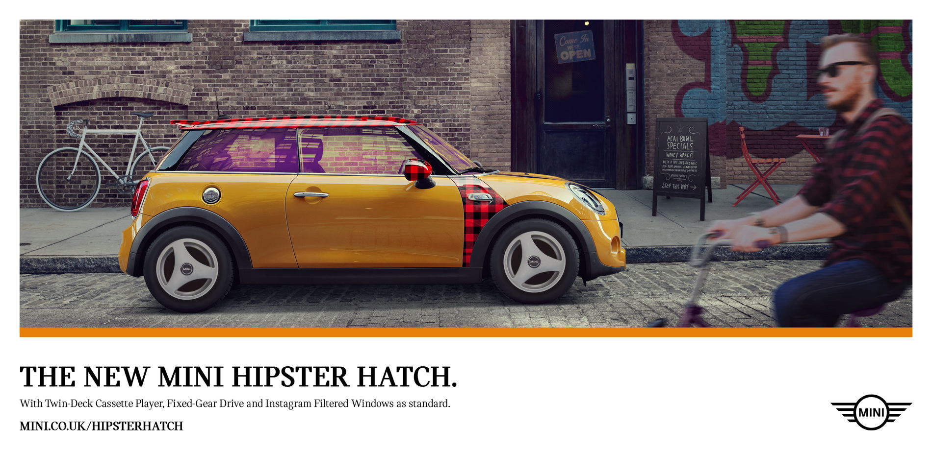 The new MINI Hipster Hatch has just one forward gear with a maximum speed of 25 mph. Taking inspiration from the ‘Fixie’ pedal bike, four of the forward gears have been removed to give the driver a greater feeling of control when popping out for a superfood smoothie.