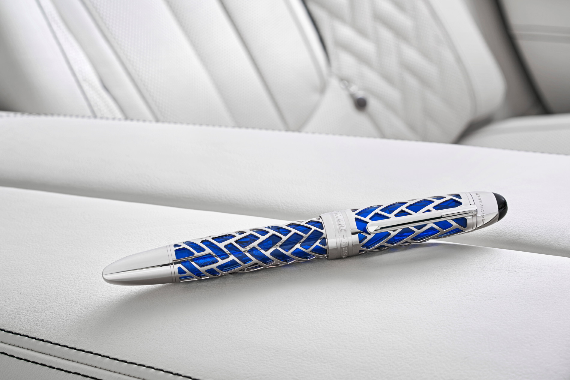 The unmistakable Montblanc icon, the Montblanc Meisterstück, comes with BMW design elements of the new Individual series: The surface structure of the Meisterstück Skeleton Fountain Pen is reminiscent of the quilted seat surfaces in a woven look featured by the BMW 7 Series centennial model. The transparent elements of the fountain pen come in the BMW Individual colour Centennial Blue metallic also chosen as the automobile’s exterior colour. The rhodium-plated, Au750 gold Montblanc nib bears an engraving of the unique backstitching also found on the BMW Individual Merino leather seats.