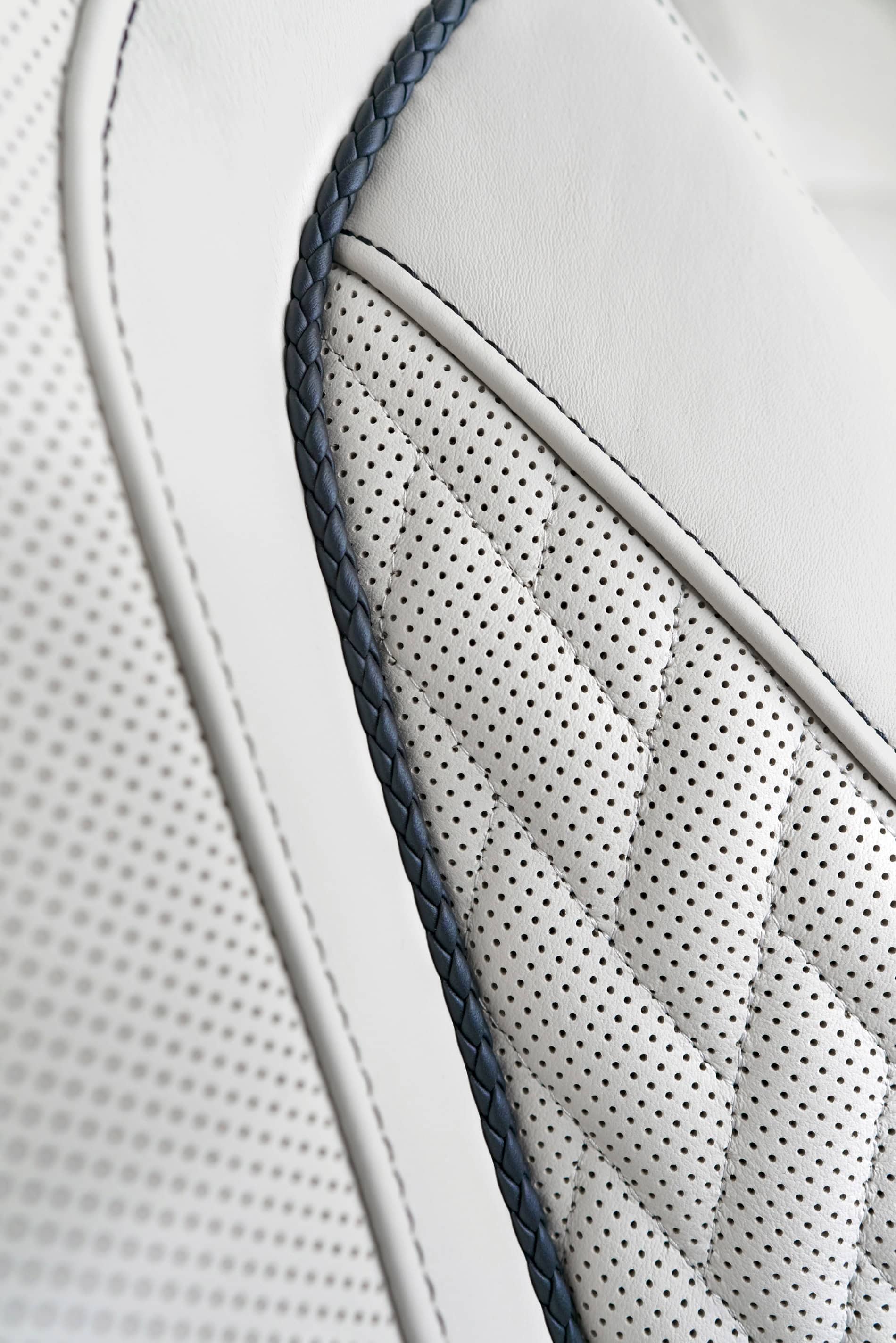 The luxurious driving experience and exclusive travel comfort offered by the “BMW Individual 7 Series THE NEXT 100 YEARS” achieve their extraordinary high level thanks to an interior design that is oriented to the highest standards right down to the smallest detail. The BMW Individual fine-grain Merino full leather trim in the colour variant “Smoke White” with black accents is the central element. The leather used for the seats, door panels including B pillars, the upper and lower sections of the instrument panel, the centre console, armrests and door pulls is extremely pleasant to the touch thanks to its volume and soft, fine-grain surfaces. Carefully selected, flawless raw materials and extremely gentle processing guarantee a natural, open-pore structure. The leather remains breathable and provides supreme comfort. Quilted seat surfaces in a woven look, hand-woven piping and contrasting seam applications bear witness to a production process that is defined by precision and attention to detail. Floor covering and floor mats, safety belts and the BMW Individual headliner also come in Alcantara in the colour “Smoke White”. The stylish interior ambience of the centennial model is capped by BMW Individual interior strips in Piano Finish Black and a BMW Individual leather steering wheel with fine-wood applications in the same finish.