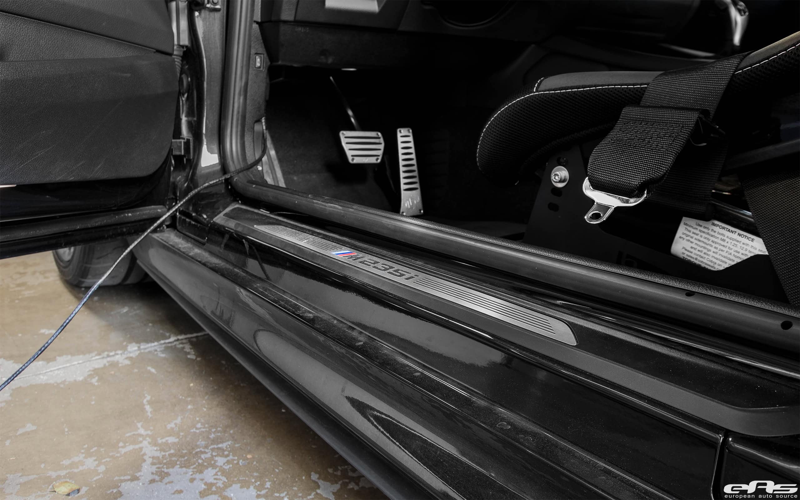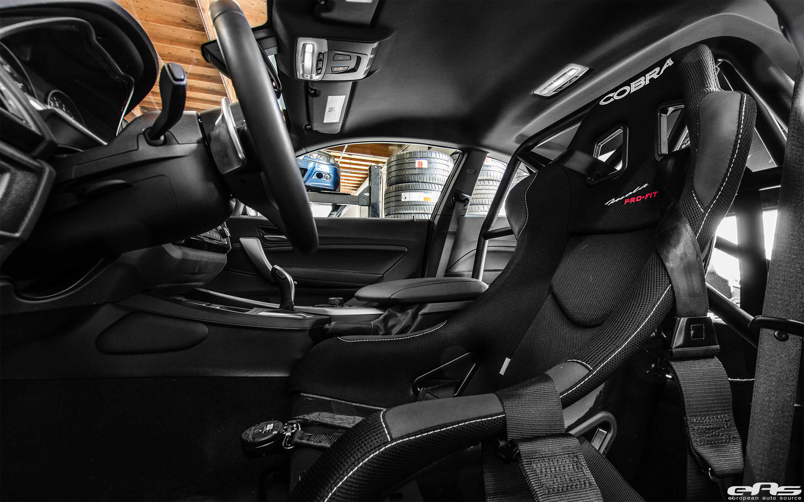 The M235i does fall short of the whopping 335 horsepower at the wheels of the M2, so European Auto Source turned to weight reduction as a performance multiplier on this build. First the complete interior was stripped down and the lightweight Cobra Imola Pro-Fit race seat was added. The removal of the passenger side seat, allows for excess weight to be shed and give the M235i seen here better overall cornering and straight line performance speed.
