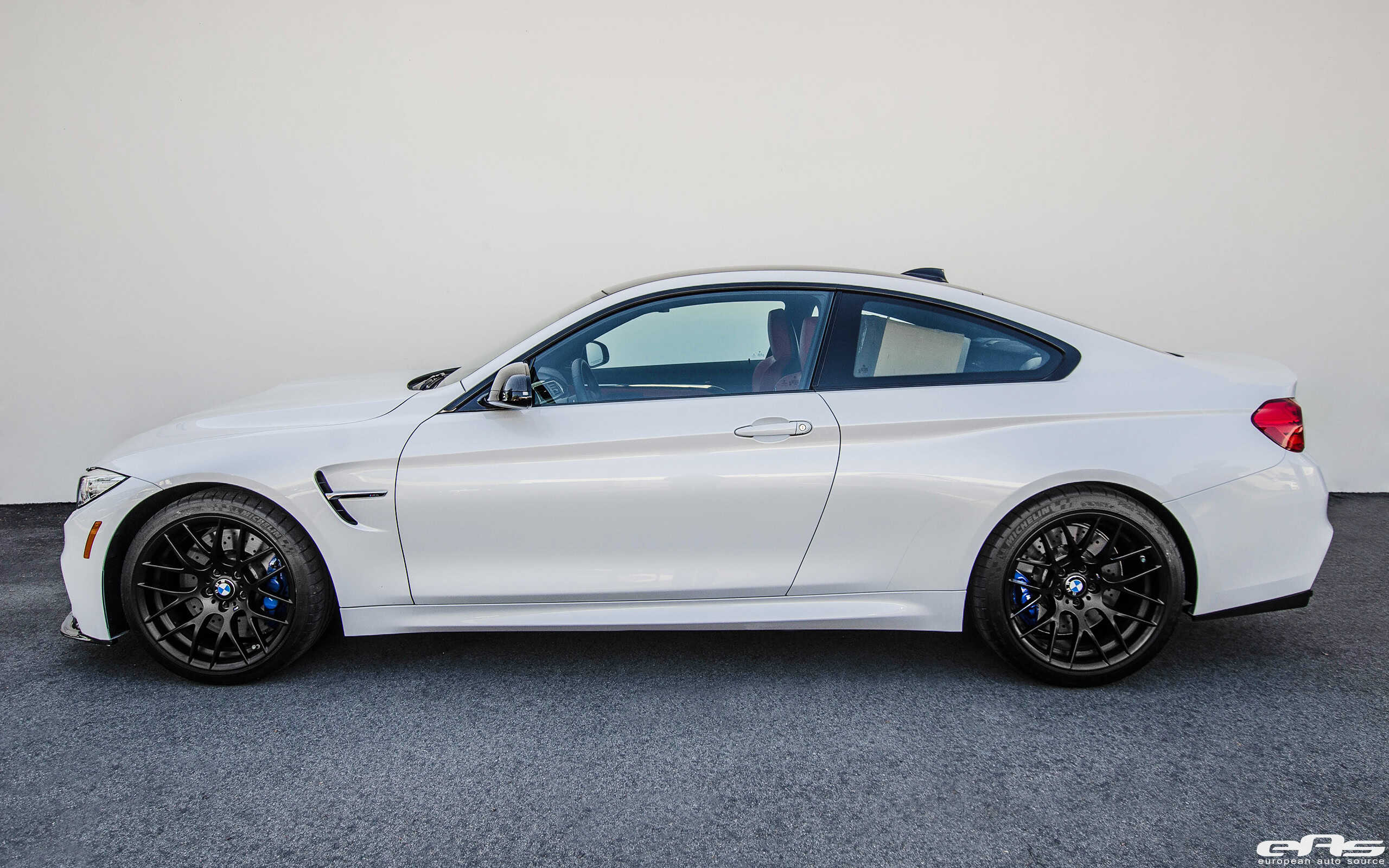 The BMW F82 M4 seen here is upgraded with the aforementioned BMW Competition Wheels sized 19×9 in the front and 19×10 in the rear. While the fitment isn’t as near as perfect on the new M4’s, the similarity in fitment/weight for the new model, makes them an interesting upgrade – these weigh in at only 24lbs front and 25.5lbs rear per wheel. The Gloss Black finish applied makes them a perfect contrasting addition to the Alpine White.