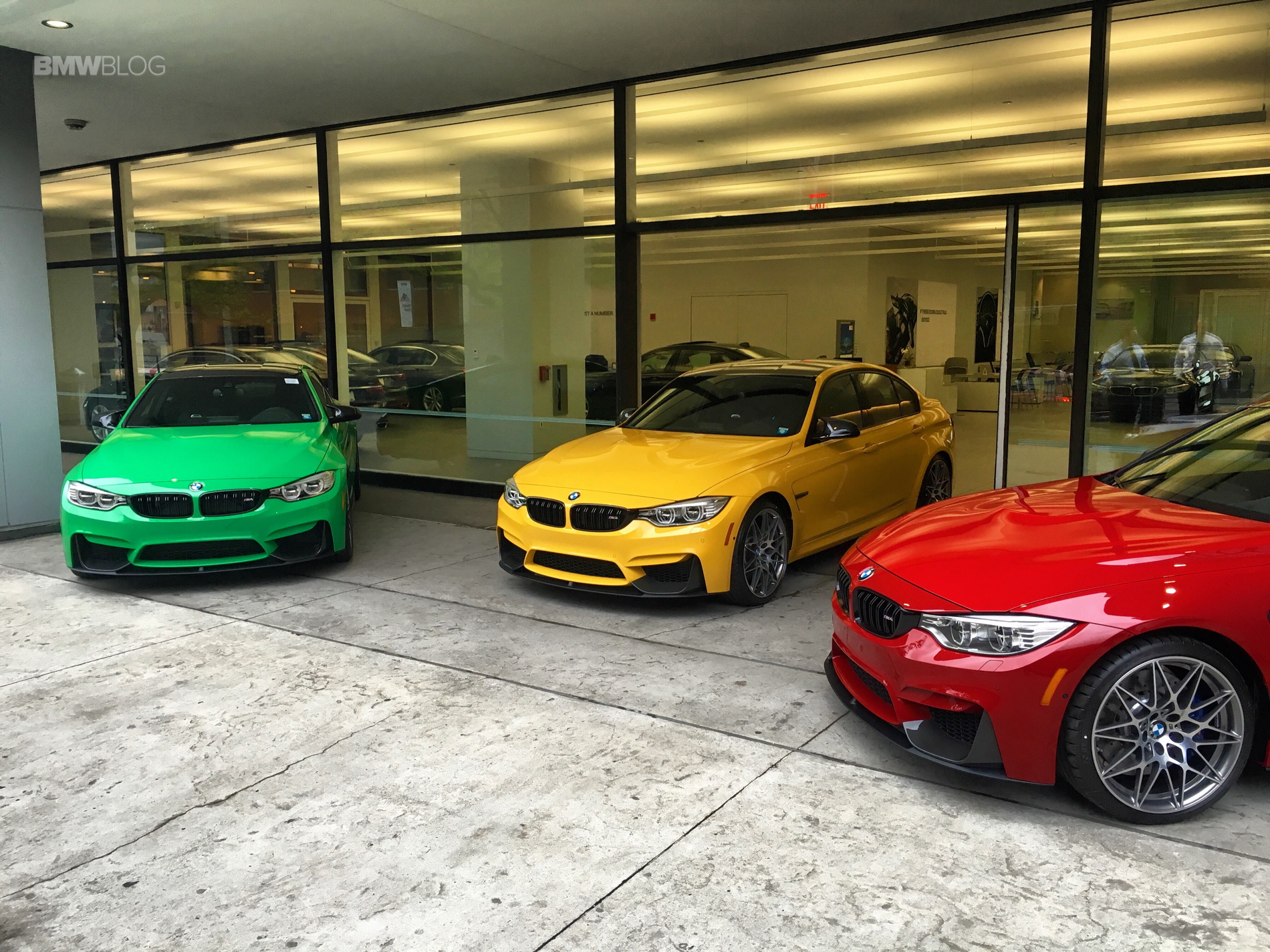 There are two BMW M4s and one BMW M3, all equipped with the Competition Package, all option packages, full leather and DCT gearboxes. They also all have carbon fiber front splitters, mirror caps and rear diffusers, as well as BMW LED door projectors. The BMW M3 also comes with the M-Performance alcantara steering wheel. So all three cars are loaded with pretty much the same awesome options, making them all very similar. Except for their colors, obviously.