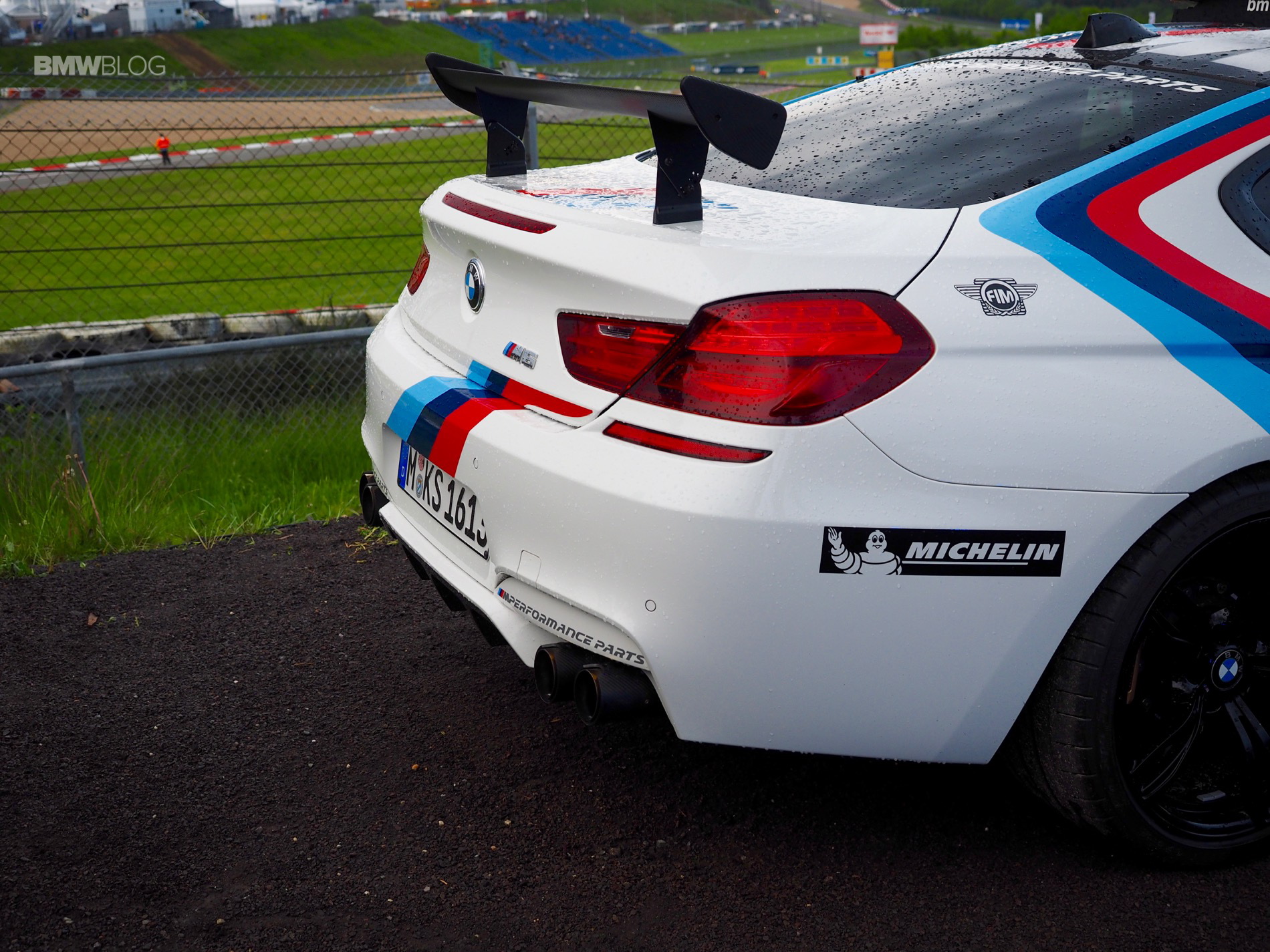 The BMW M6 Safety Car comes with a suite of carbon fiber parts, such as the front bumper lip, side mirrors and adjustable rear wing to provide the requisite downforce. Polycarbonate side and rear windows are included as well. Complementing the discreet spoiler lip on the boot lid there is now a rear wing.