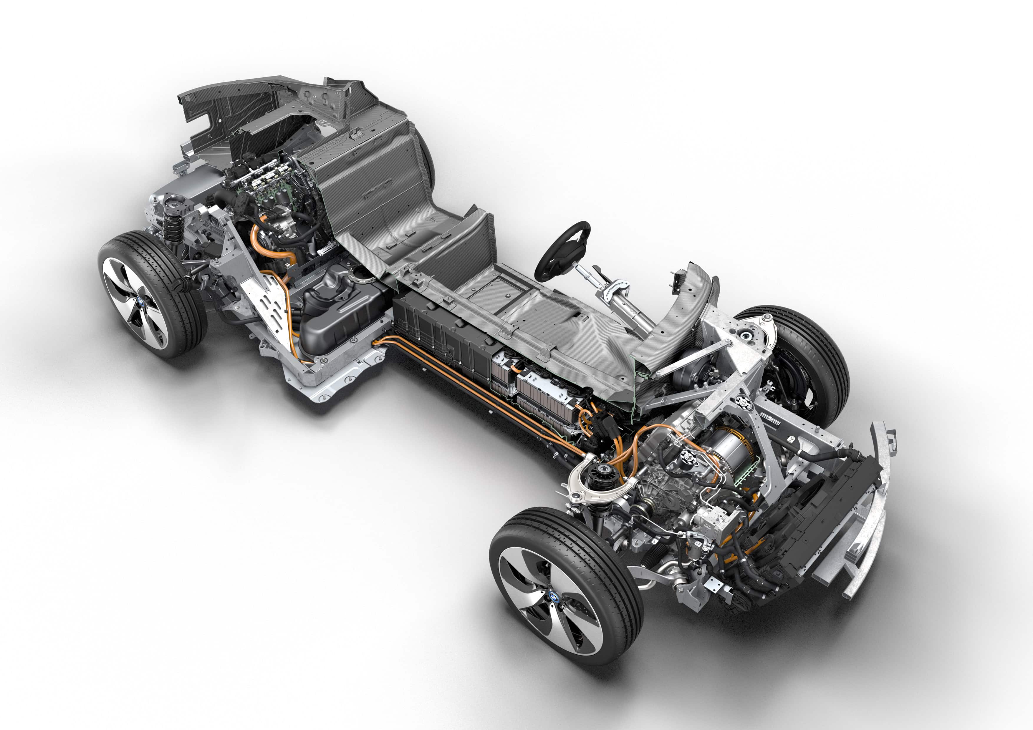 The plug-in hybrid drive system powering the BMW i8 combines the performance of a sports car with the fuel economy of a far smaller model. The three-cylinder combustion engine in the BMWÂ i8 develops 231Â hp and drives the rear wheels, while the 131Â hp electric motor draws its energy from a lithium-ion battery, which can be charged from a conventional domestic power socket and sends its power to the front axle.