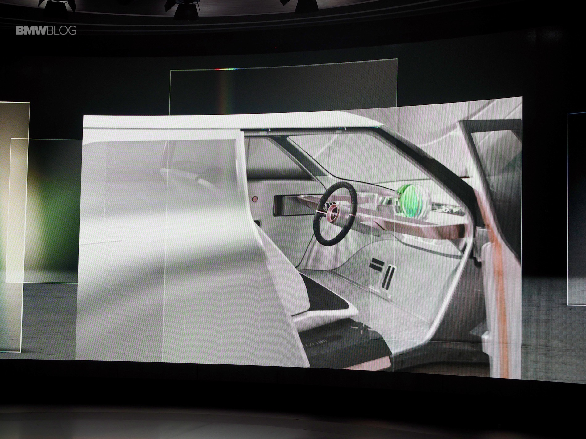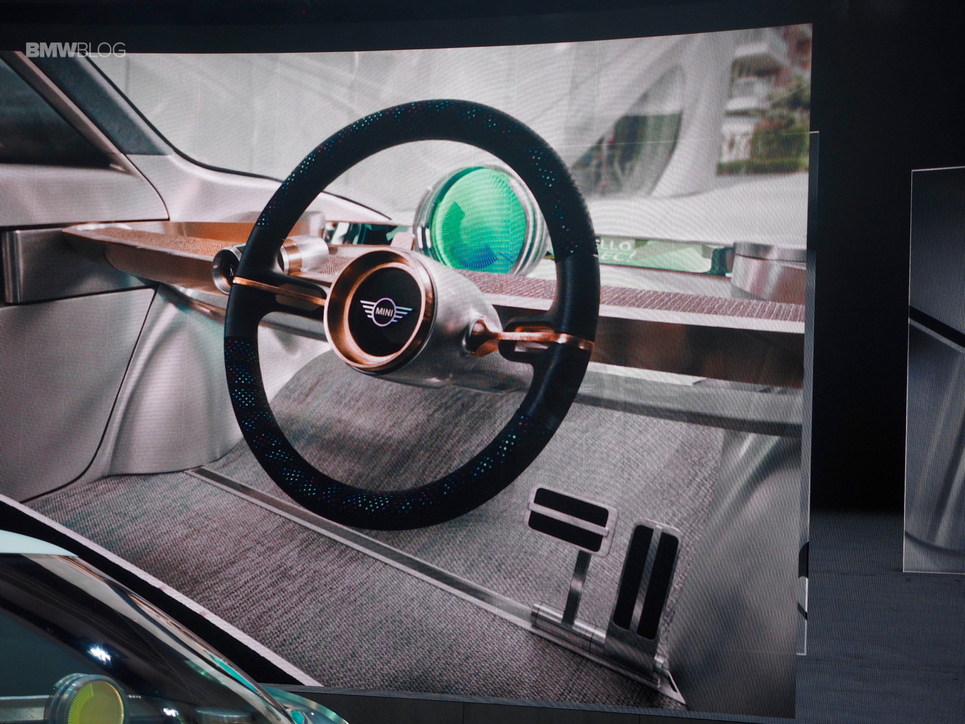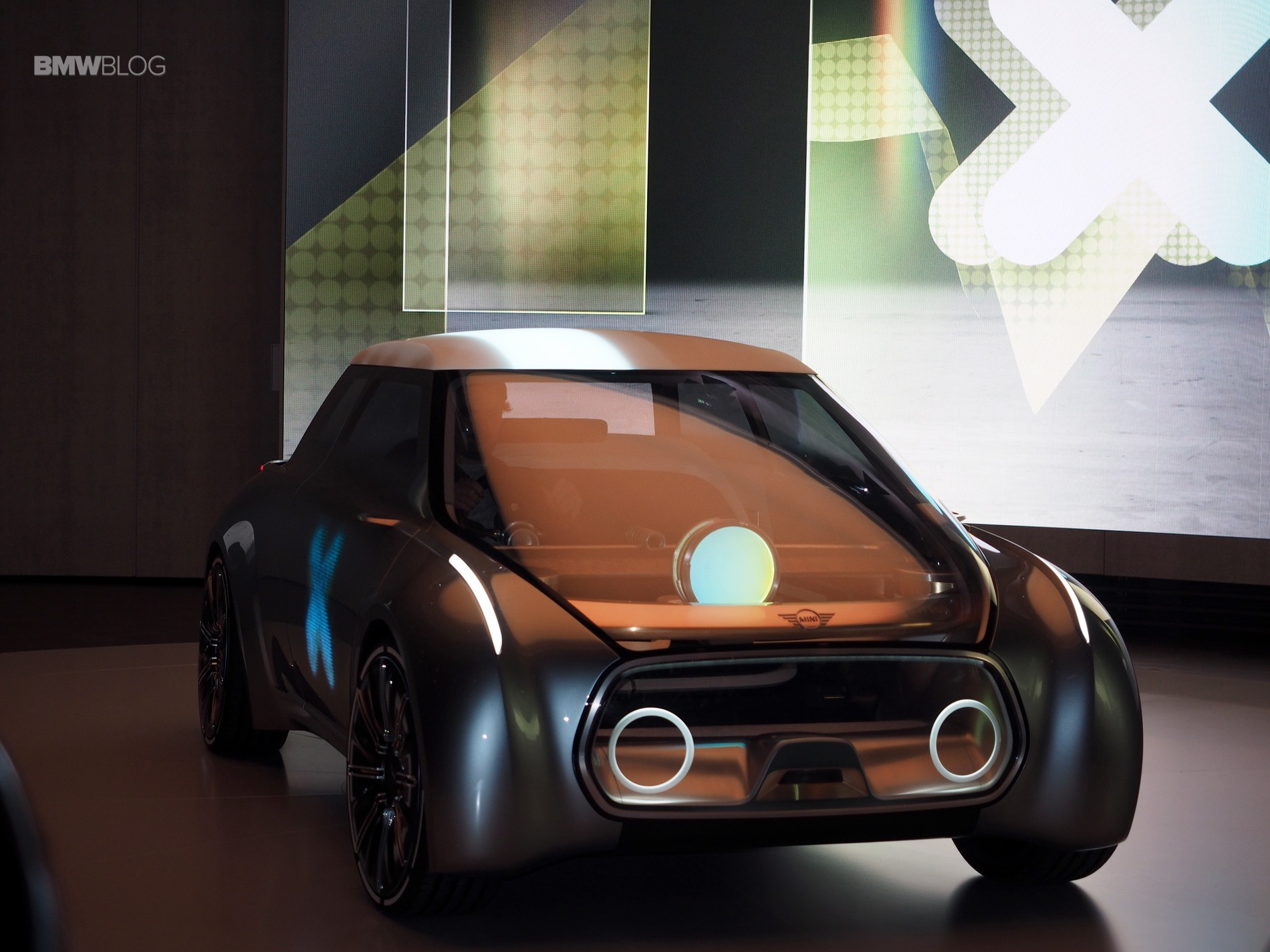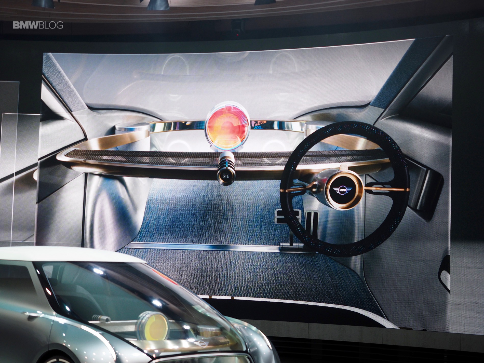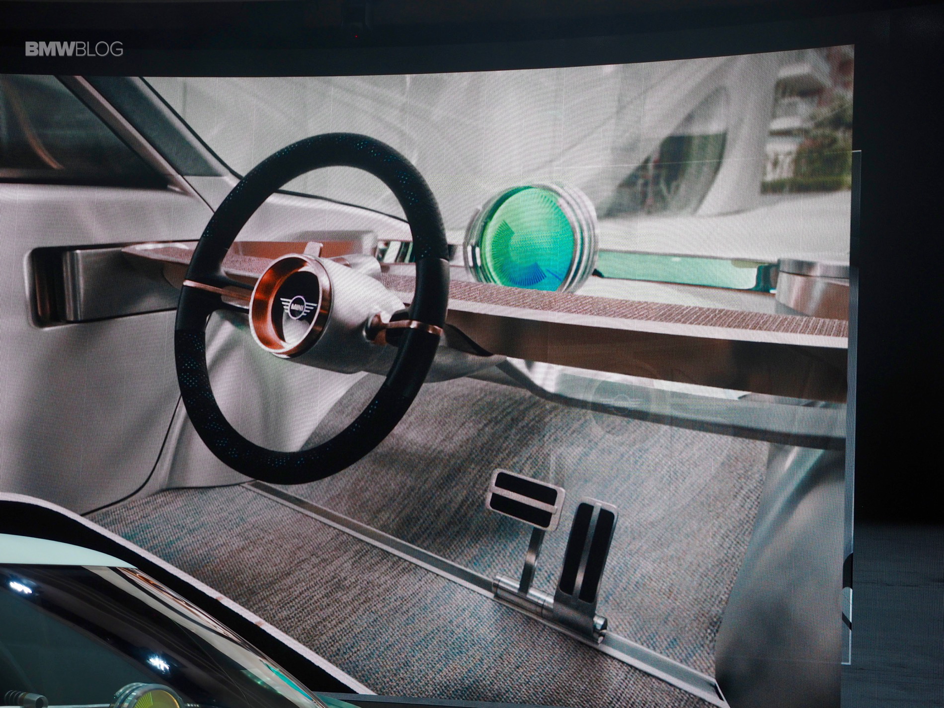 On the inside of this MINI Concept is a centrally-positioned circular instrument, similar to the center screen on current MINIs, called the “Cooperizer”. It changes color like a kaleidoscope, as the multi-faceted digital intelligence selects different personality, entertainment, communications and autonomous settings for the driver.
