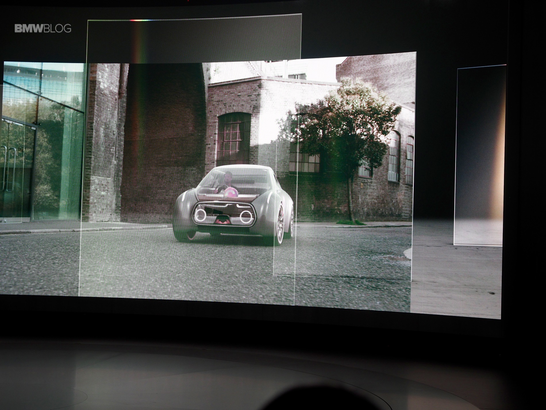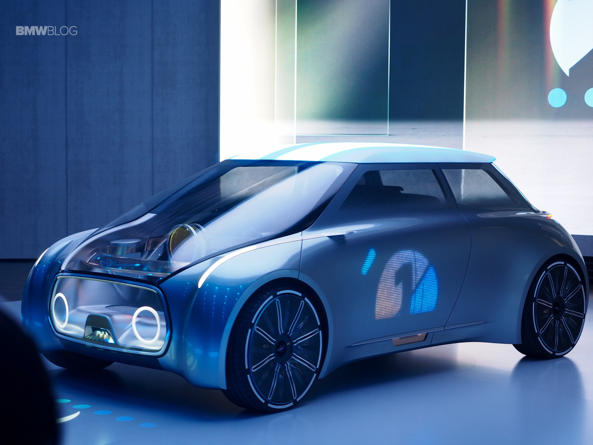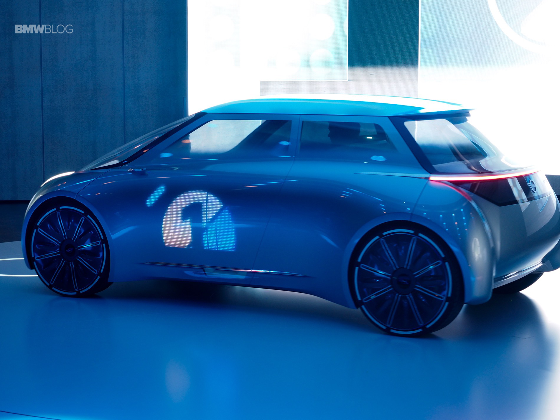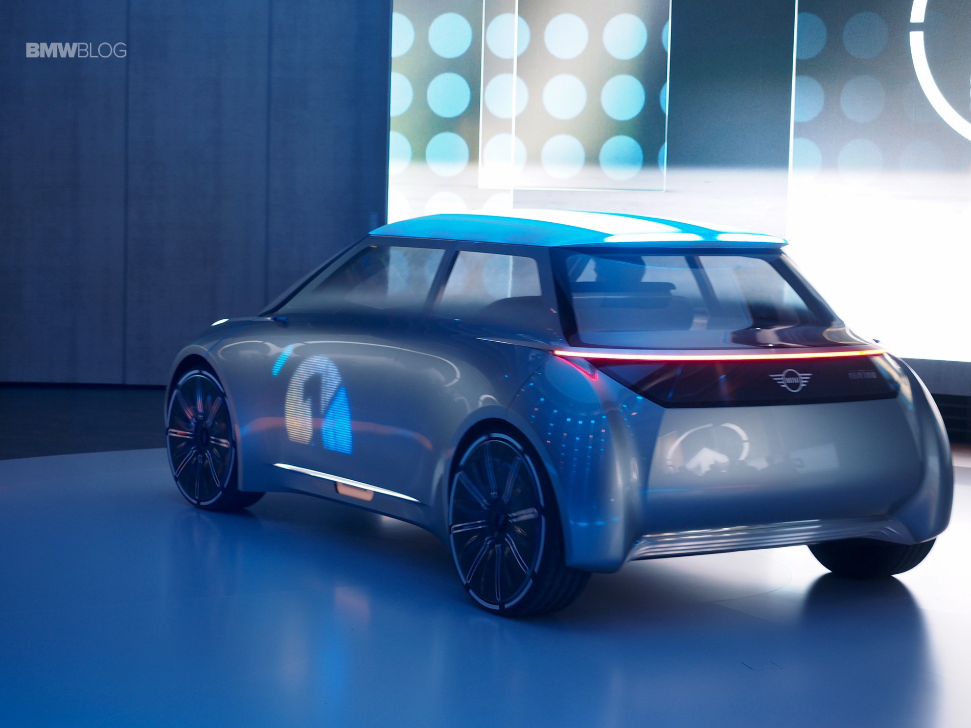 Similar to the other BMW Group Vision cars, a set of thin led lamps are embedded on the leading edge of the front fenders. From the rear, the futuristic MINI shows some prominent wheel houses, a high belt line floating roof and a full width LED tail lamps. The aggressive wheel arches emphasize the sporty spirit of a MINI.