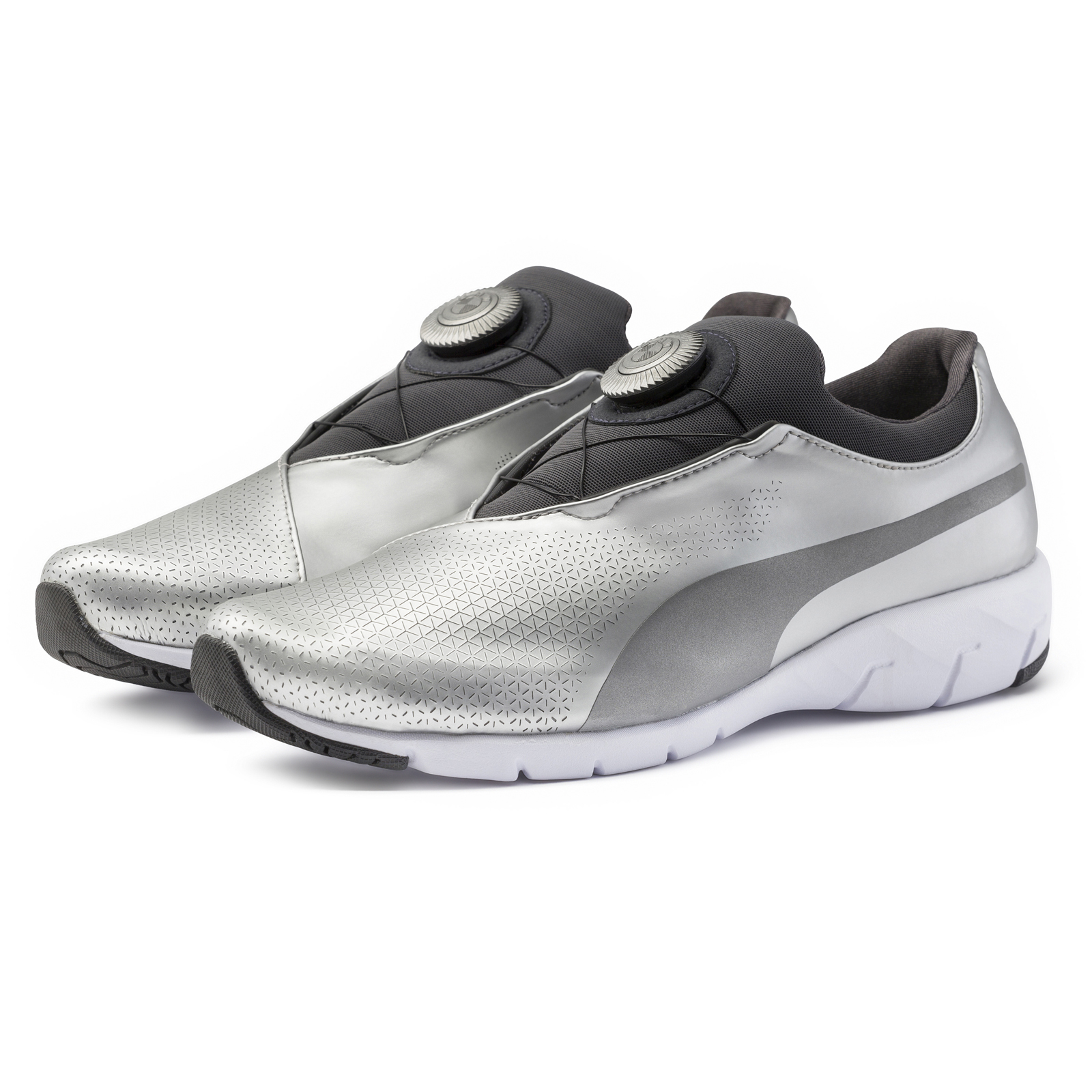 Developed with BMW’s Designworks, PUMA’s new BMW X-Cat Disc sneakers are the brand’s latest BMW-related design and probably the strangest. They look like sneakers someone aboard the USS Enterprise would wear on their day off.  With the outside of the sneaker made from a single piece of shiny metallic fabric, PUMA nailed the intended design, as it’s clearly based on the GINA. It also lacks laces and has a series of wires that run through the sneaker, under the skin just like the GINA. Those wires are tightened or loosened by the turn of a disc on the tongue of the shoe. The front of the sneaker also has a sort of pattern on it that’s similar to the new BMW Vision NEXT 100 Concept.